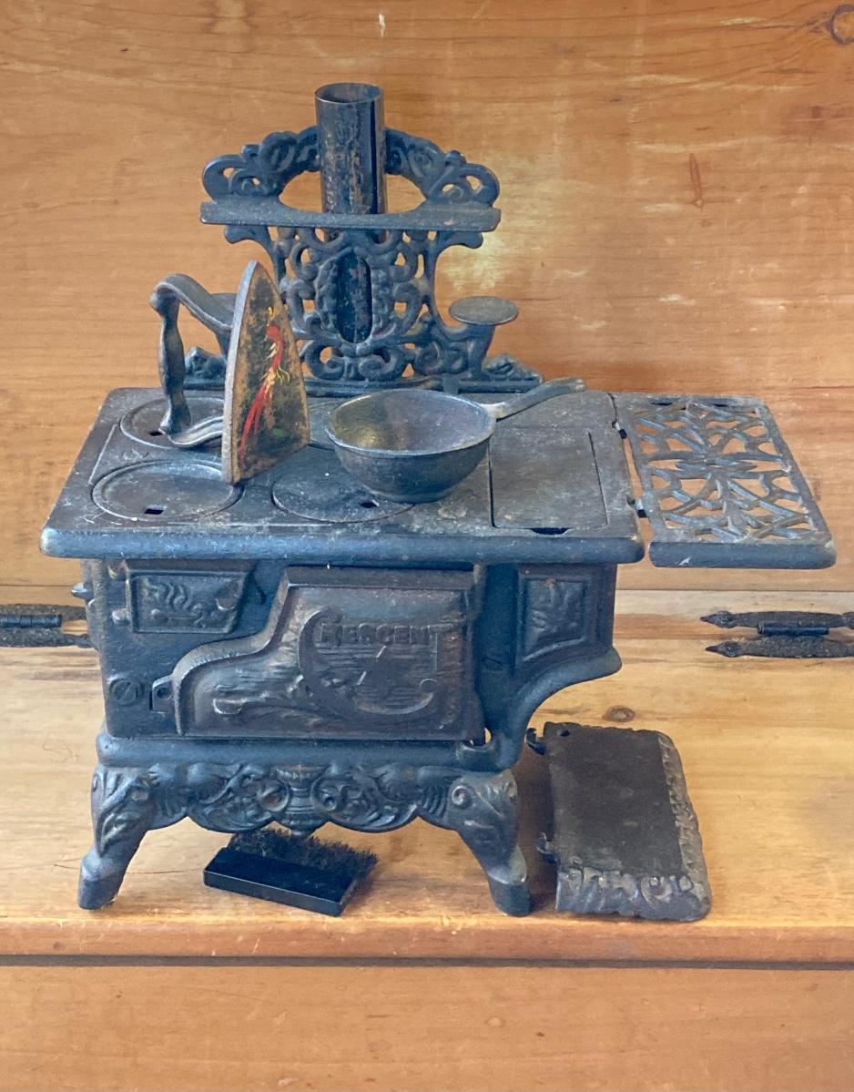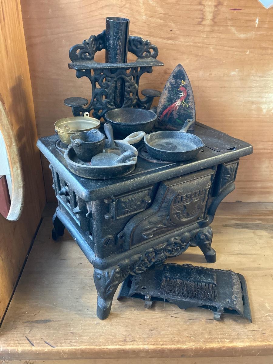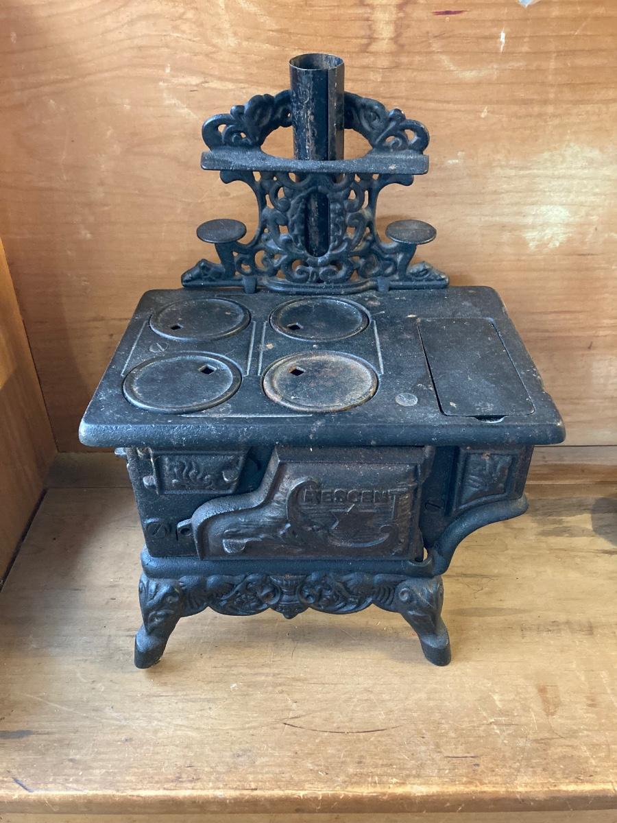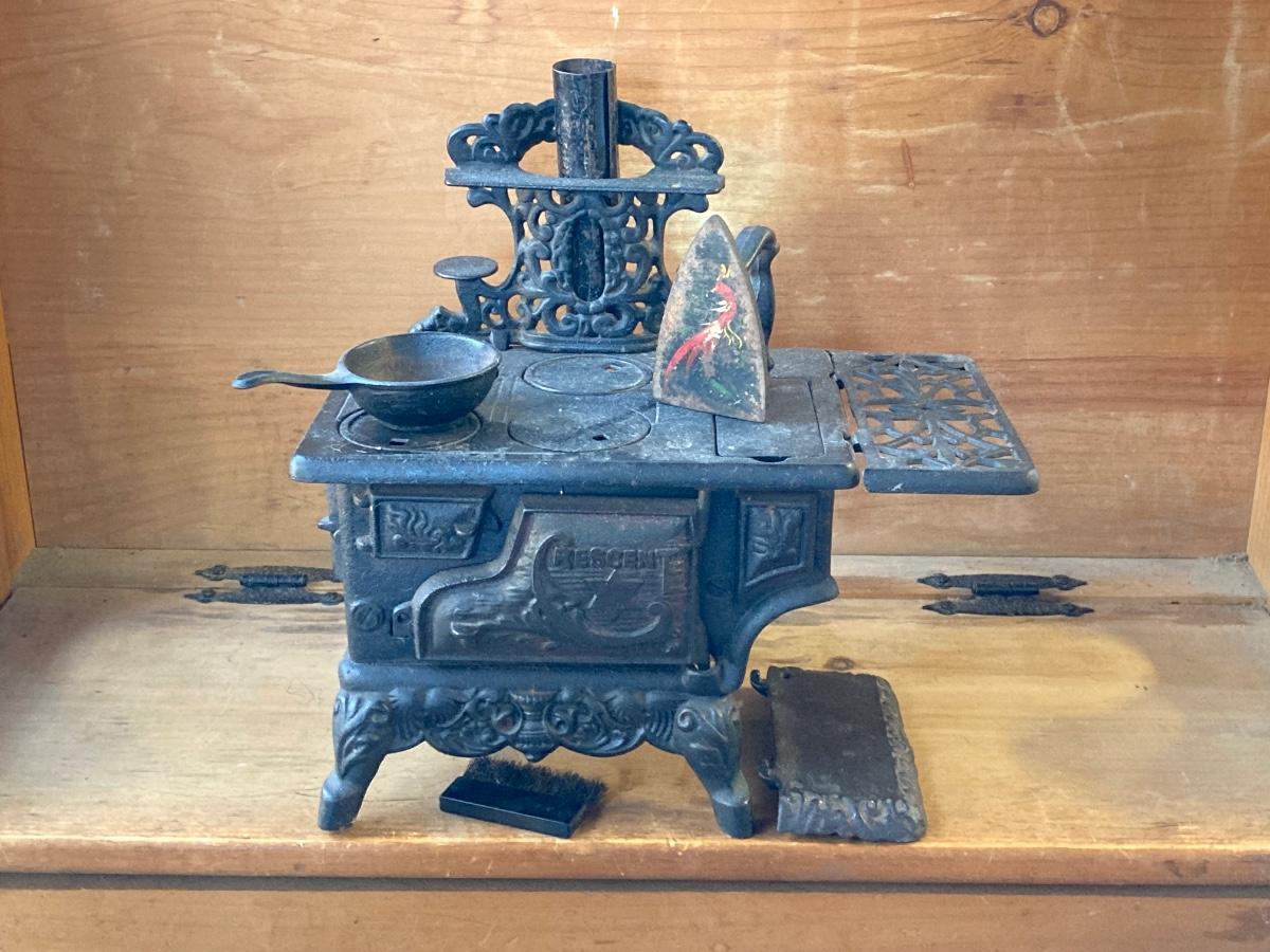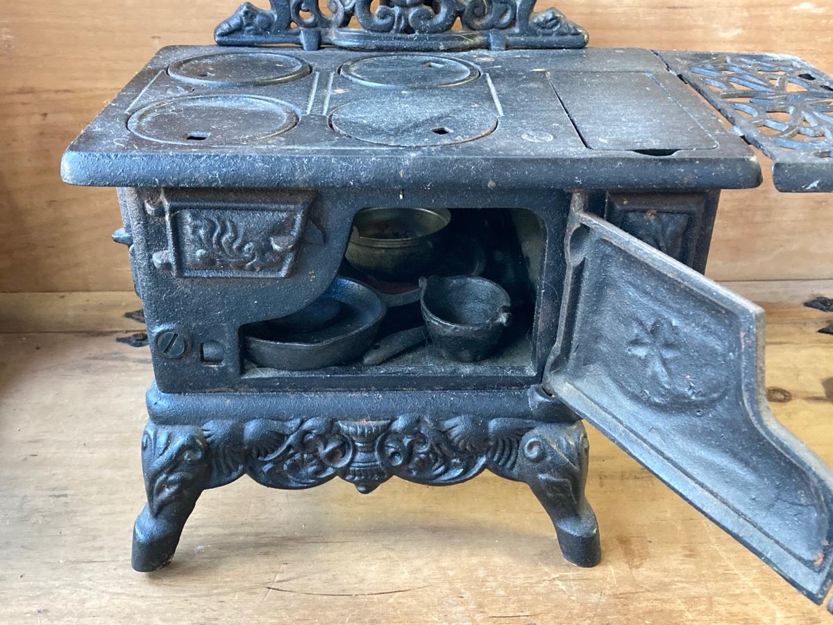 LOT 66: Vintage Miniature Crescent Cast Iron Stove with Cookware
