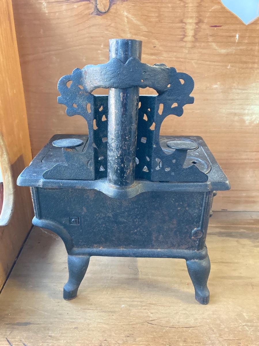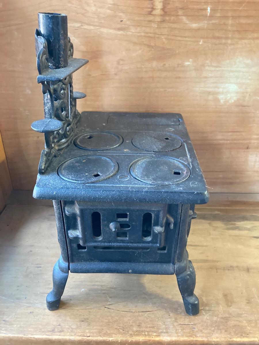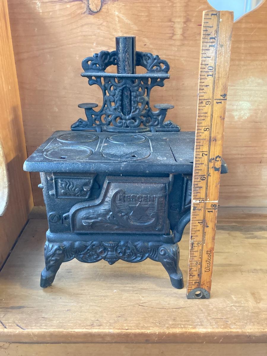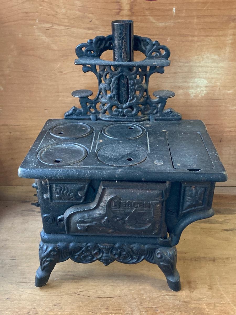 LOT 66: Vintage Miniature Crescent Cast Iron Stove with Cookware