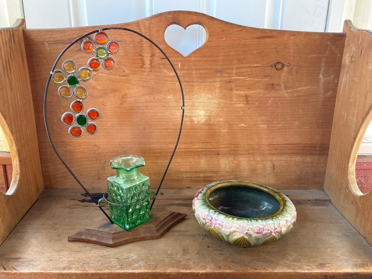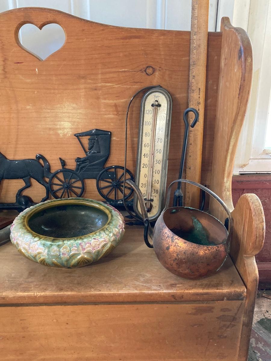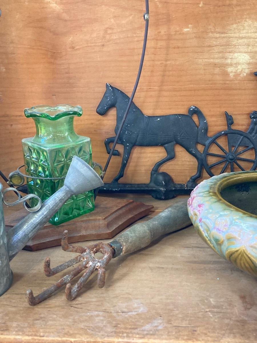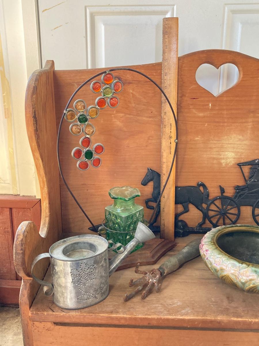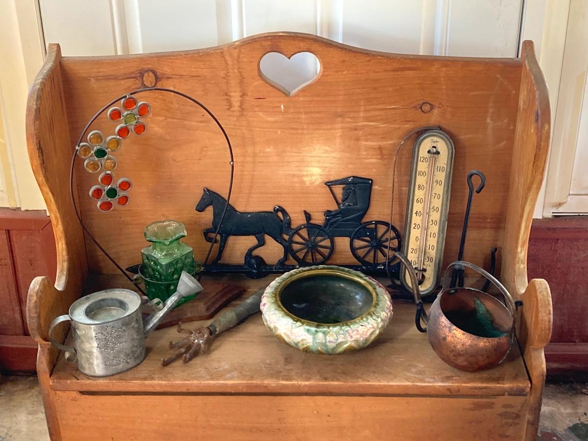 LOT 69: Children's Wooden Bench / Seat with Pottery, Watering Cans, MCM Wood Based Green Glass Vase with Stained Glass Flowers, Horse and Whitehall Carriage Weathervane, Taylor Thermometer and More