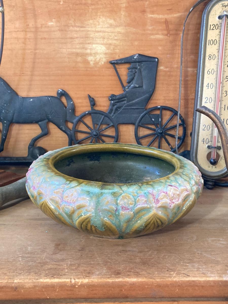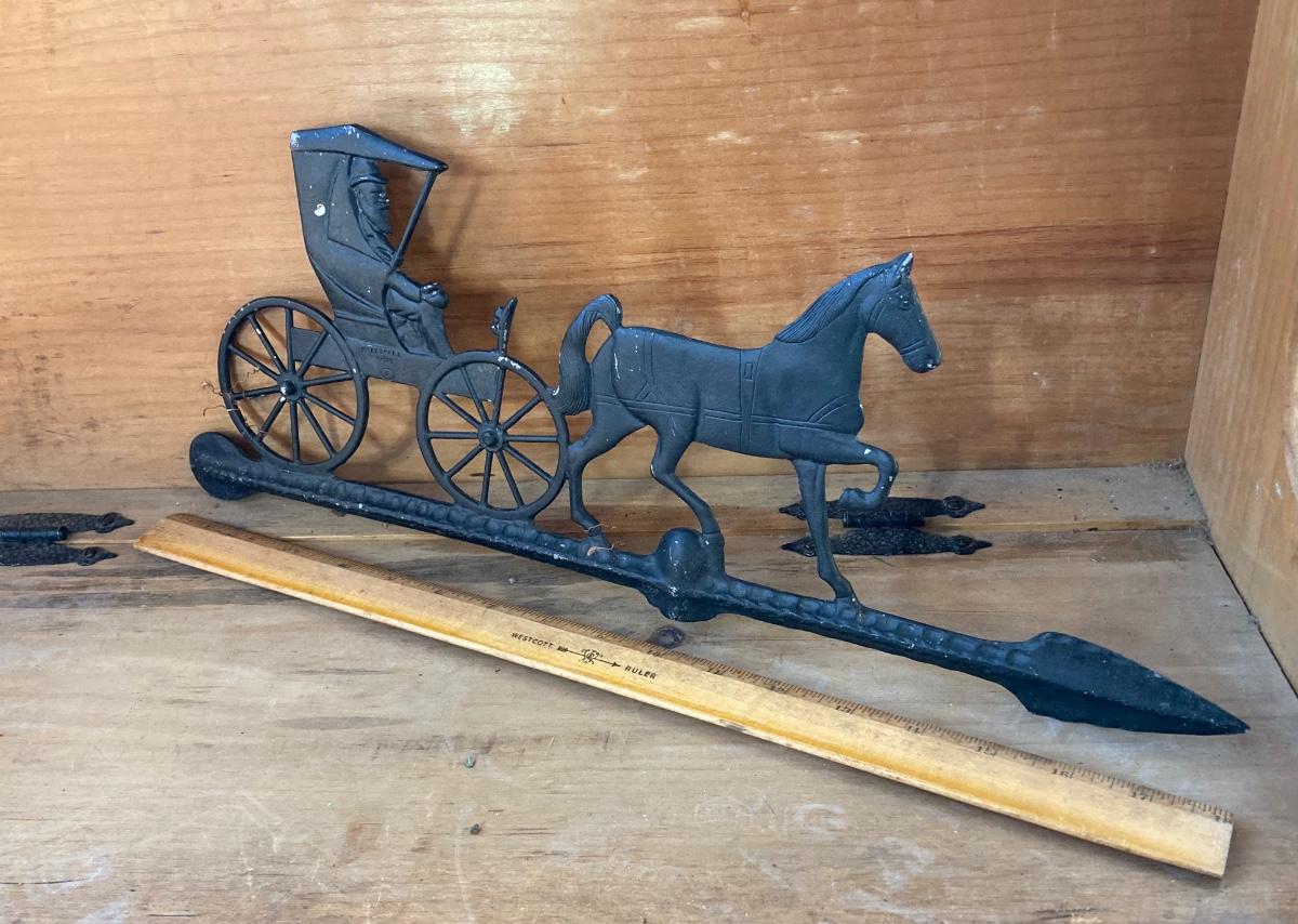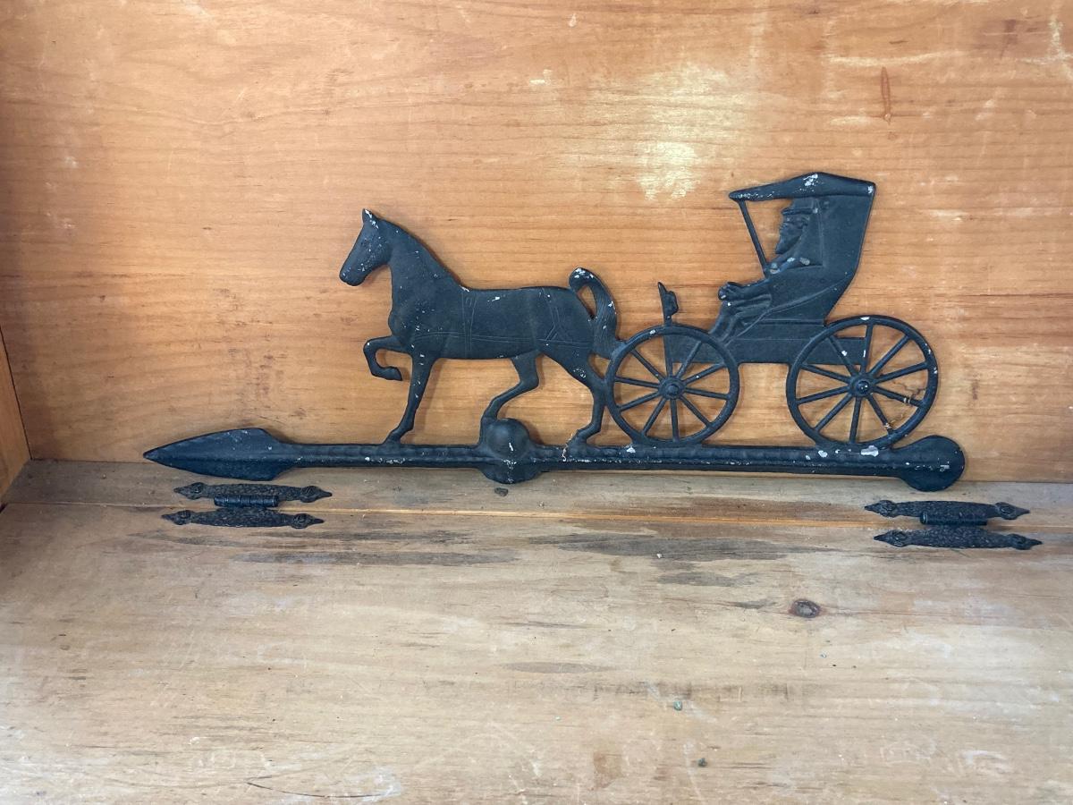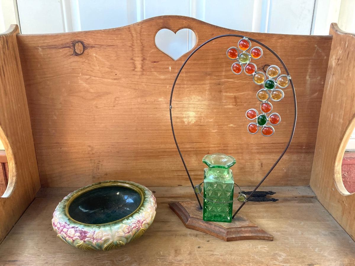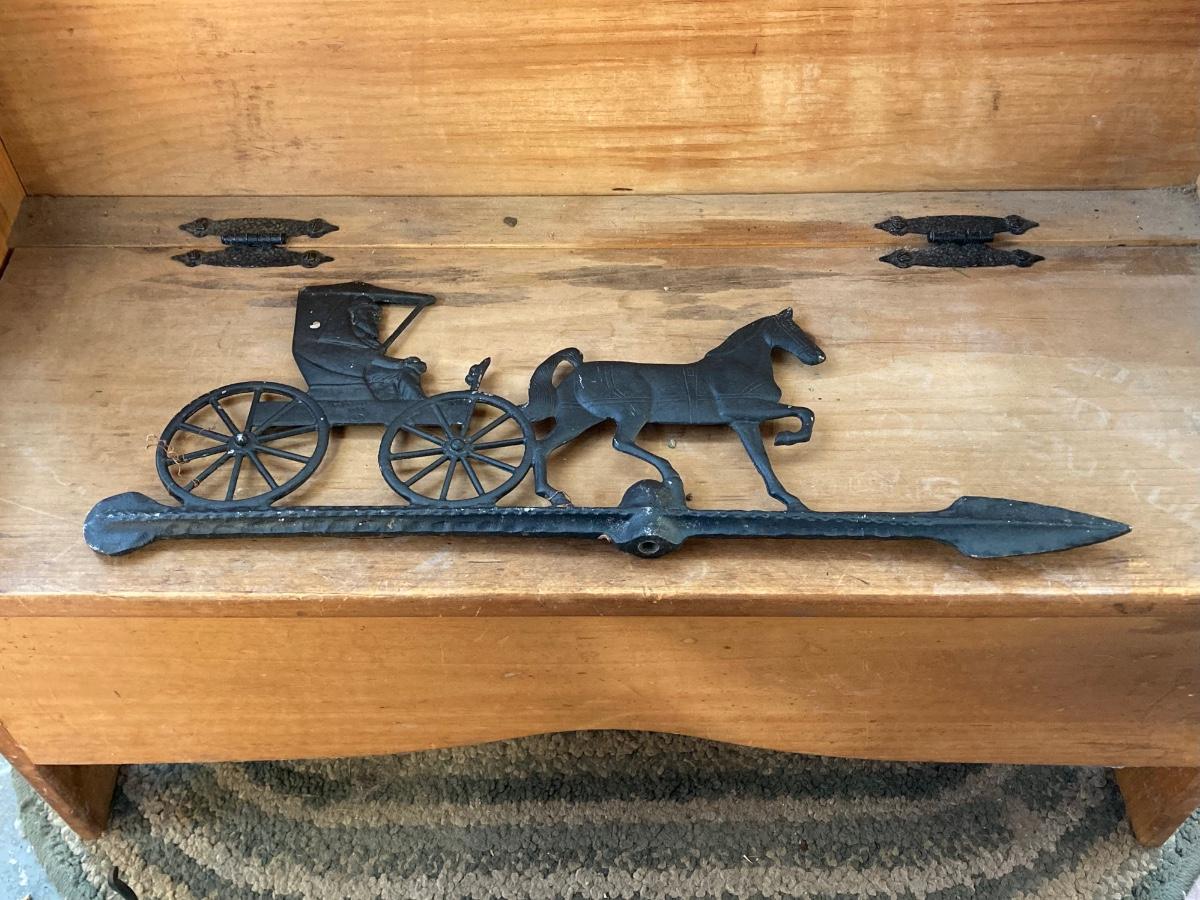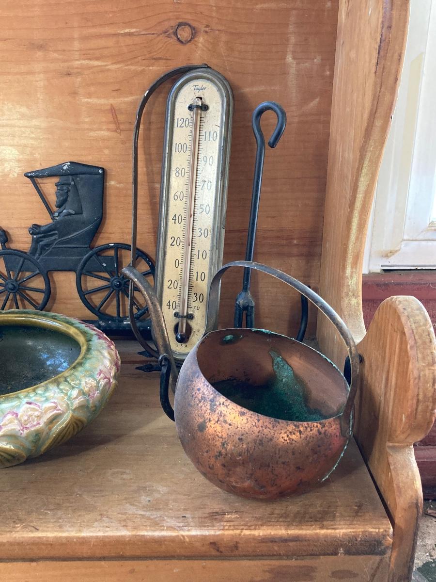 LOT 69: Children's Wooden Bench / Seat with Pottery, Watering Cans, MCM Wood Based Green Glass Vase with Stained Glass Flowers, Horse and Whitehall Carriage Weathervane, Taylor Thermometer and More