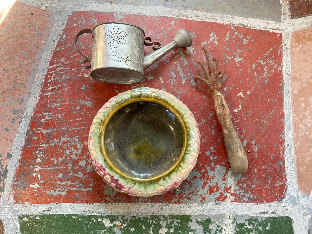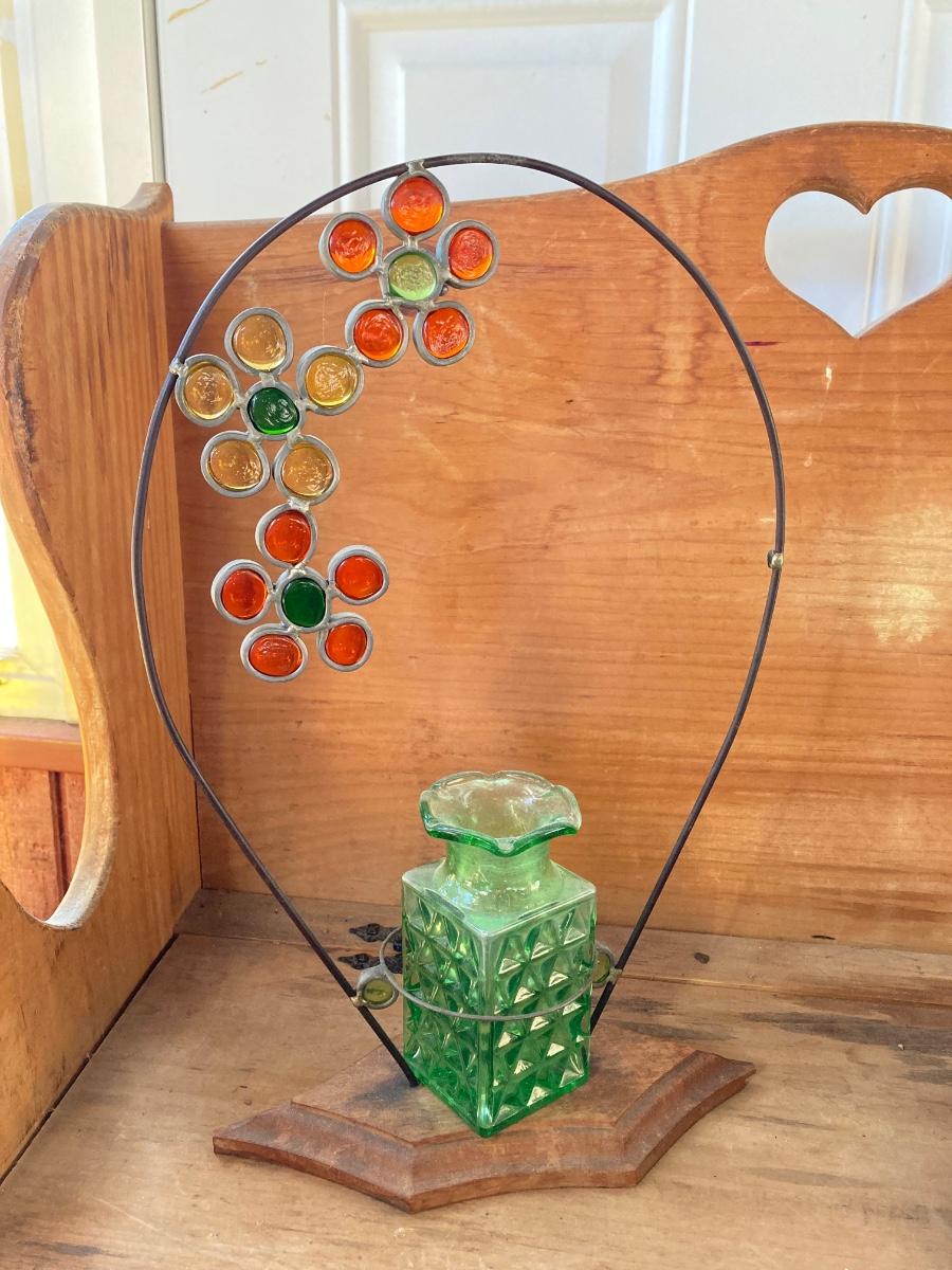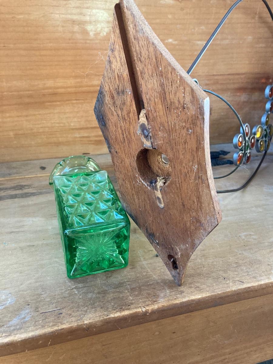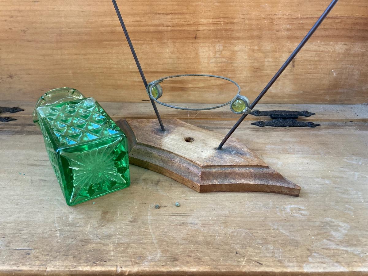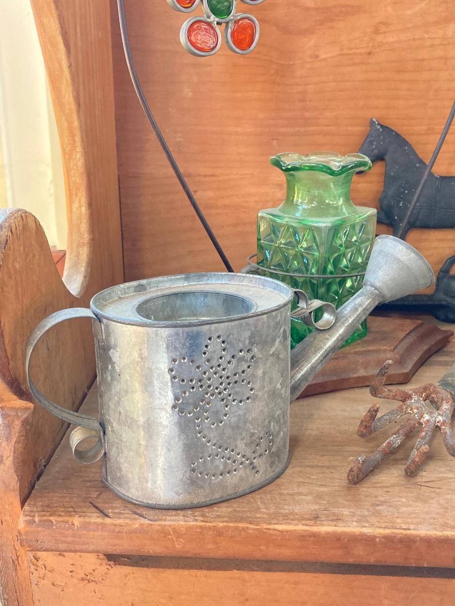 LOT 69: Children's Wooden Bench / Seat with Pottery, Watering Cans, MCM Wood Based Green Glass Vase with Stained Glass Flowers, Horse and Whitehall Carriage Weathervane, Taylor Thermometer and More