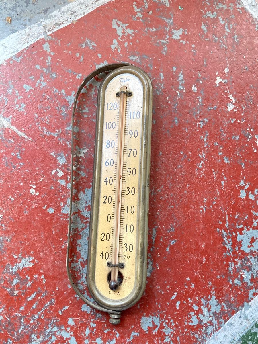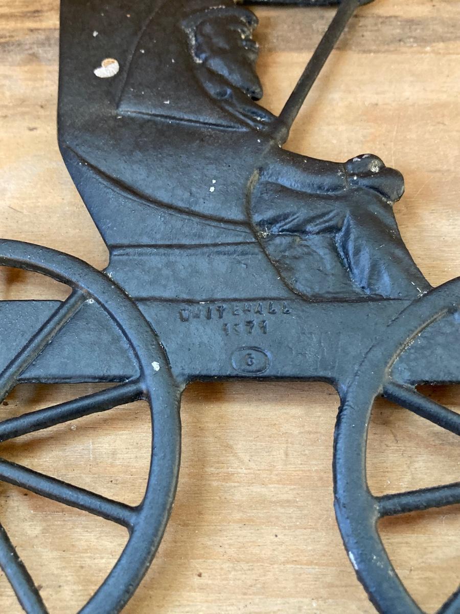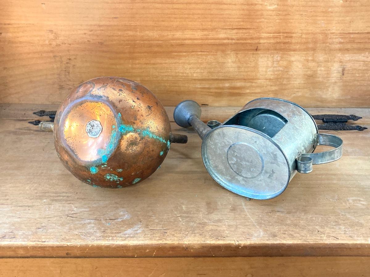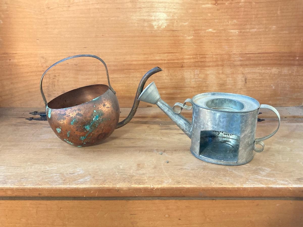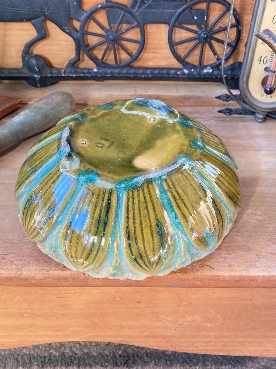 LOT 69: Children's Wooden Bench / Seat with Pottery, Watering Cans, MCM Wood Based Green Glass Vase with Stained Glass Flowers, Horse and Whitehall Carriage Weathervane, Taylor Thermometer and More