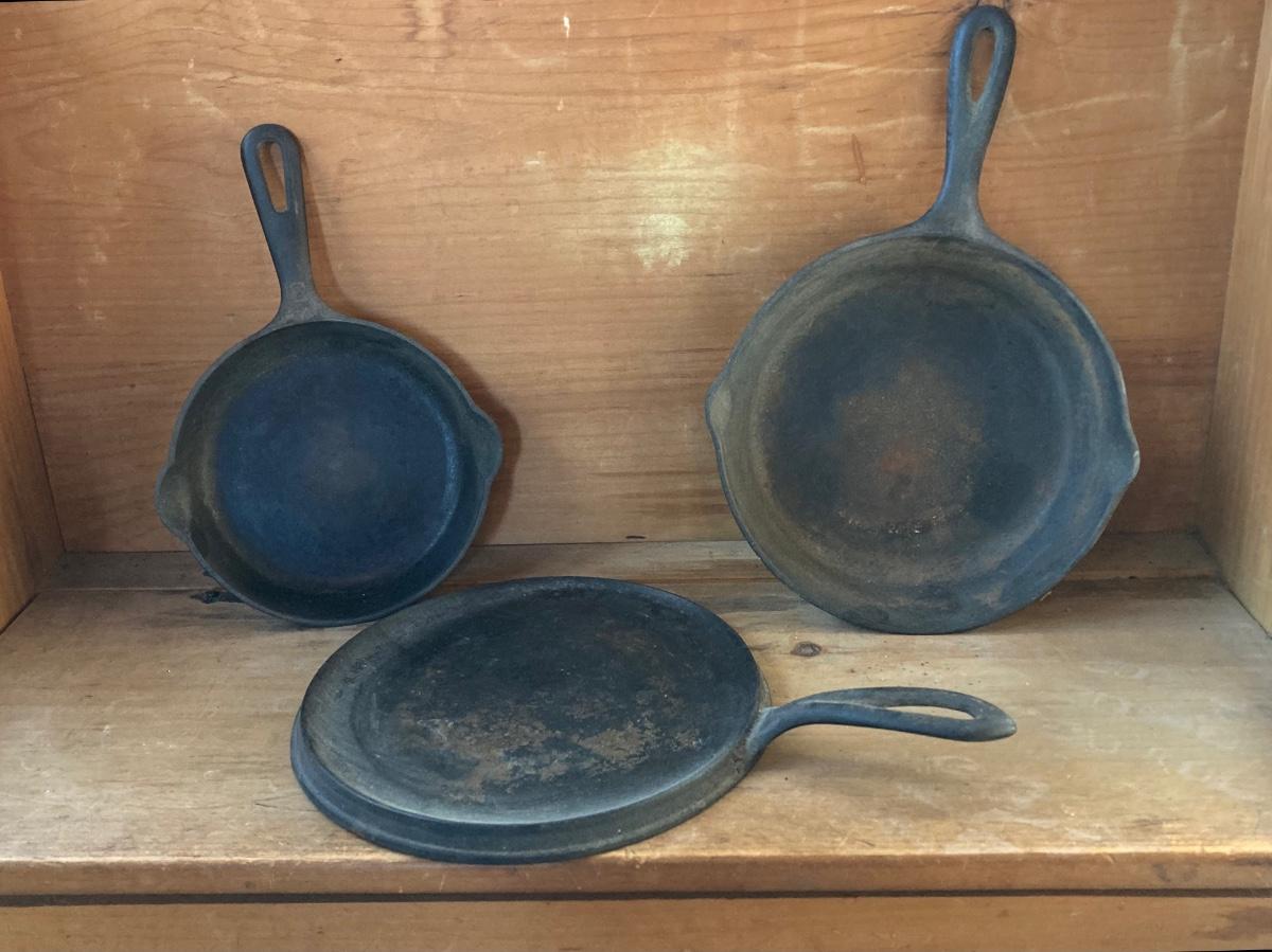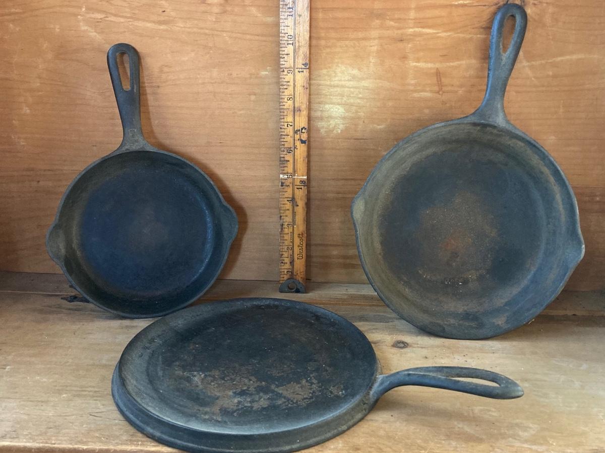 LOT 72: Vintage Cast Iron Cookware - Skillets (Griswold 3 Included) and Griddle 7 / Flat Pan
