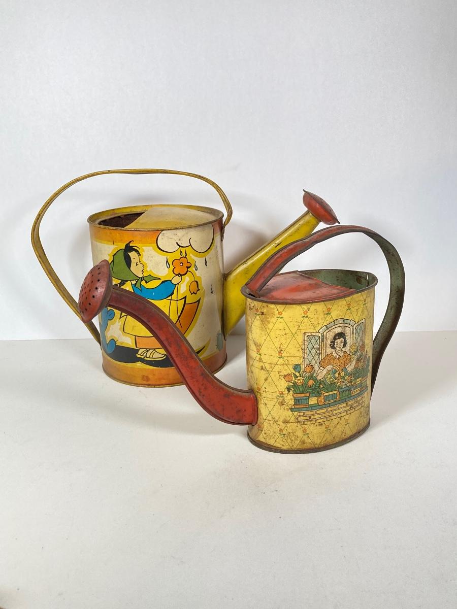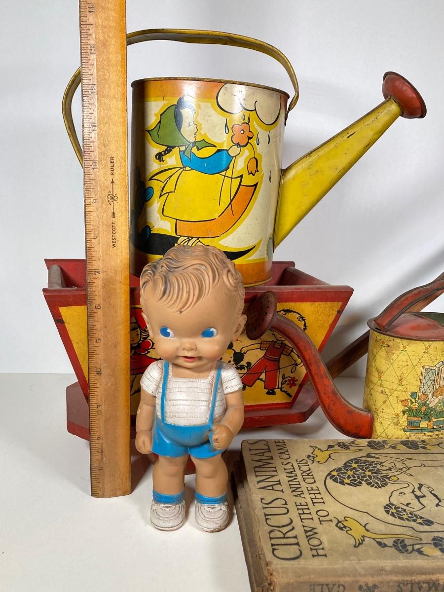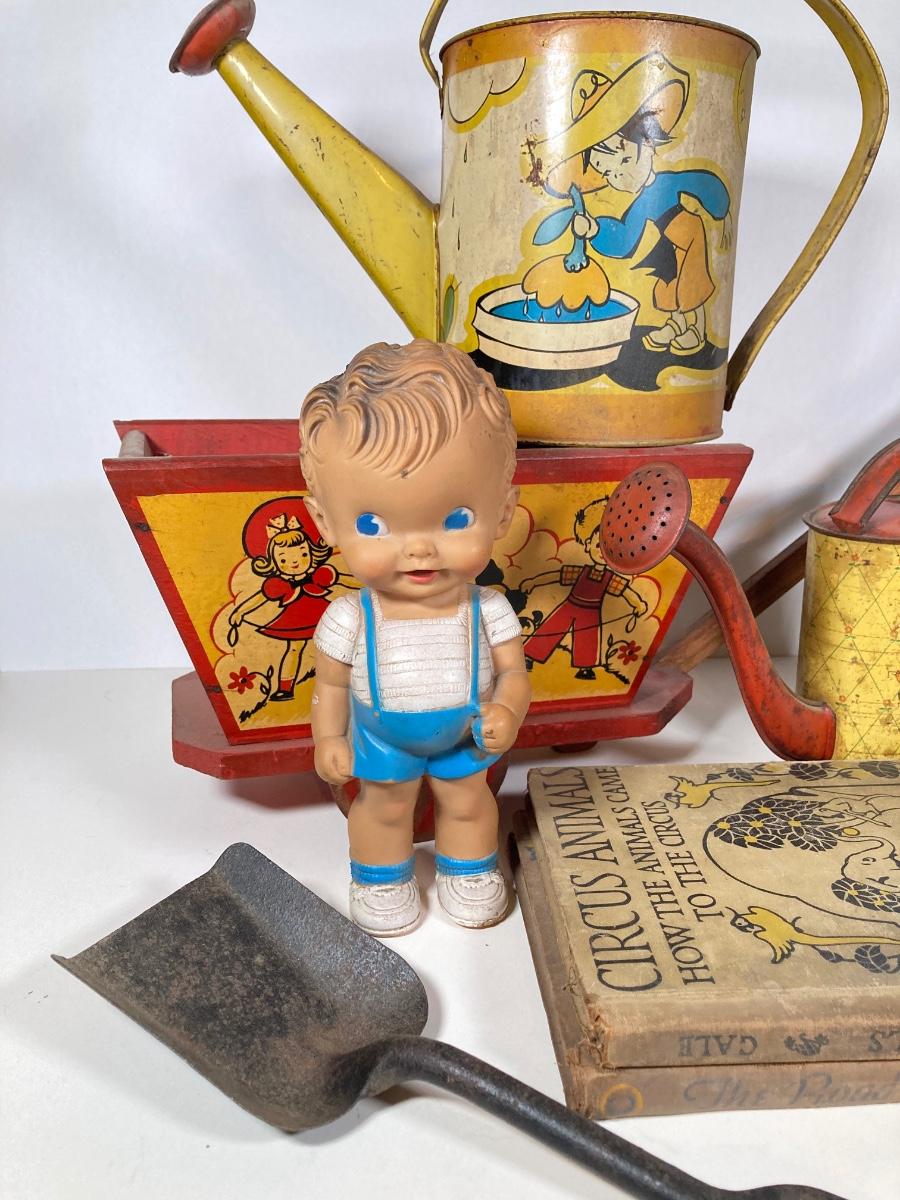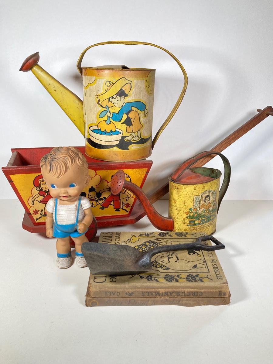 LOT 75: Vintage Children's Toys - Watering Cans, Doll (The Sun Rubber Co / Ruth E Newton), Wooden Cart, Books and More