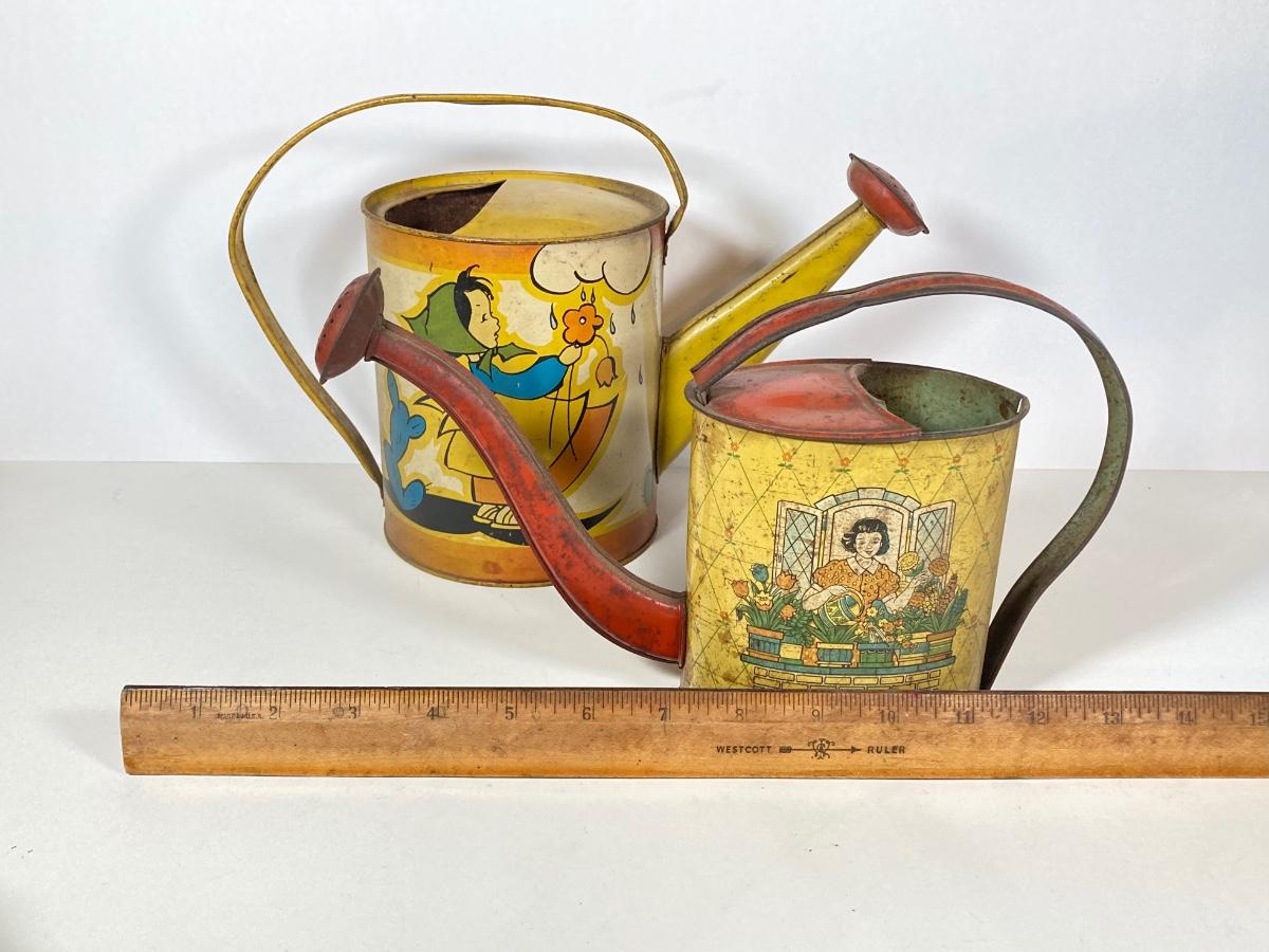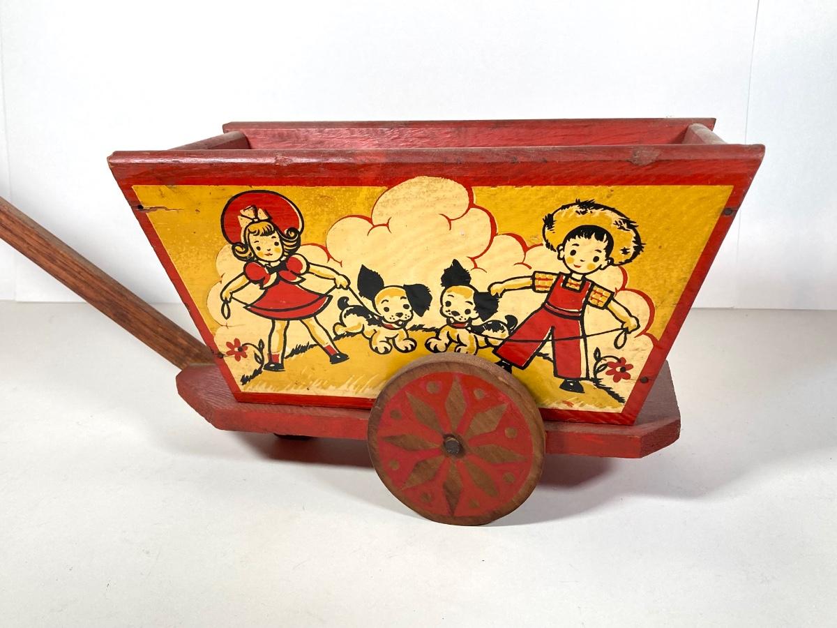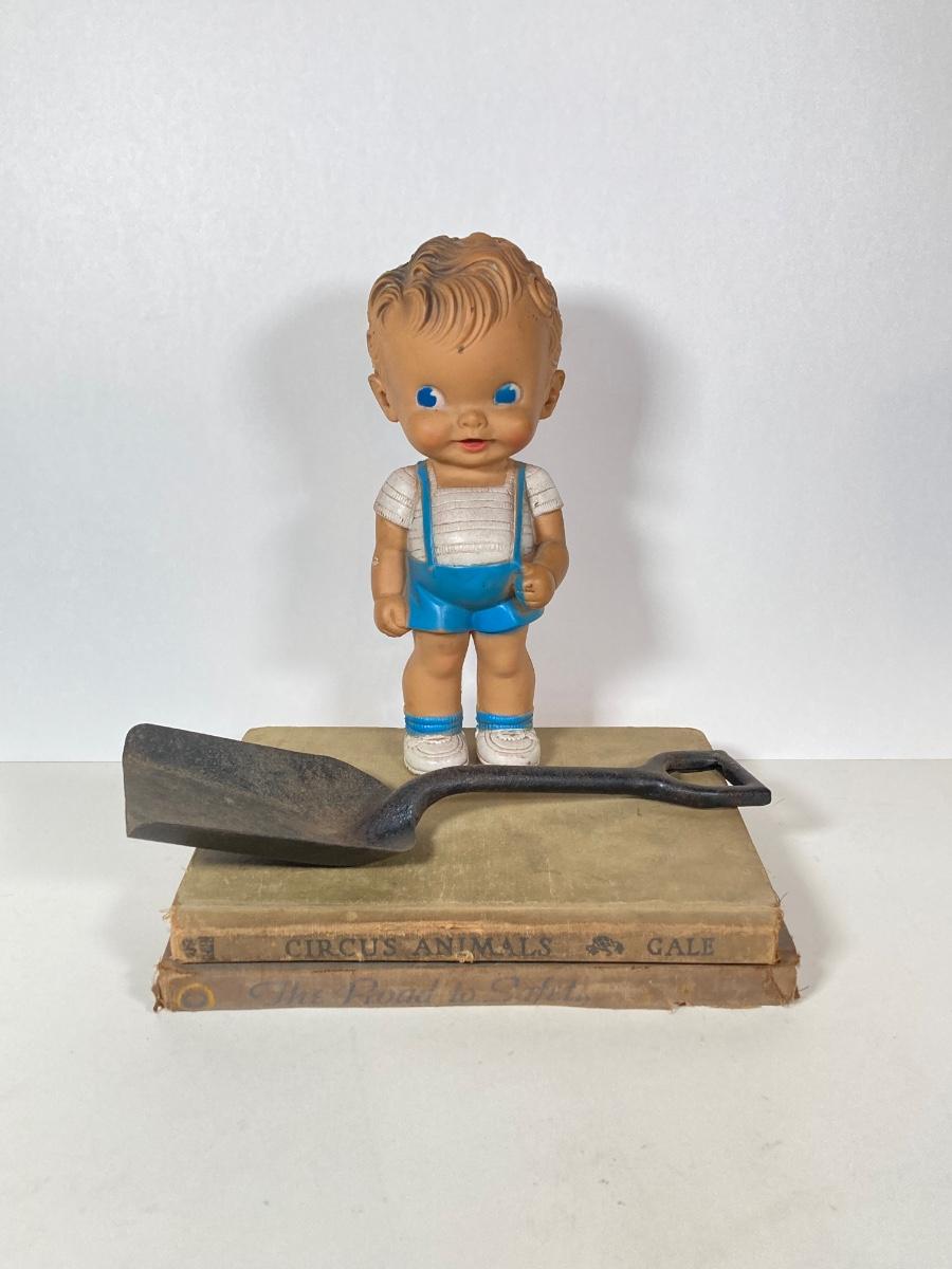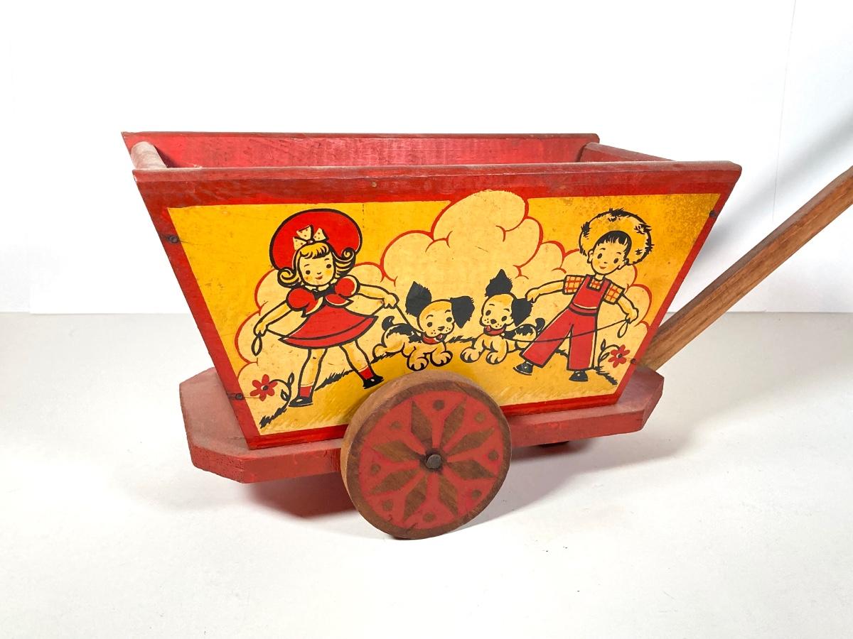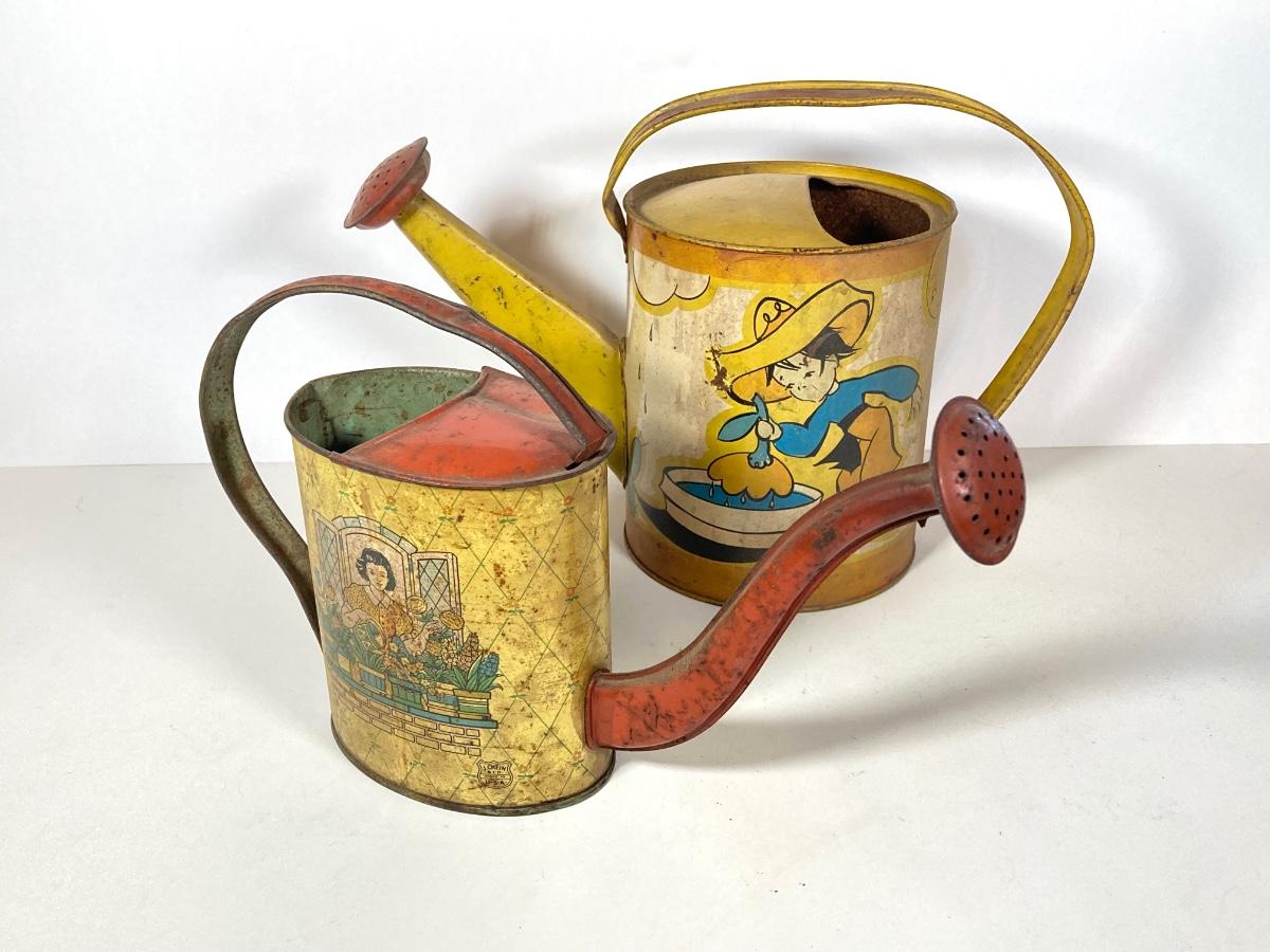 LOT 75: Vintage Children's Toys - Watering Cans, Doll (The Sun Rubber Co / Ruth E Newton), Wooden Cart, Books and More