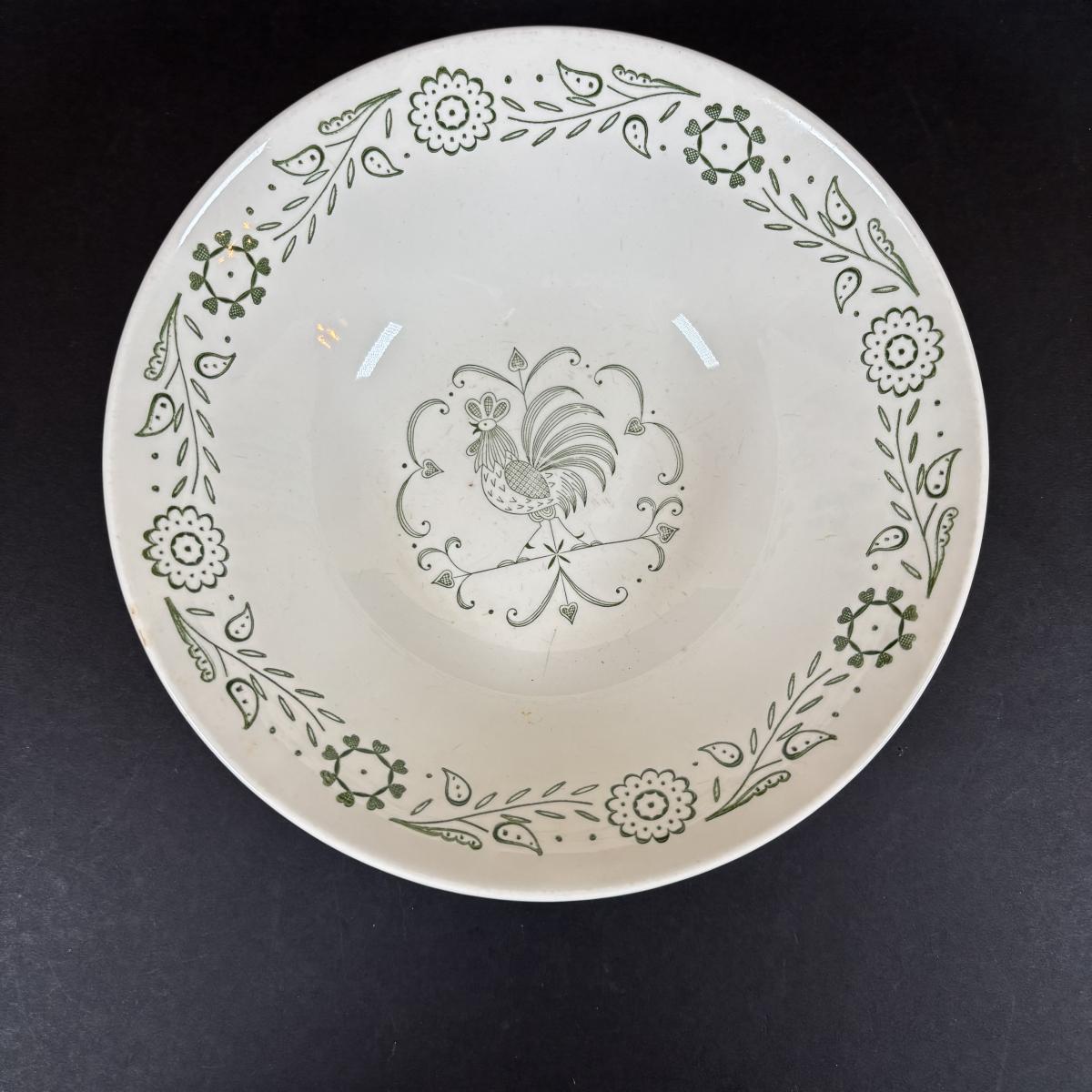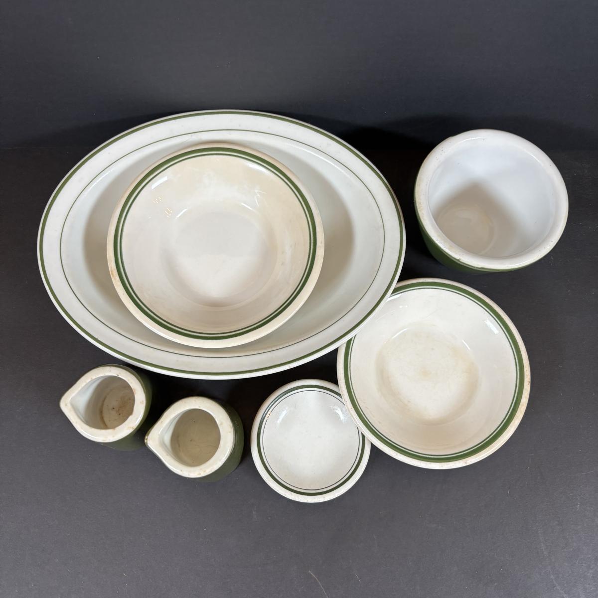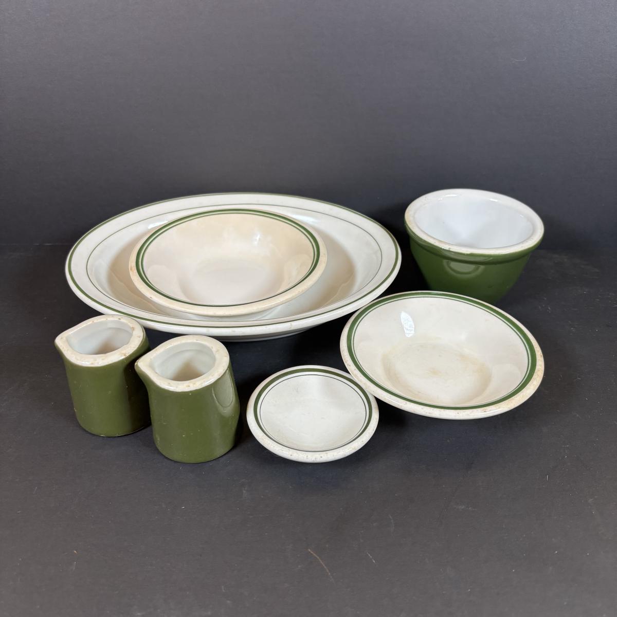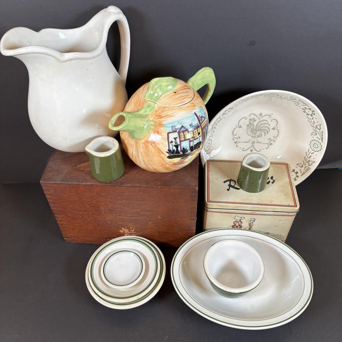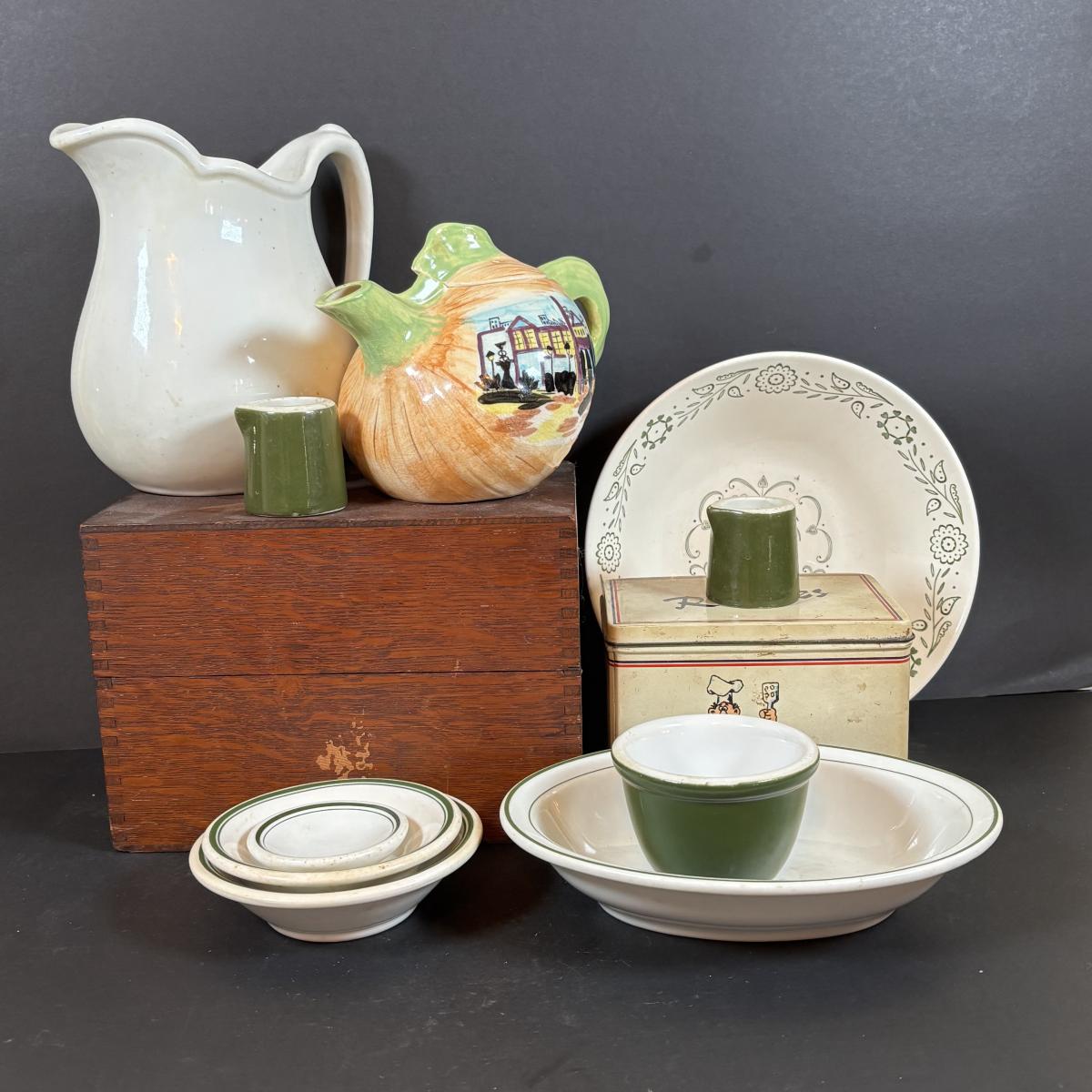 LOT 84: Vintage Wooden Recipe Box, White Iroquois China, Buffalo China, Green Creamers & Custard Cup, Chef Recipe Tin &n More