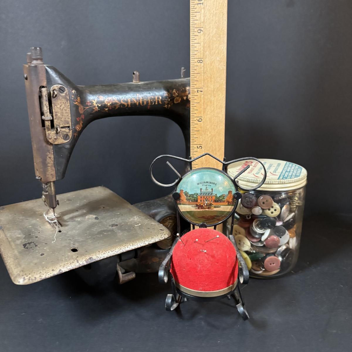 LOT 87: Vintage Singer Sewing Machine, Button & Souvenir Rocking Chair Pin Cushion