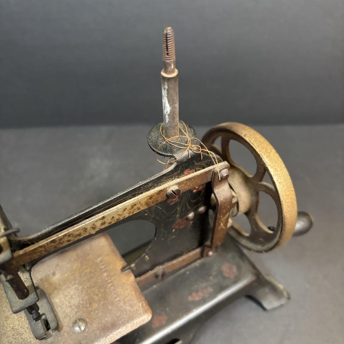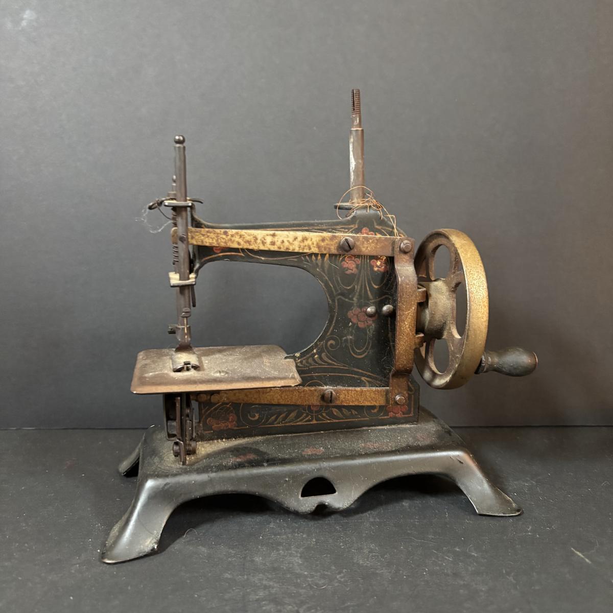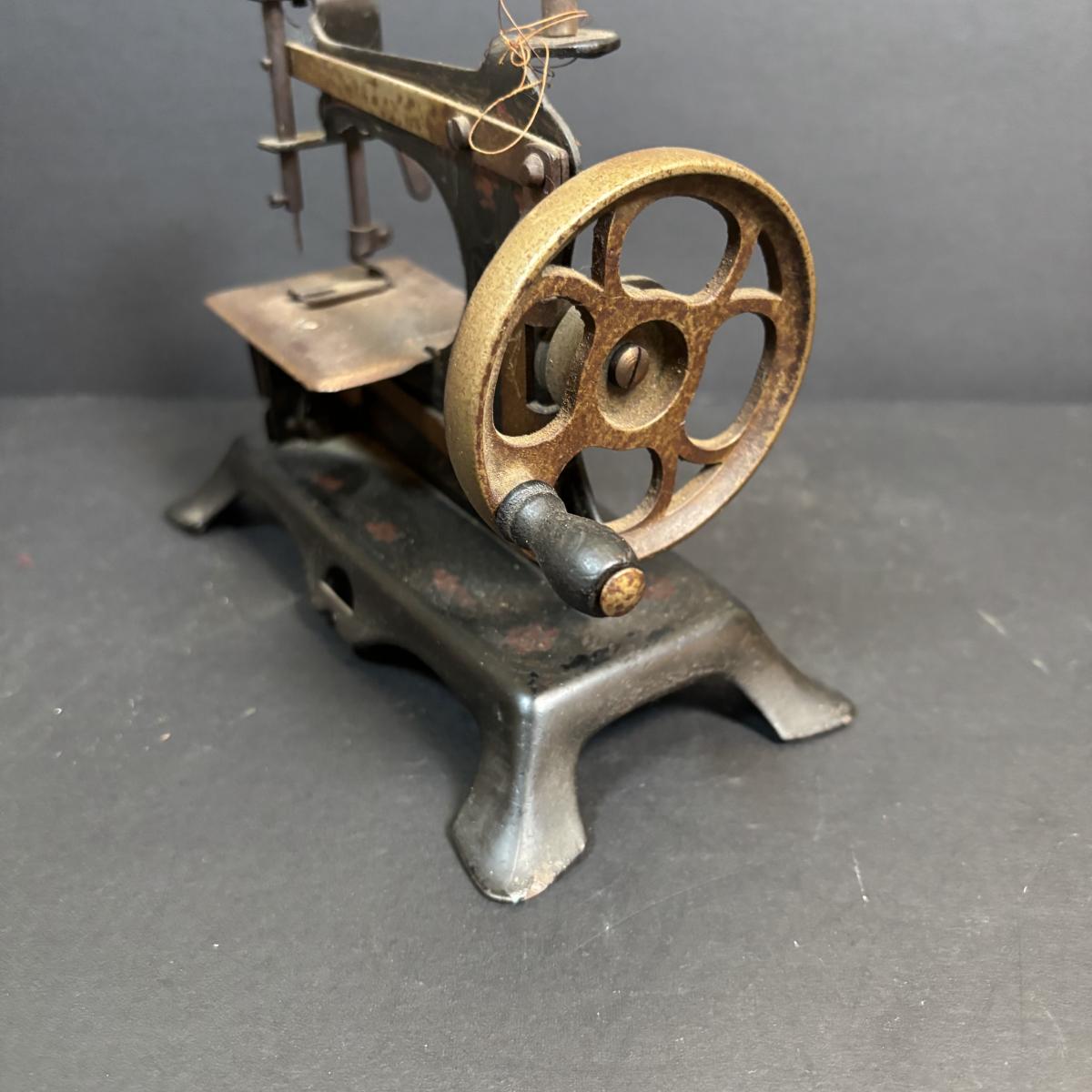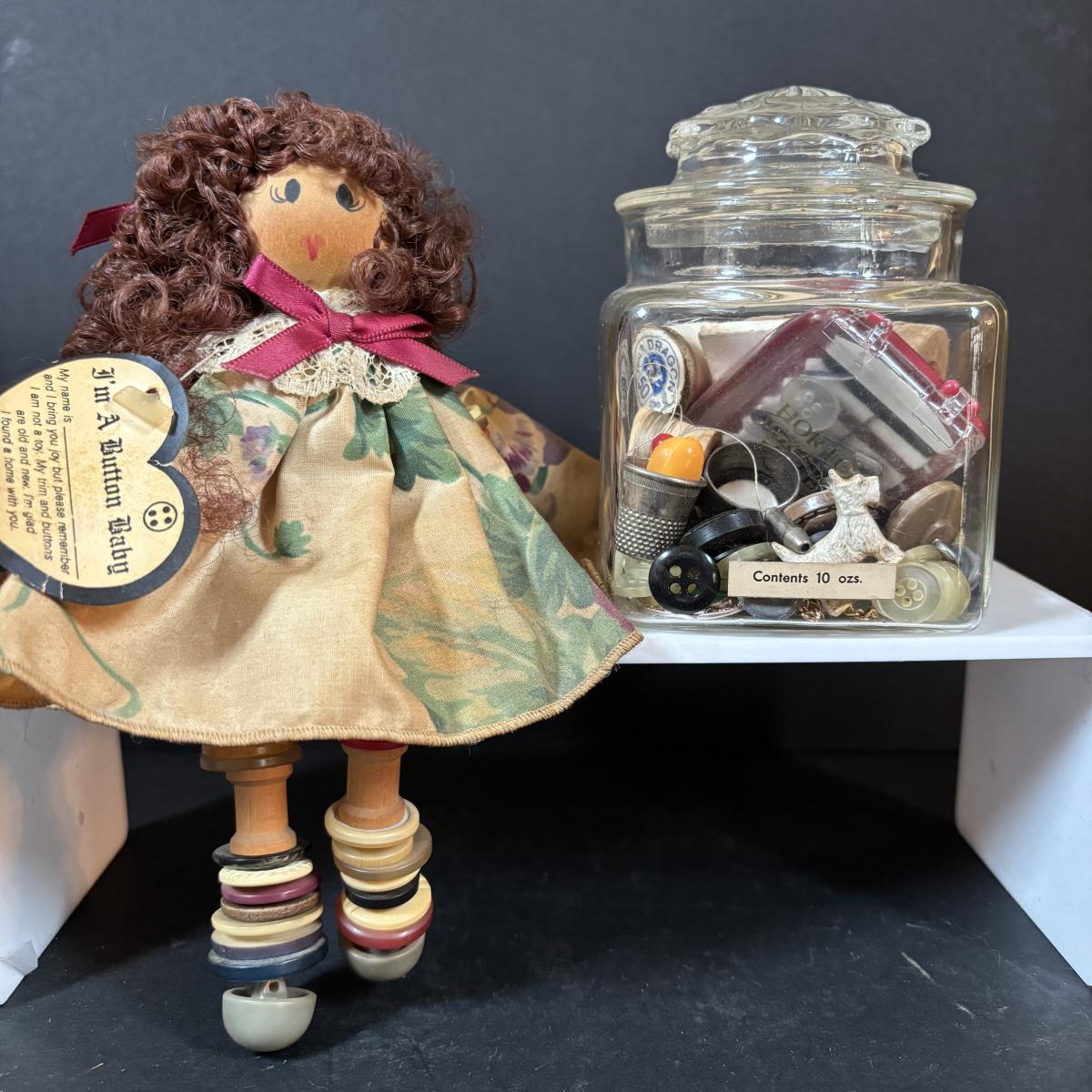 LOT 88: Antique Toy Sewing Machine Made in Germany, Sewing Notions & Button Shelf Sitter Doll