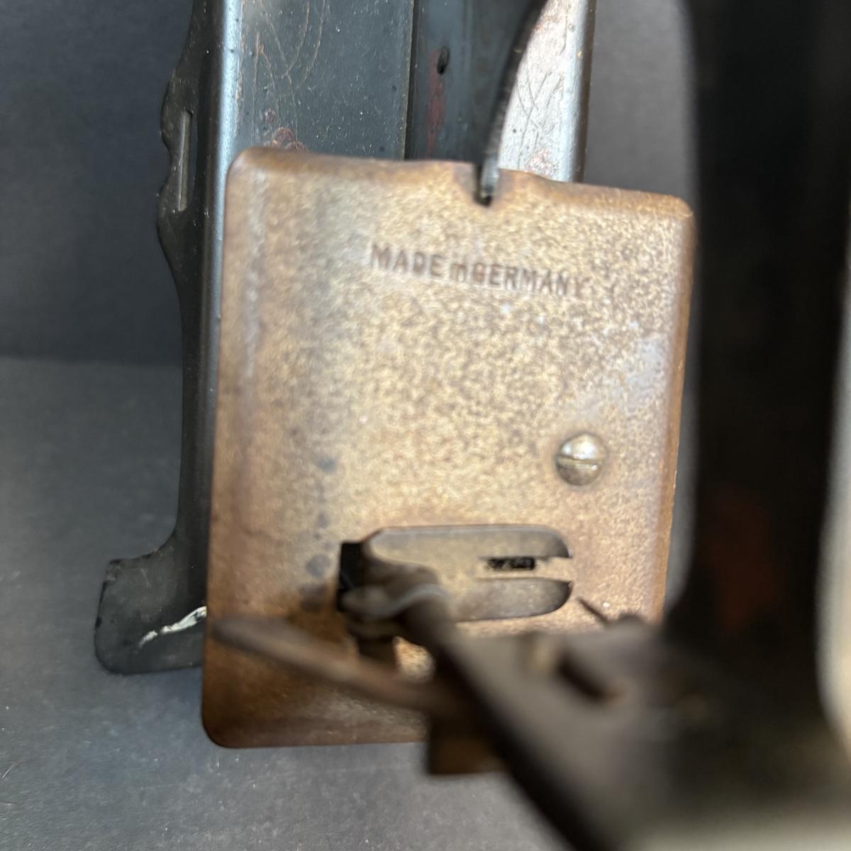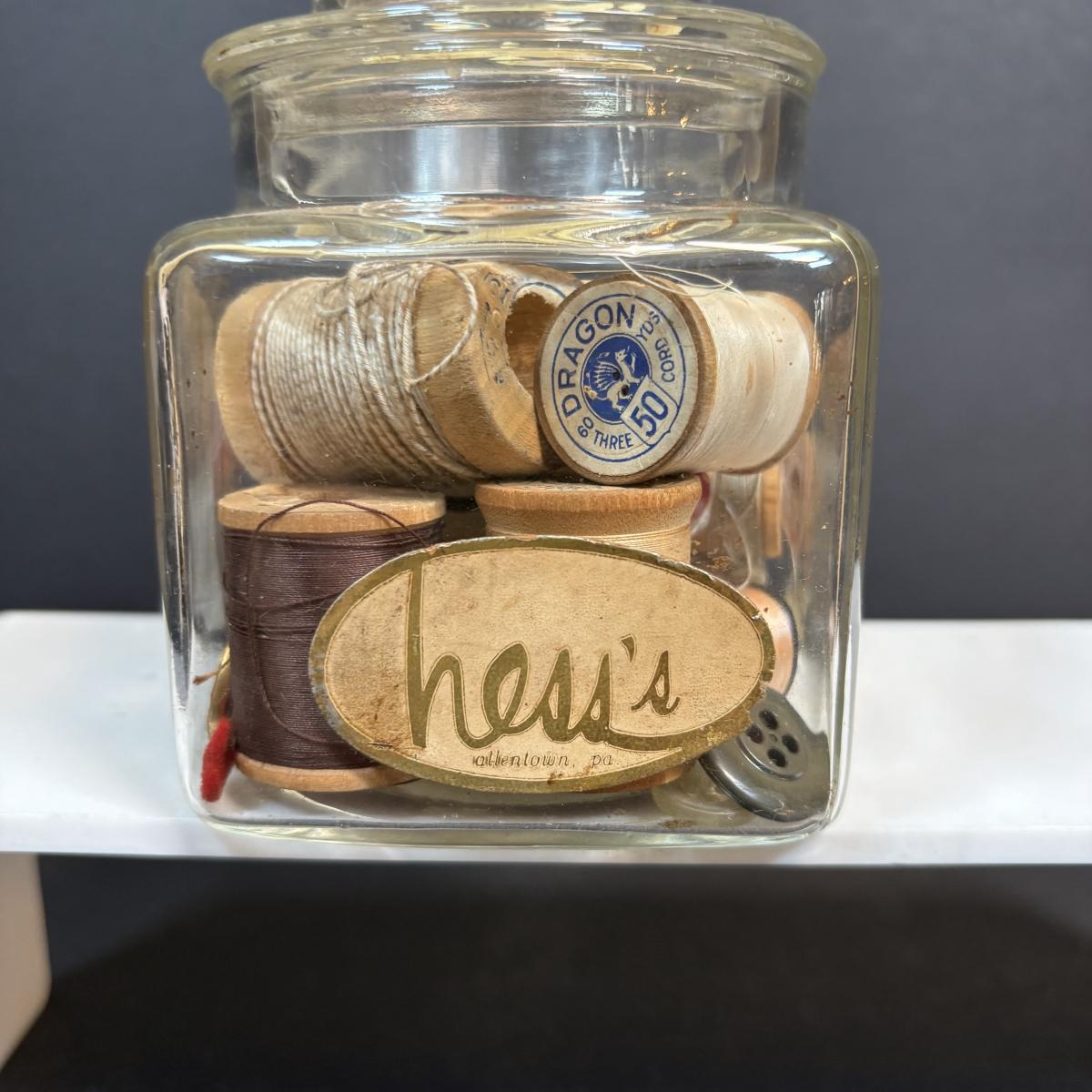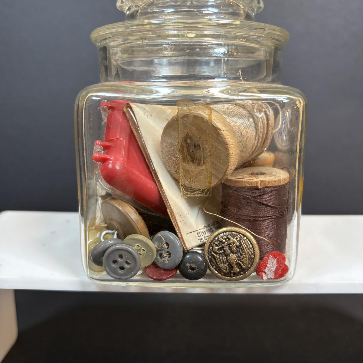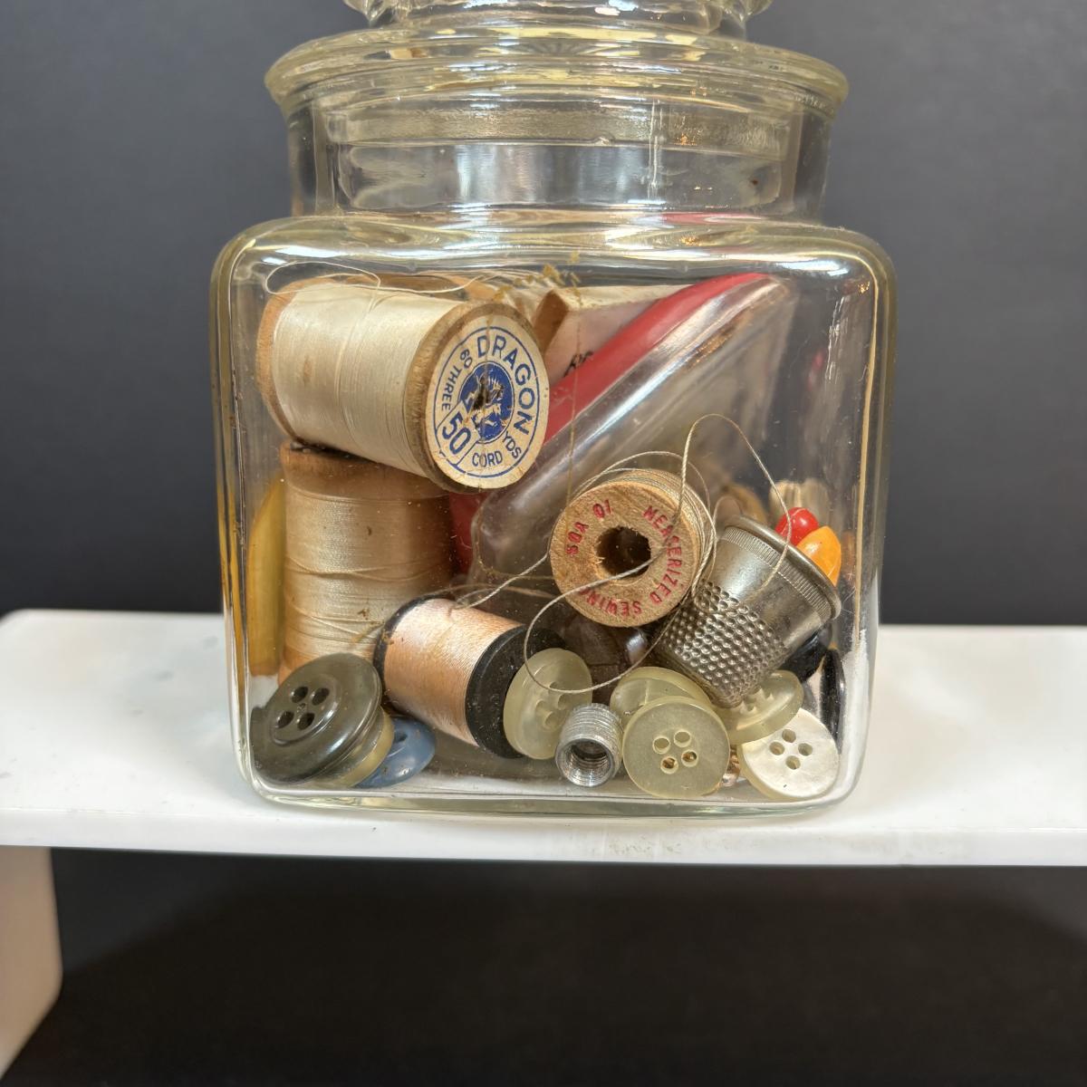 LOT 88: Antique Toy Sewing Machine Made in Germany, Sewing Notions & Button Shelf Sitter Doll
