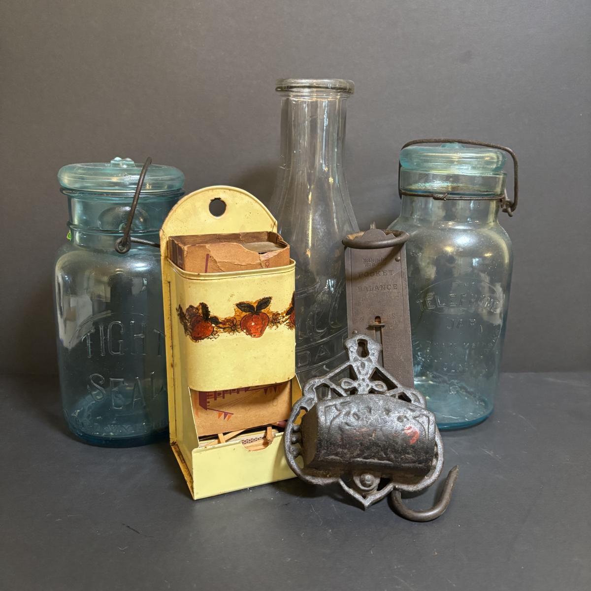 LOT 98: Vintage Canning Jars & Valley Dairy Milk Bottle, Pocket Balance Hanging Scale made in Germany, Iron Wall Match Holder & Tin/Metal Wall Match Holder