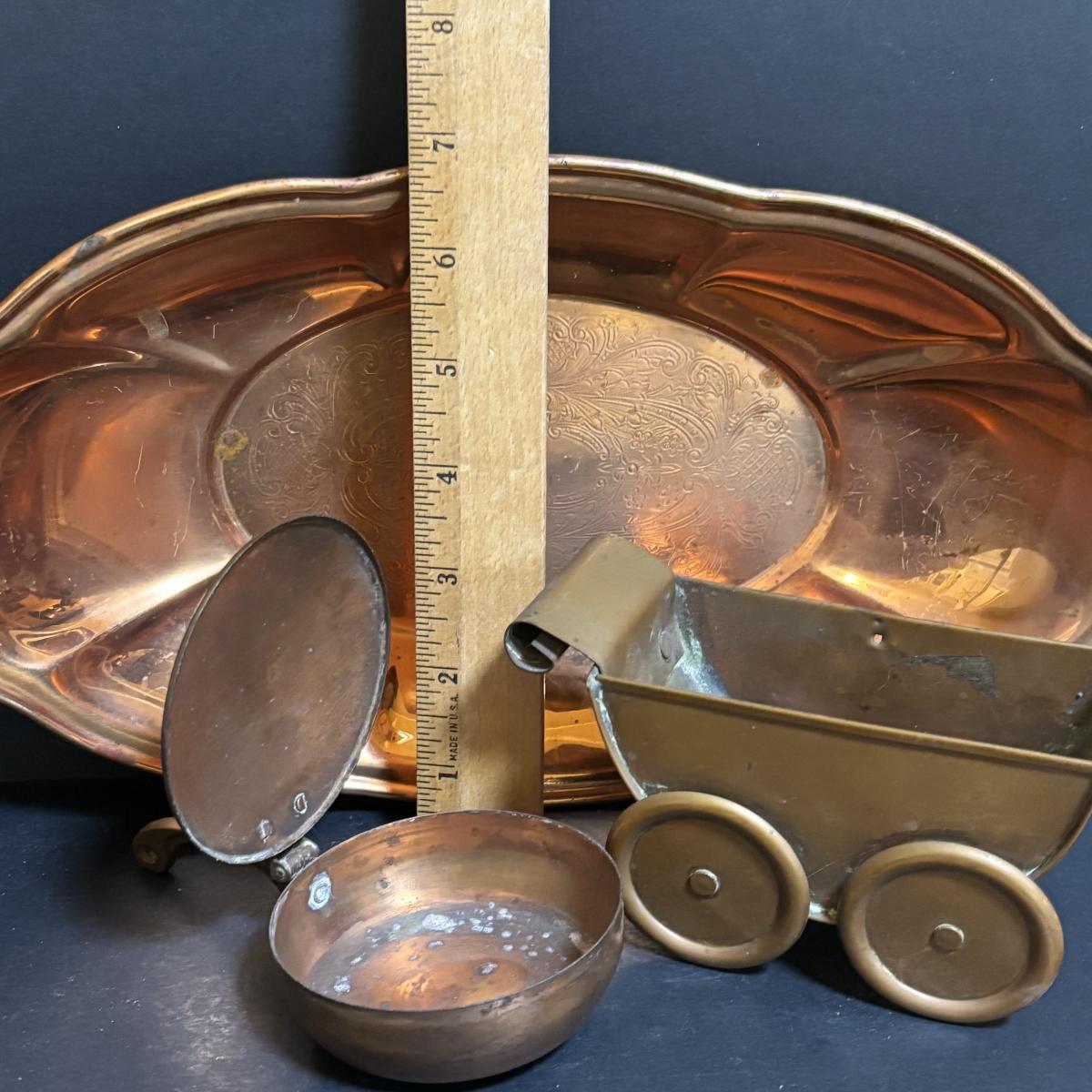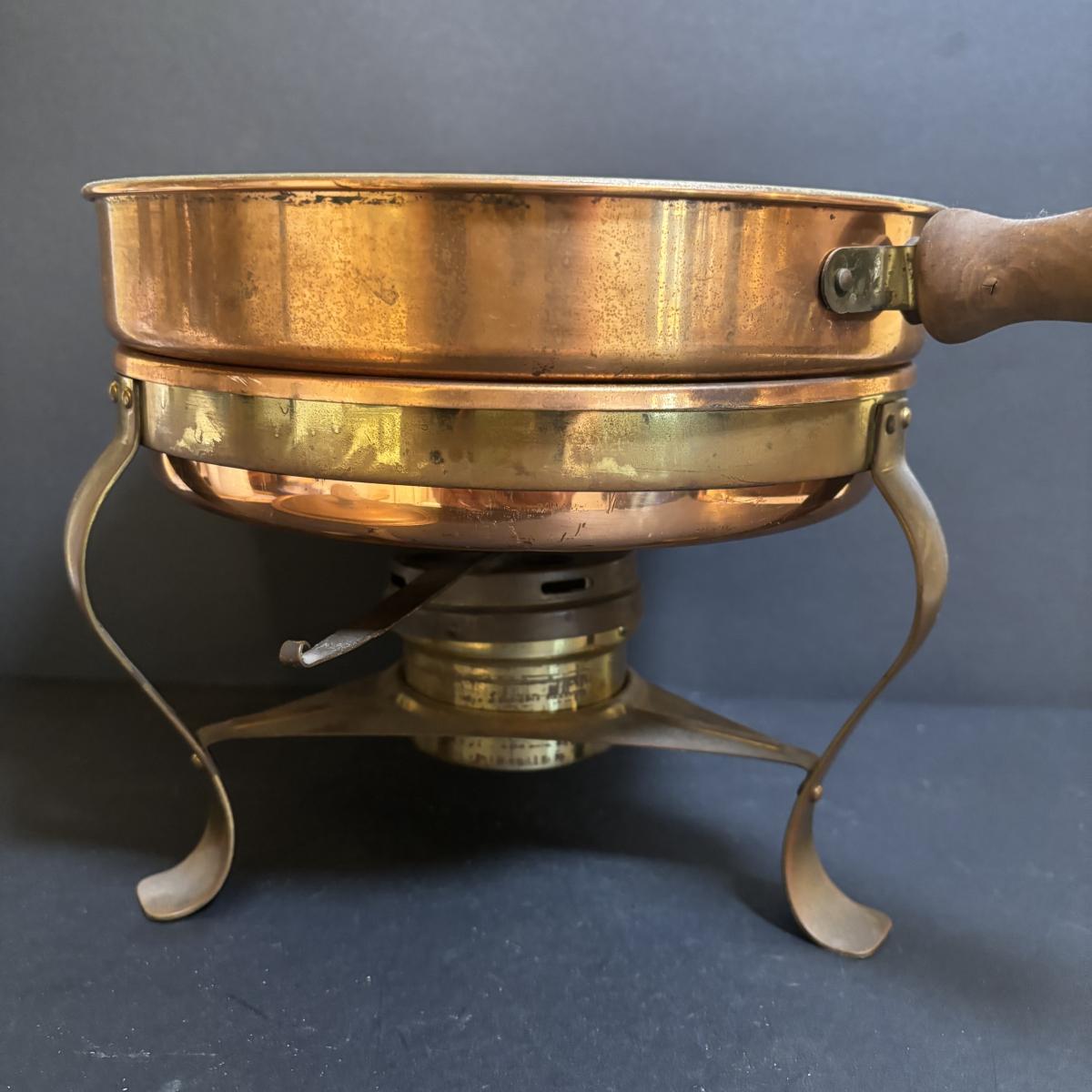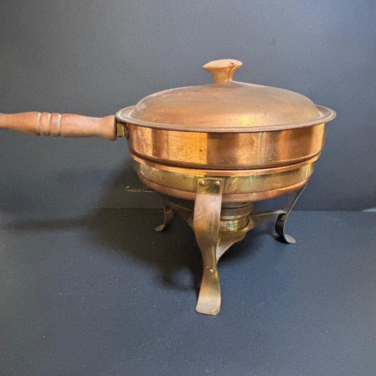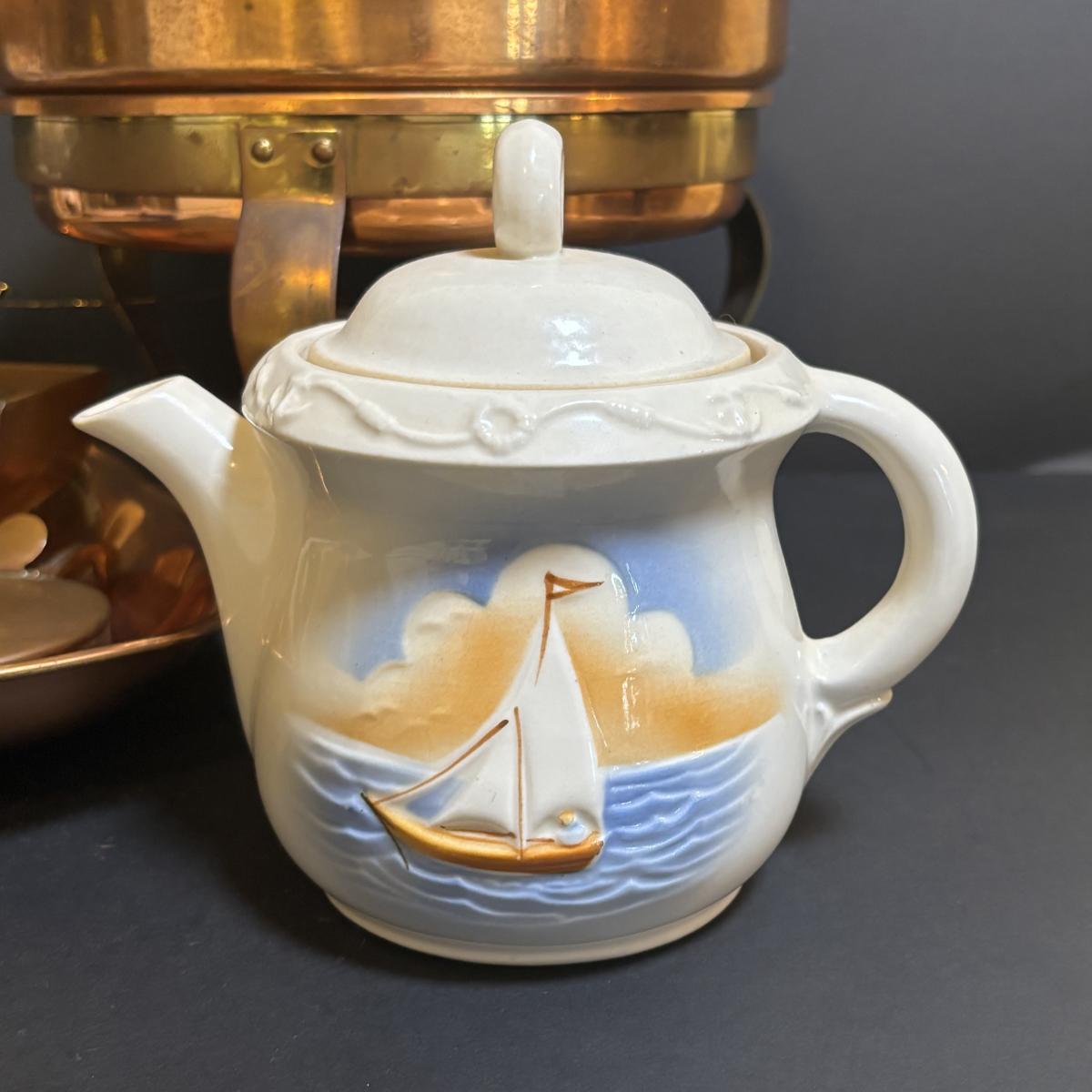 LOT 100: MCM Brass & Copper Chafing Dish/Fondue Set, Porcelier Vitreous Hand Decorated Teapot & More