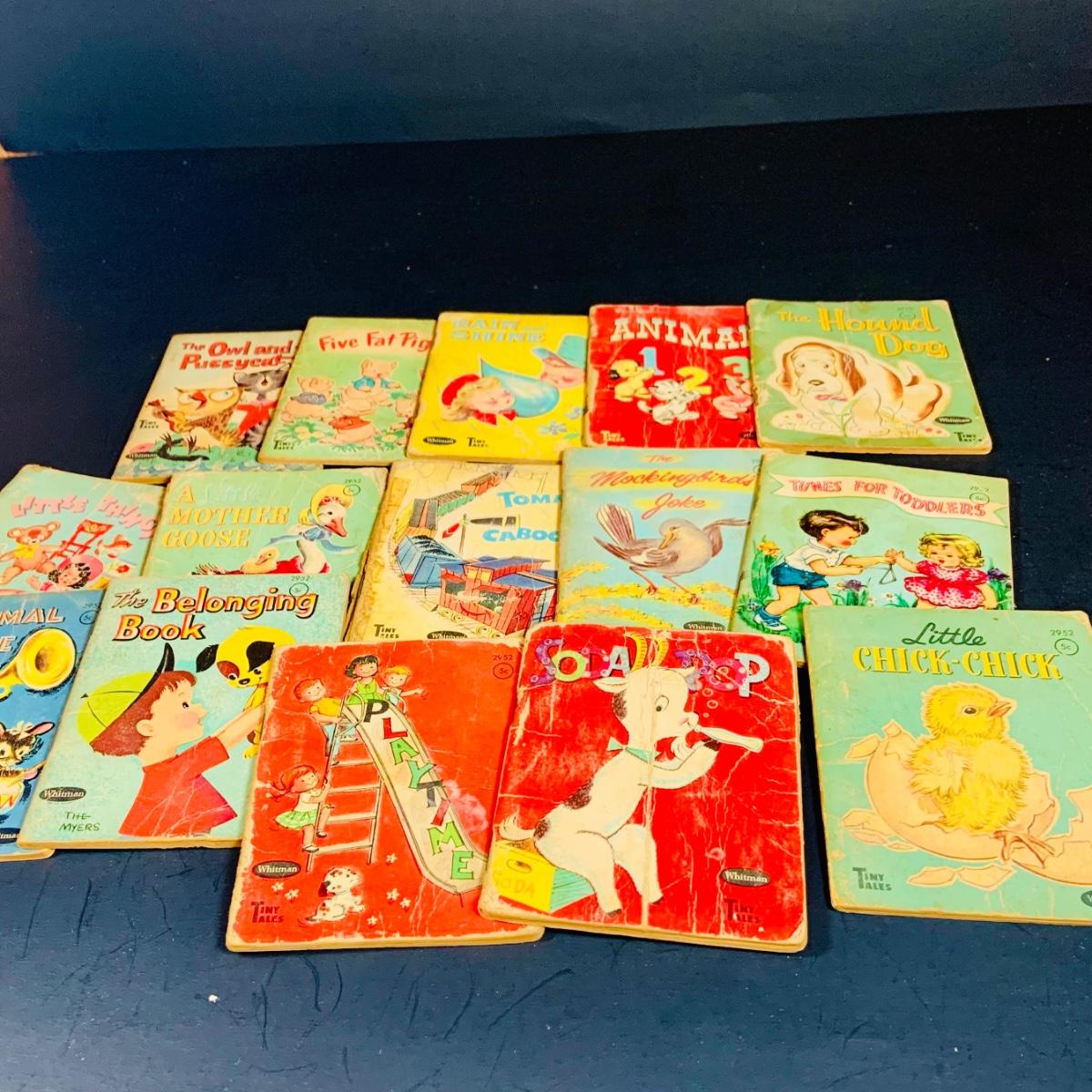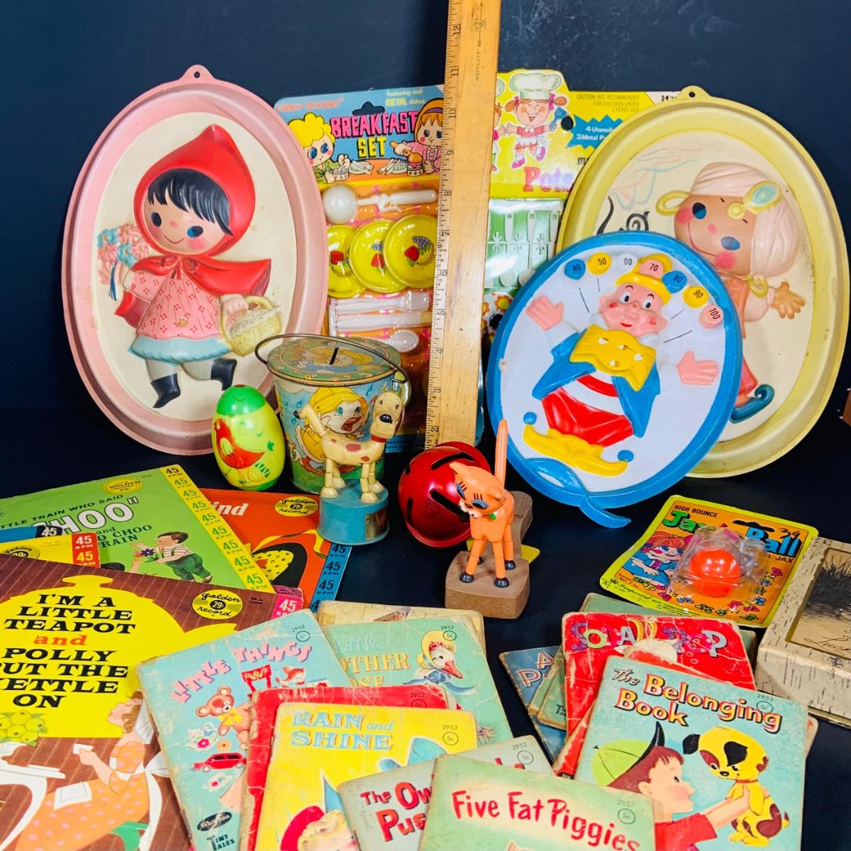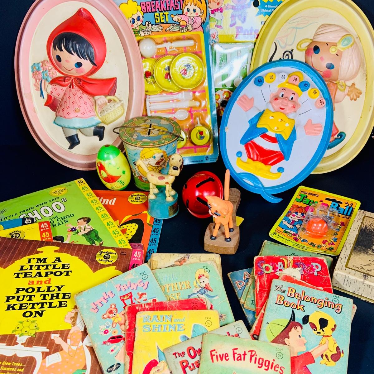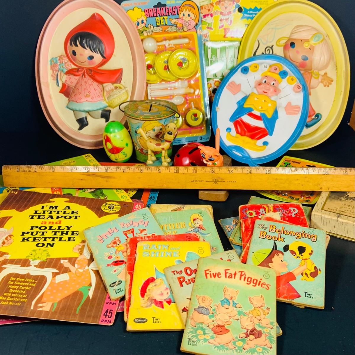 LOT 110: For the Vintage Child in All of Us - a Collection Whitman Paperback Childrens Books, Golden Records 45's Toys in Original Package, Push Puppets, and Much More