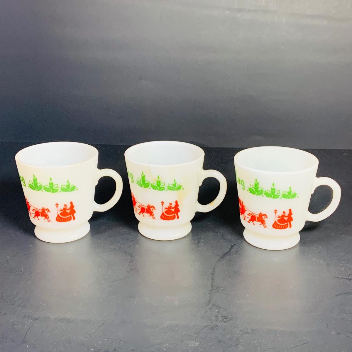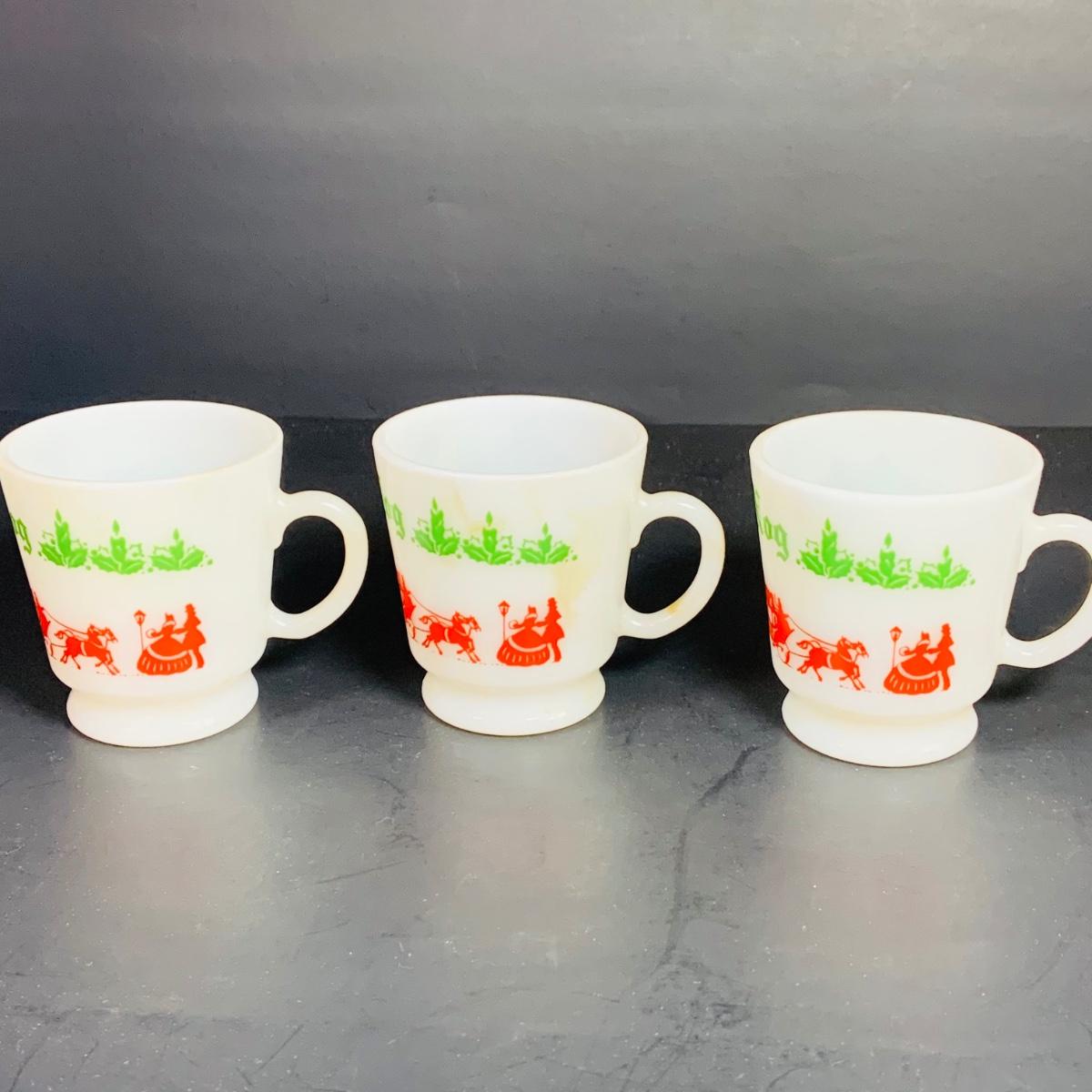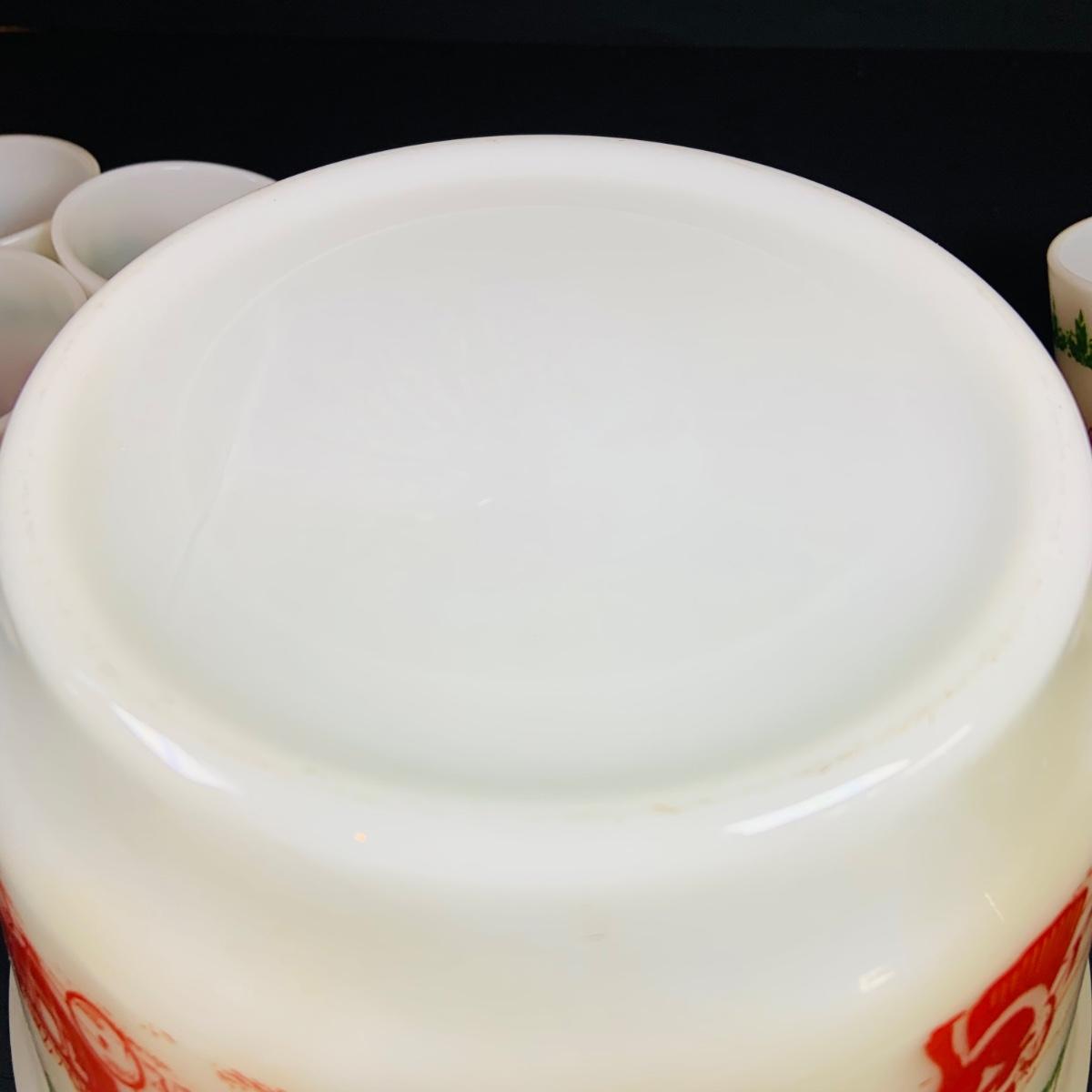 LOT 111: Vintage Holiday Decorated Milk Glass Egg Nog Serving Bowl and Set of Eight (8) Matching Mugs