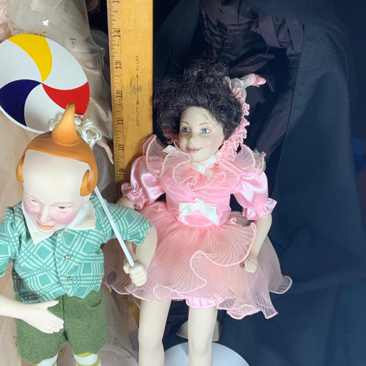 LOT 113: Collection of Wizard of Oz Franklin Heirloom Hand Painted Porcelain Dolls -Wicked Witch of the West, Glinda, Lollipop Boy and Lullaby Girl, and Enesco/ San Fracisco Music Box Co Music Box