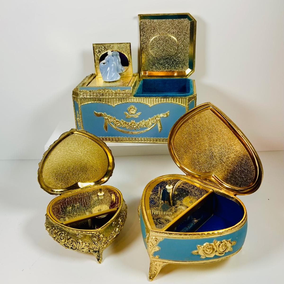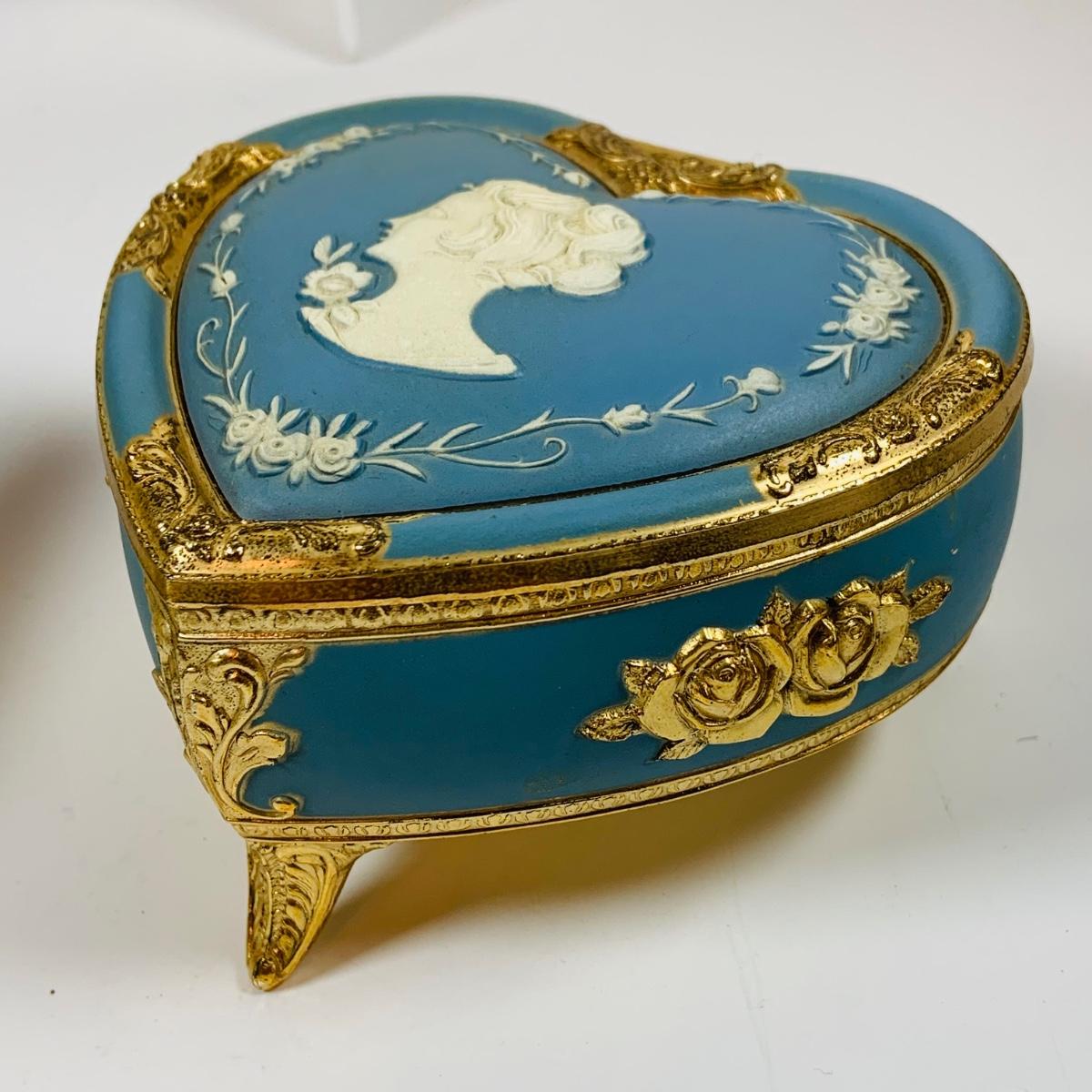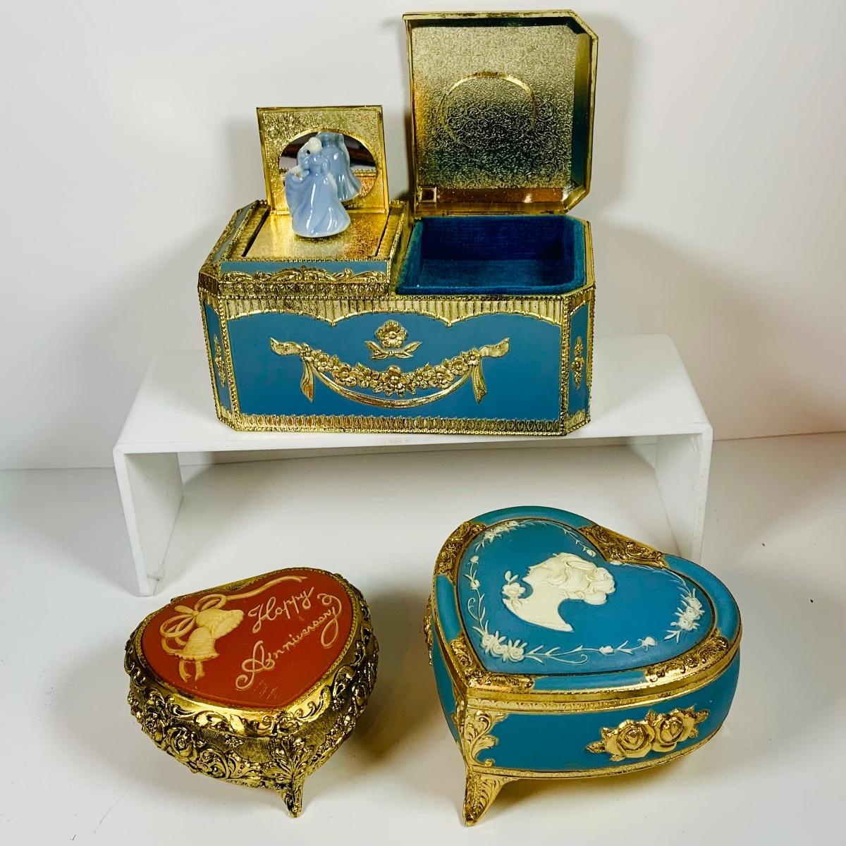 LOT124: Collection of VIntage Victorian Inspired Music Boxes/Trinket Boxes - San Francisco Music Box Co "Lara's Theme" Pop Up Music Spinning Figure Music Box and Two (2) Heart Shaped Cameo Boxes