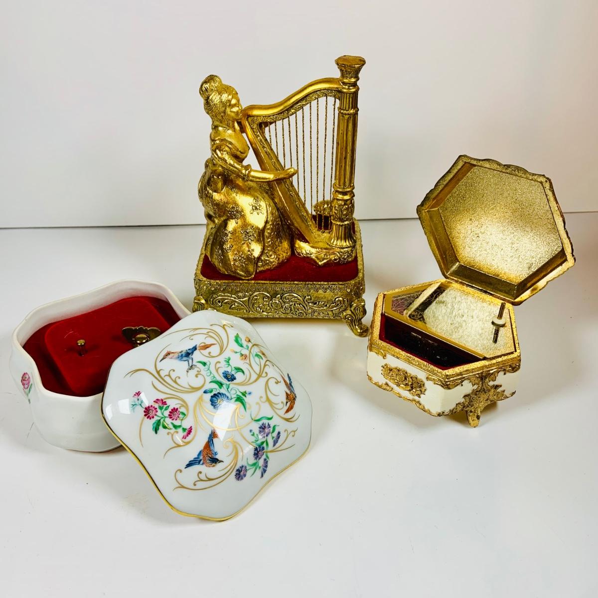 LOT125: Westland Golden Woman Playing Harp Music Box, Reuge Limoges Music Box with Swiss Musical Movment and One More Victorian Style Music Box