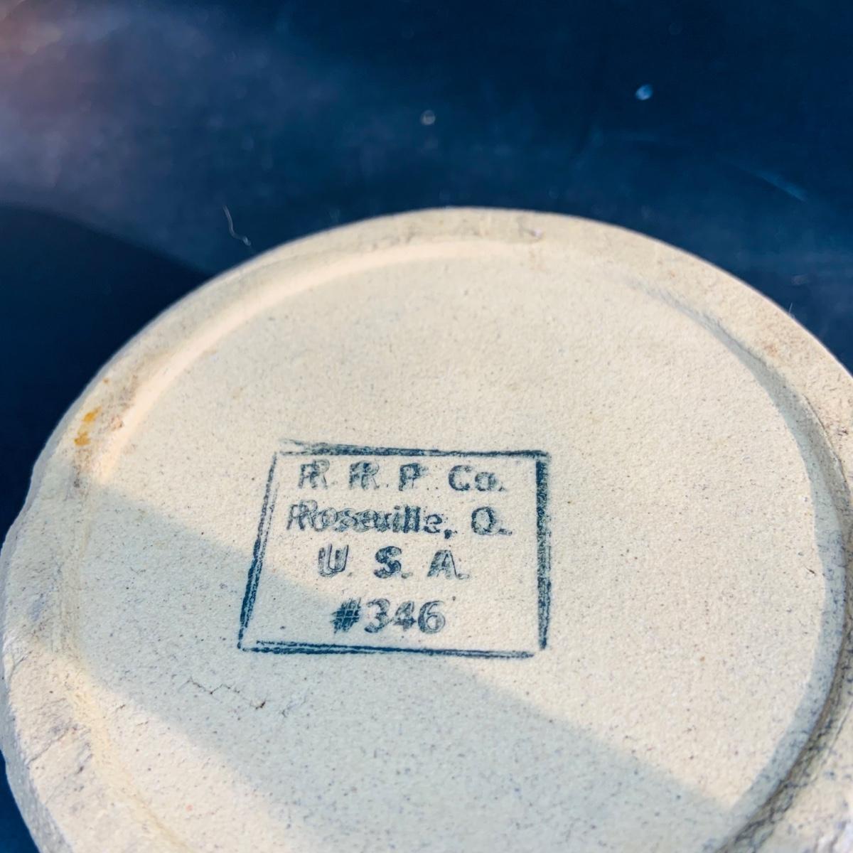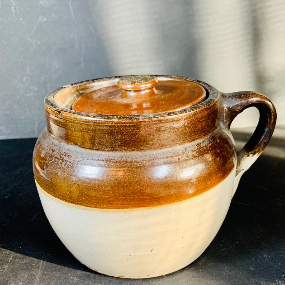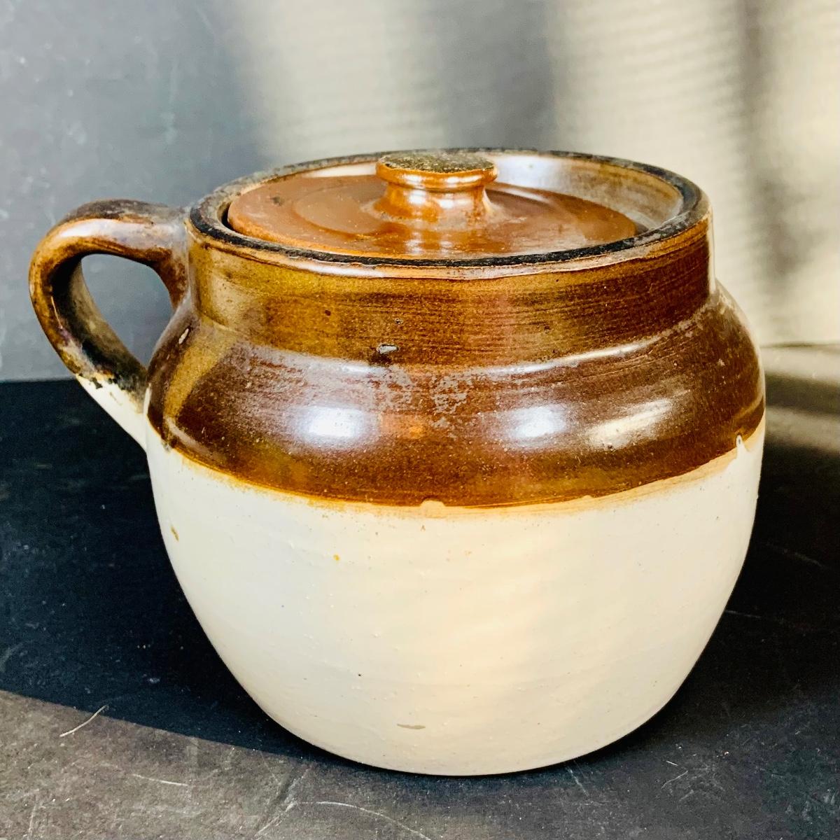 LOT 135: Vintage Small Roseville Crock #346, Art Deco Ceramic Jug with Cork and Stoneware Bean Pot with Lid