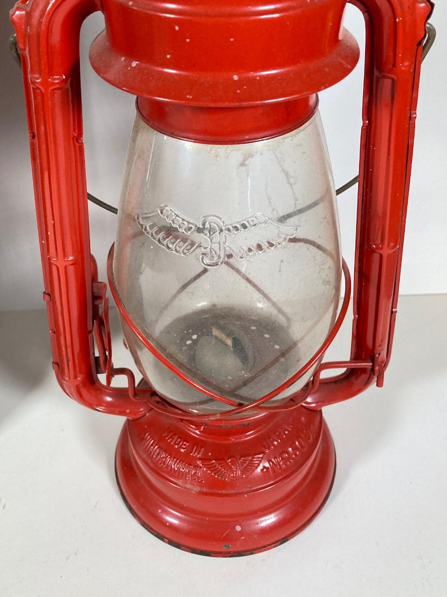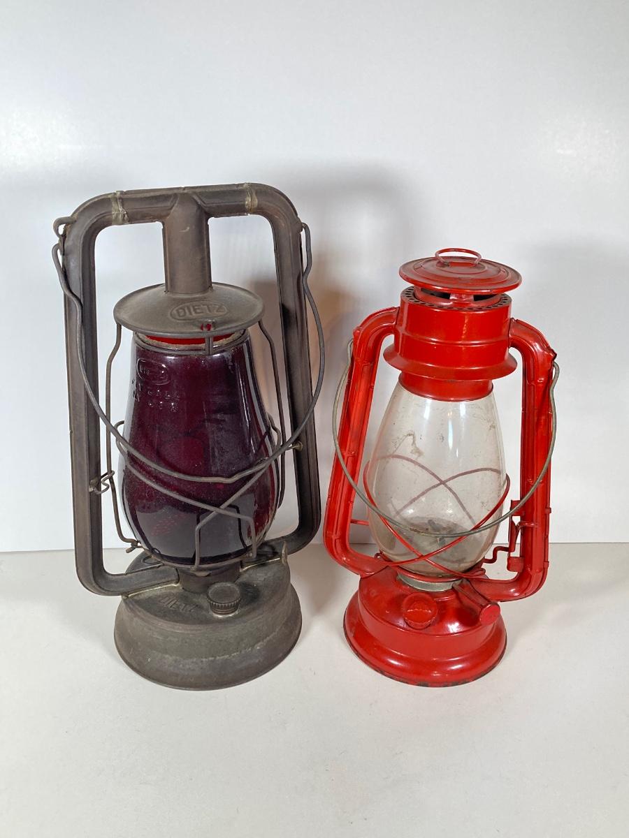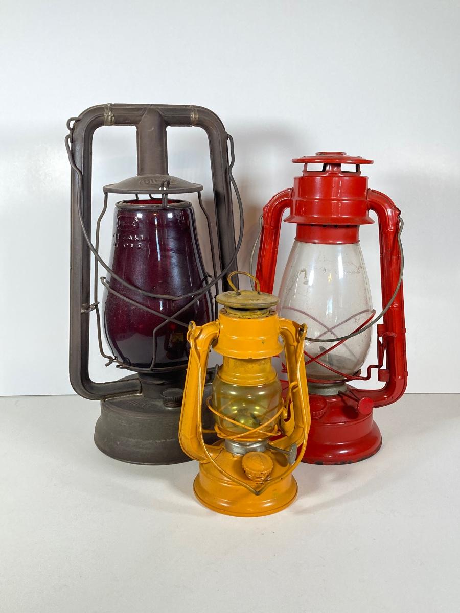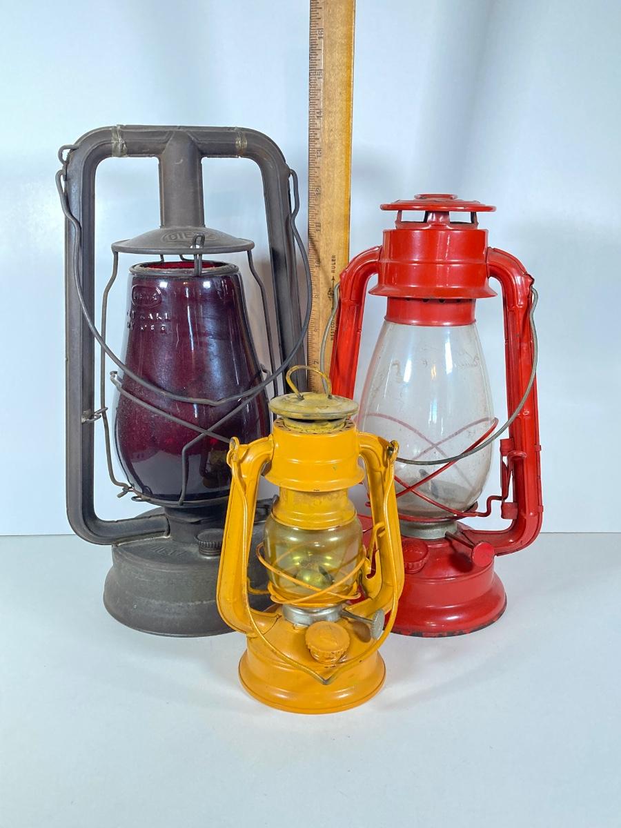 LOT 138: Three Oil Lanterns - Dietz (Gray) and Winged Wheel Brand (Red and Yellow)