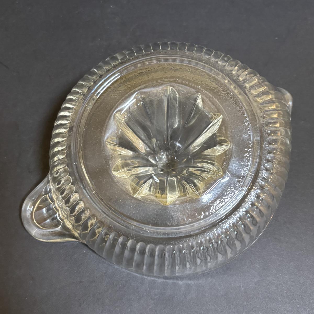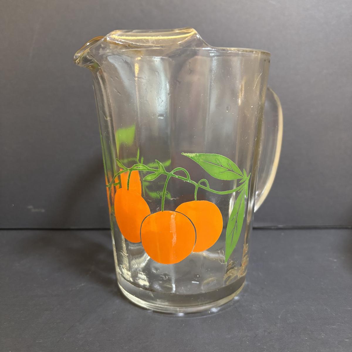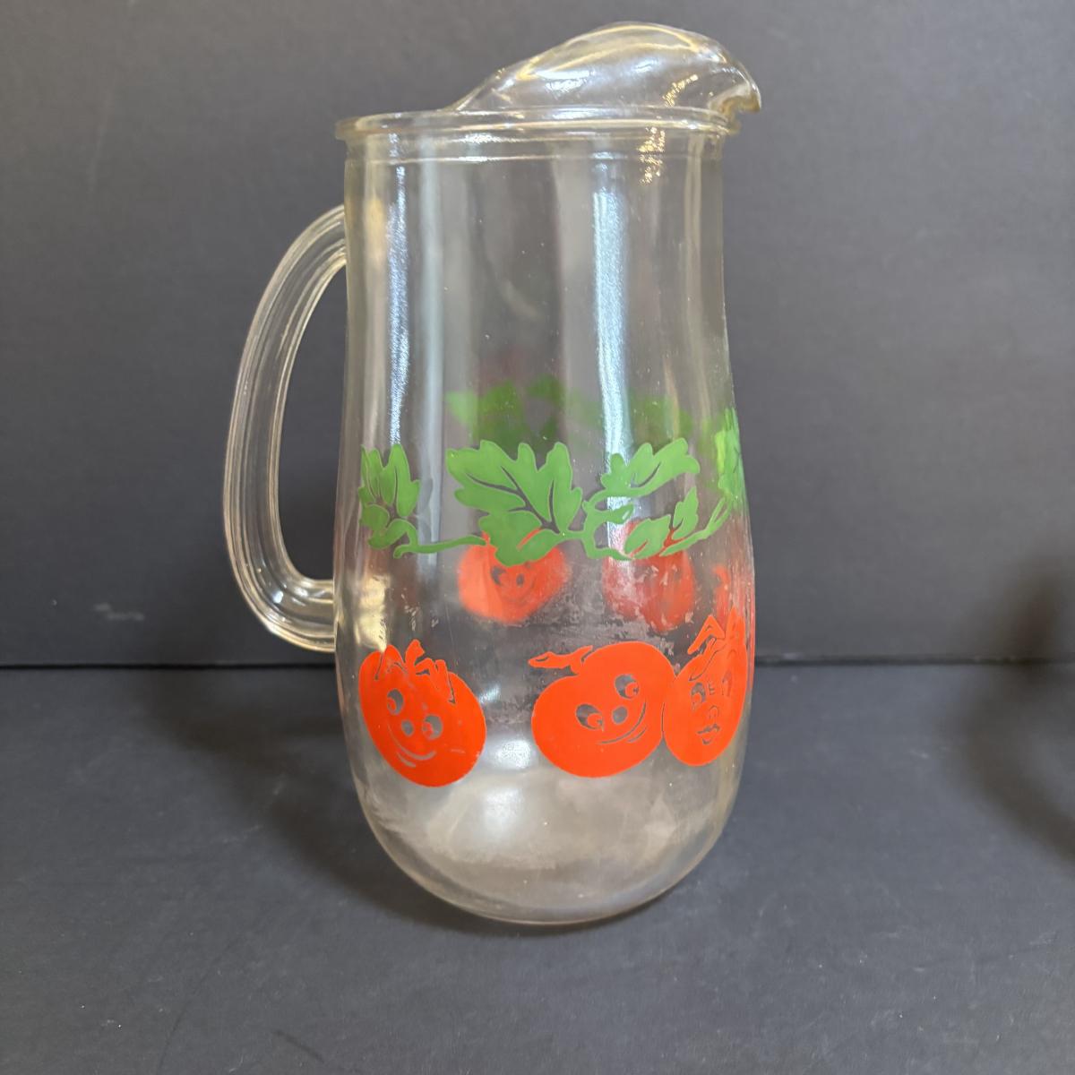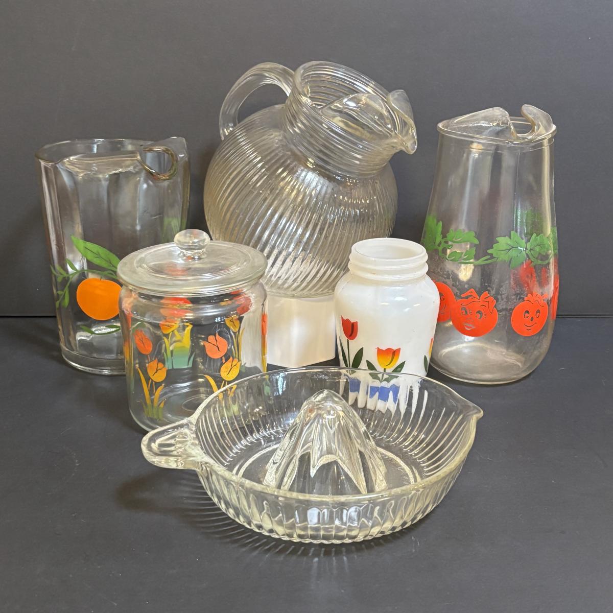 LOT 195: Vintage Orange Juice Serving Pitcher, Tomato Juice Serving Pitched, MCM Tilted Clear Pitcher, Anchor Hocking Tulip Jar w/Lid, Clear Glass Ribbed Juicer/Reamer & More