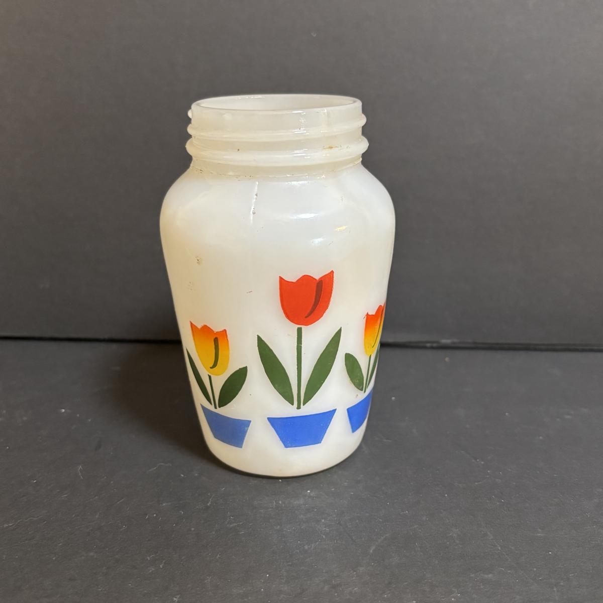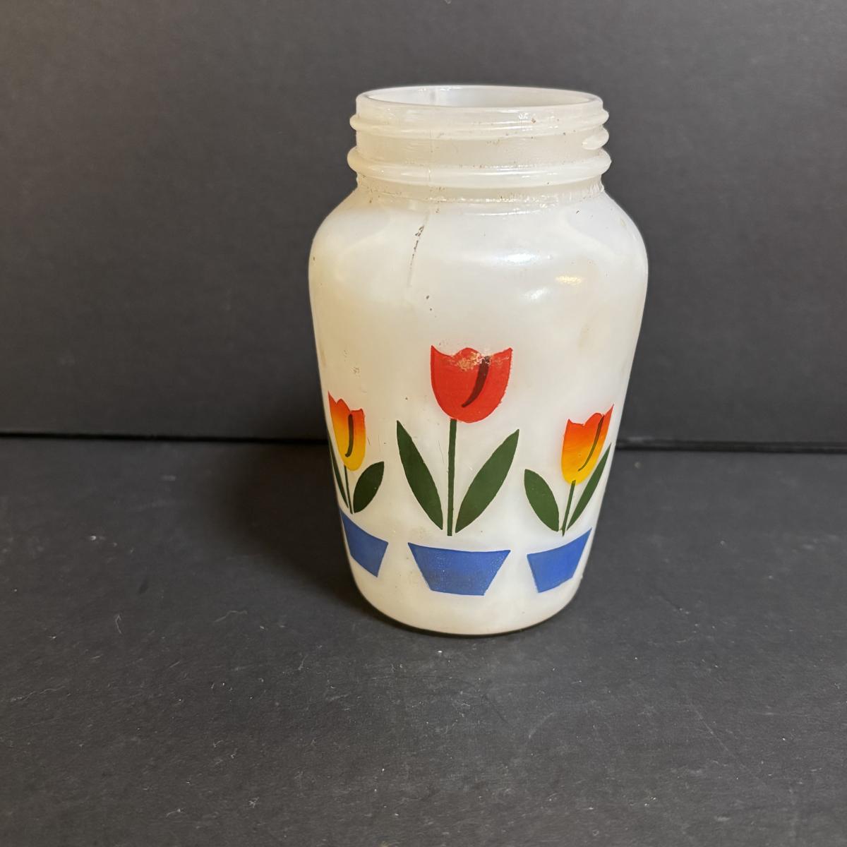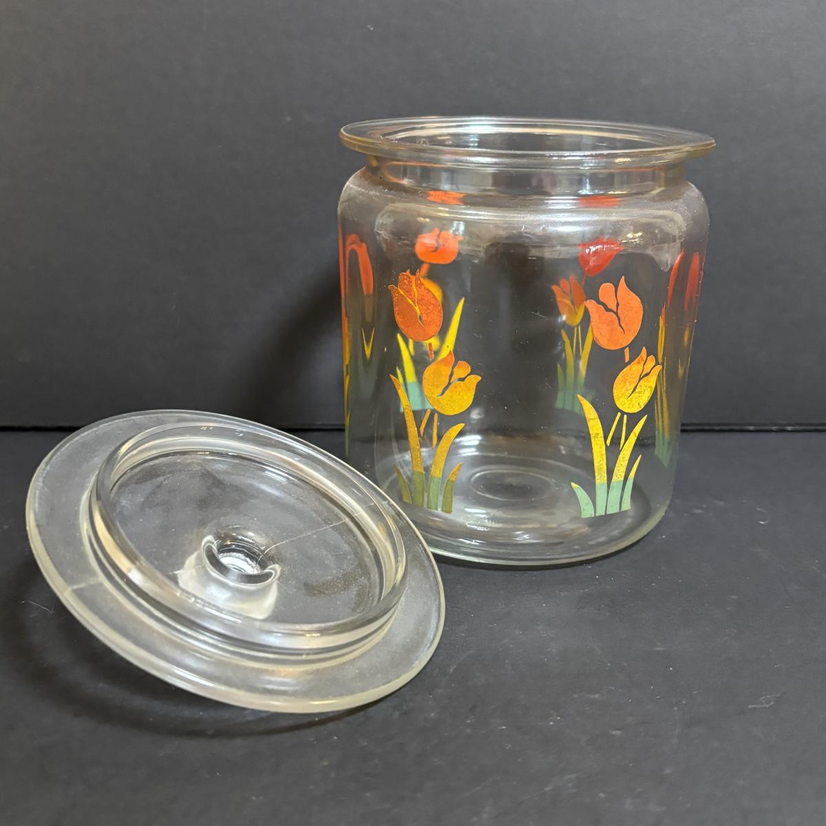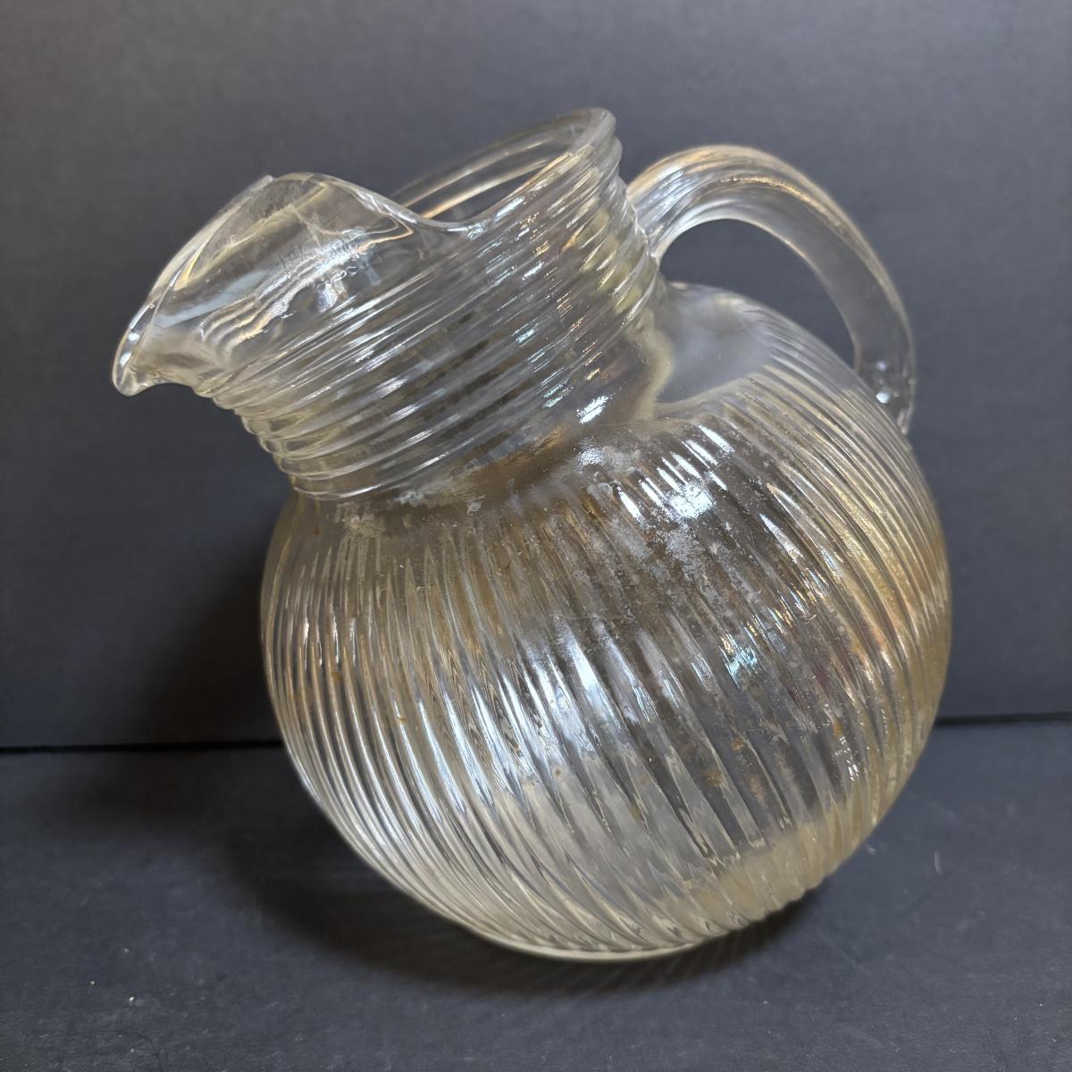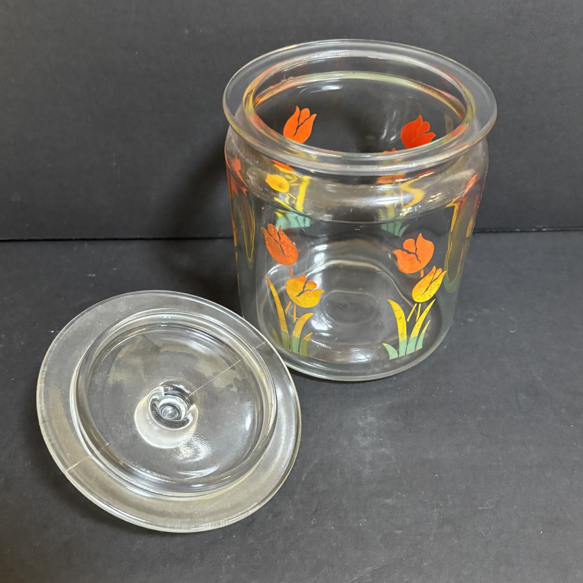 LOT 195: Vintage Orange Juice Serving Pitcher, Tomato Juice Serving Pitched, MCM Tilted Clear Pitcher, Anchor Hocking Tulip Jar w/Lid, Clear Glass Ribbed Juicer/Reamer & More