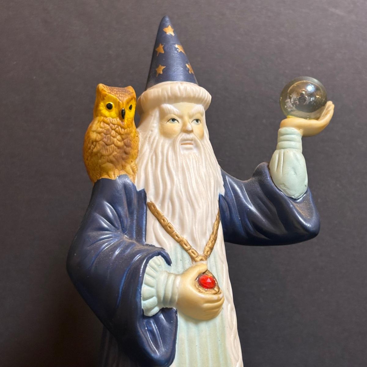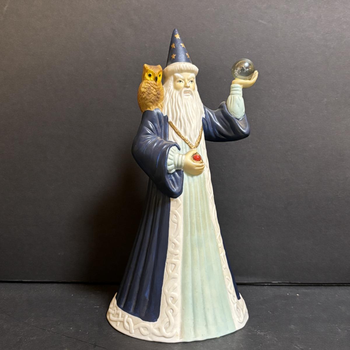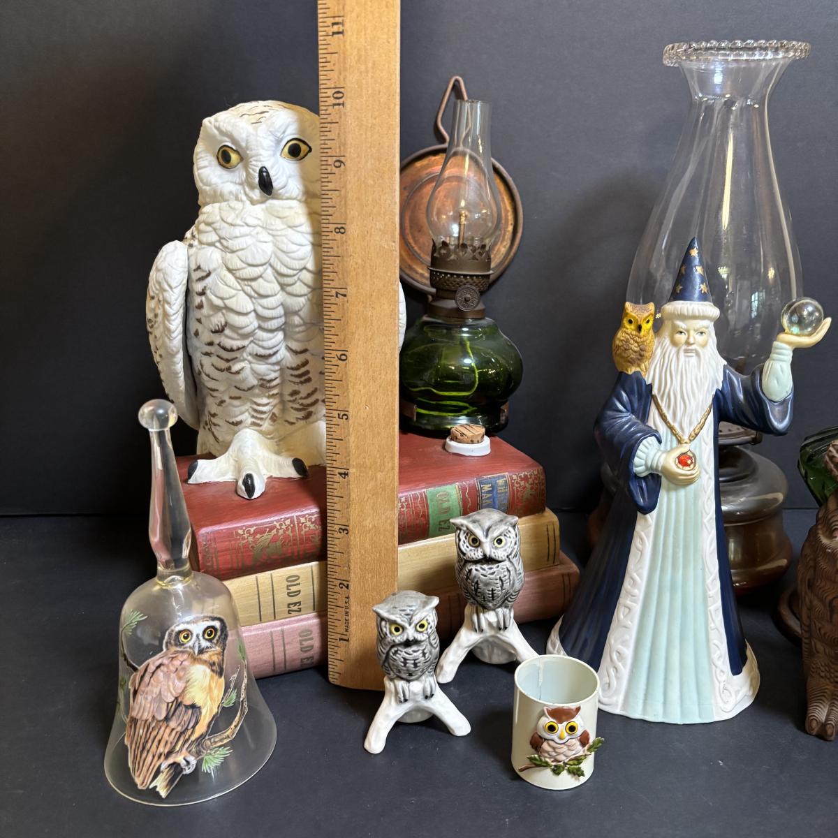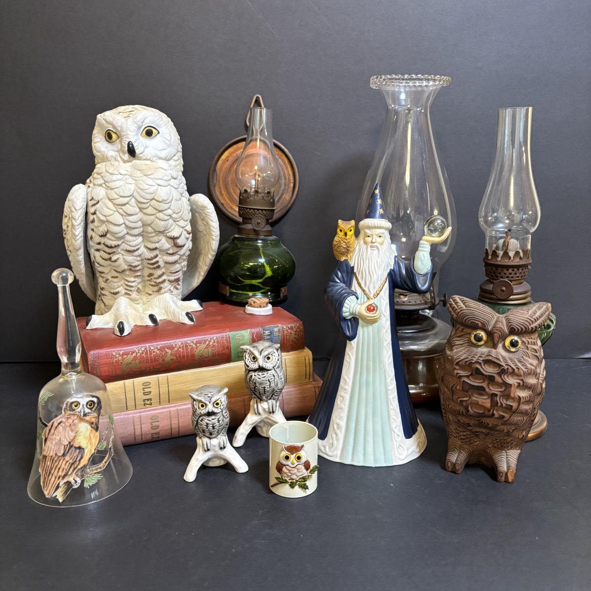 LOT 198: Vintage Wizard/Merlin San Francisco Music Box, Goebel Owls, Snow Owl Decanter, 3 Oil Lamps, Wooden Carved Owl & More
