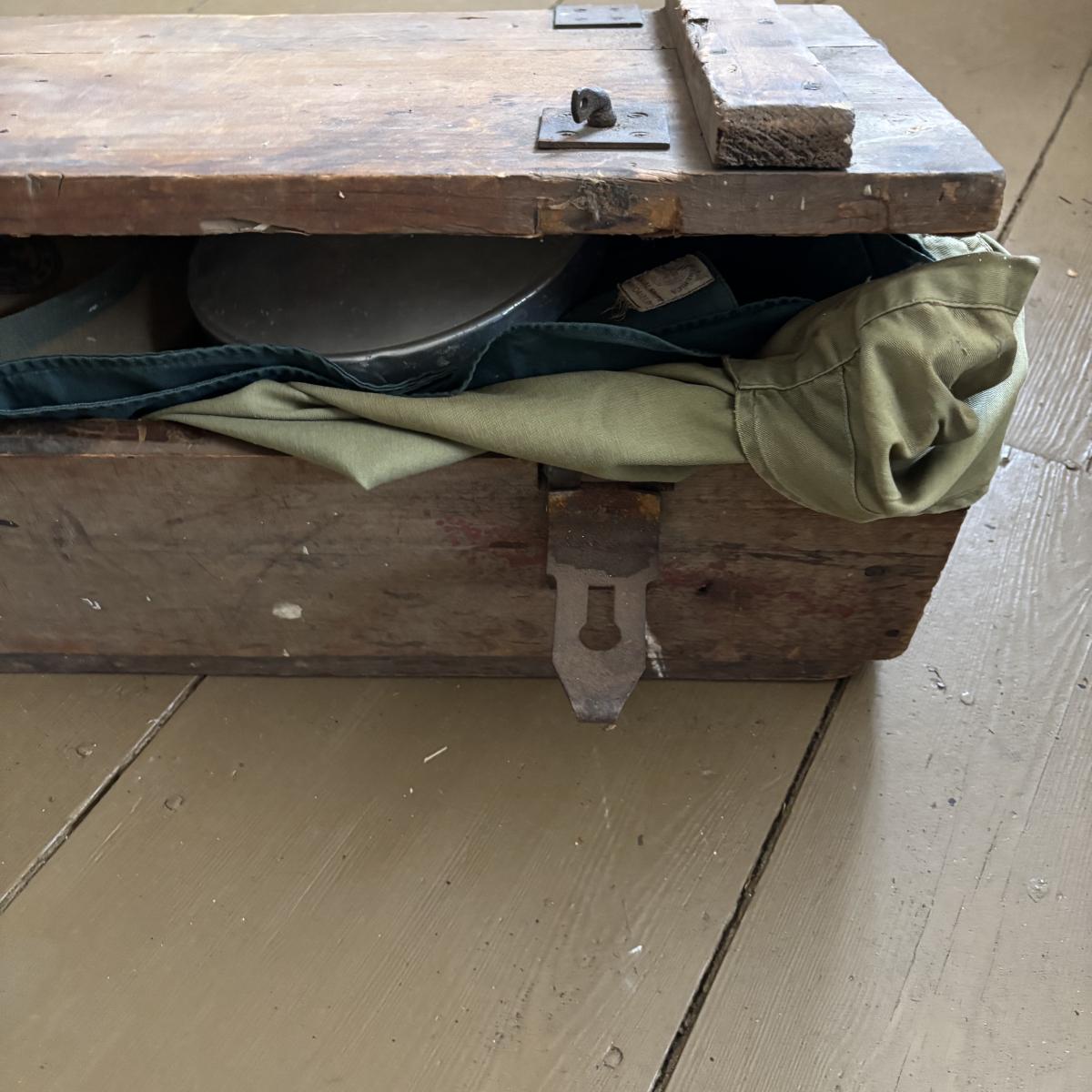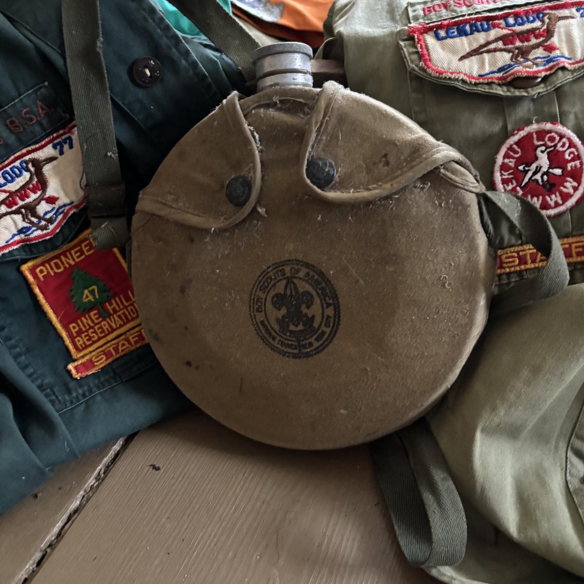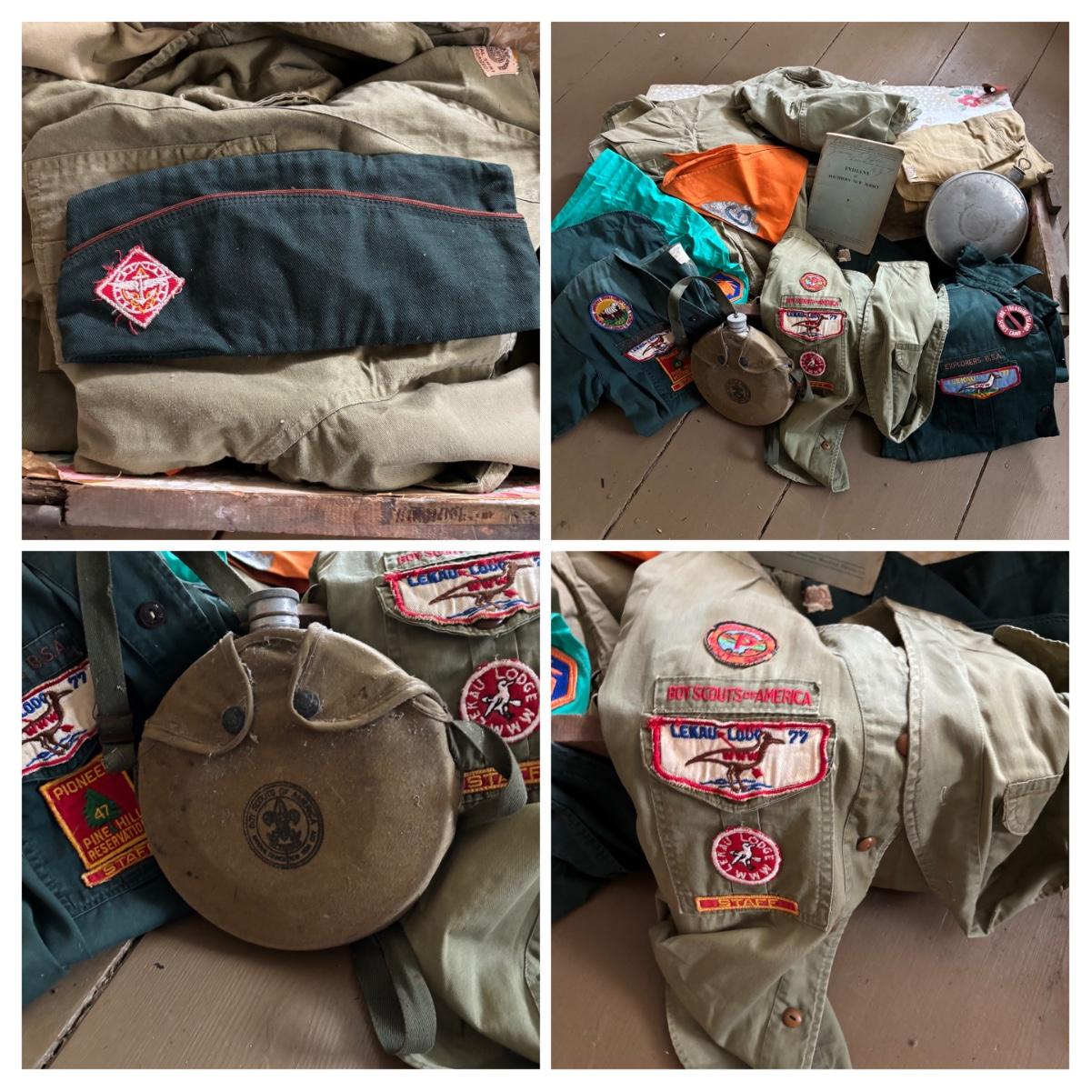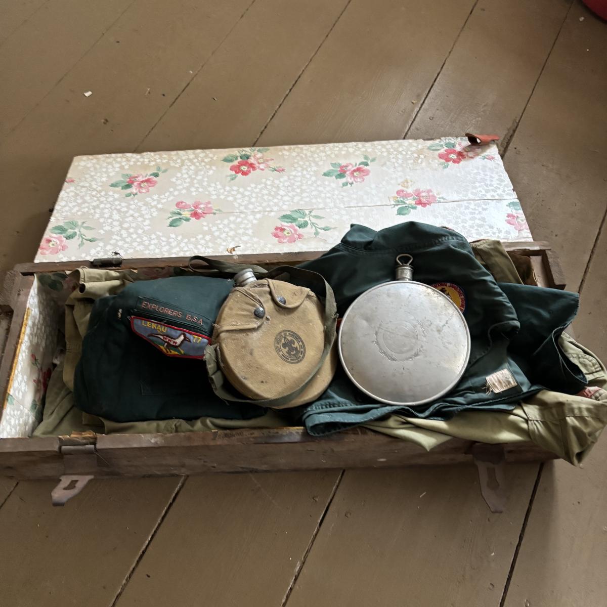 LOT 802: Boy Scout of America Collection: Uniforms, Canteens & Wooden Footlocker