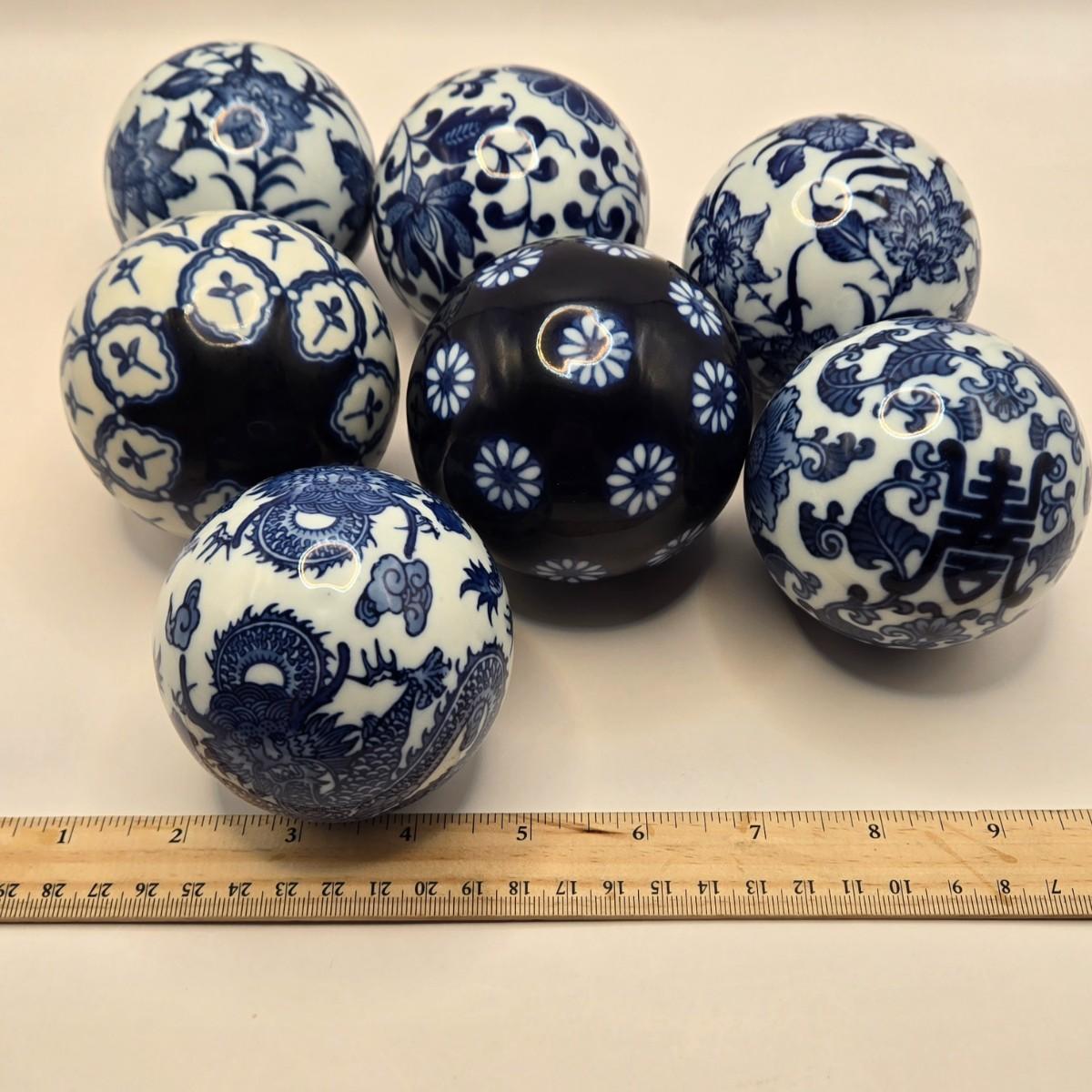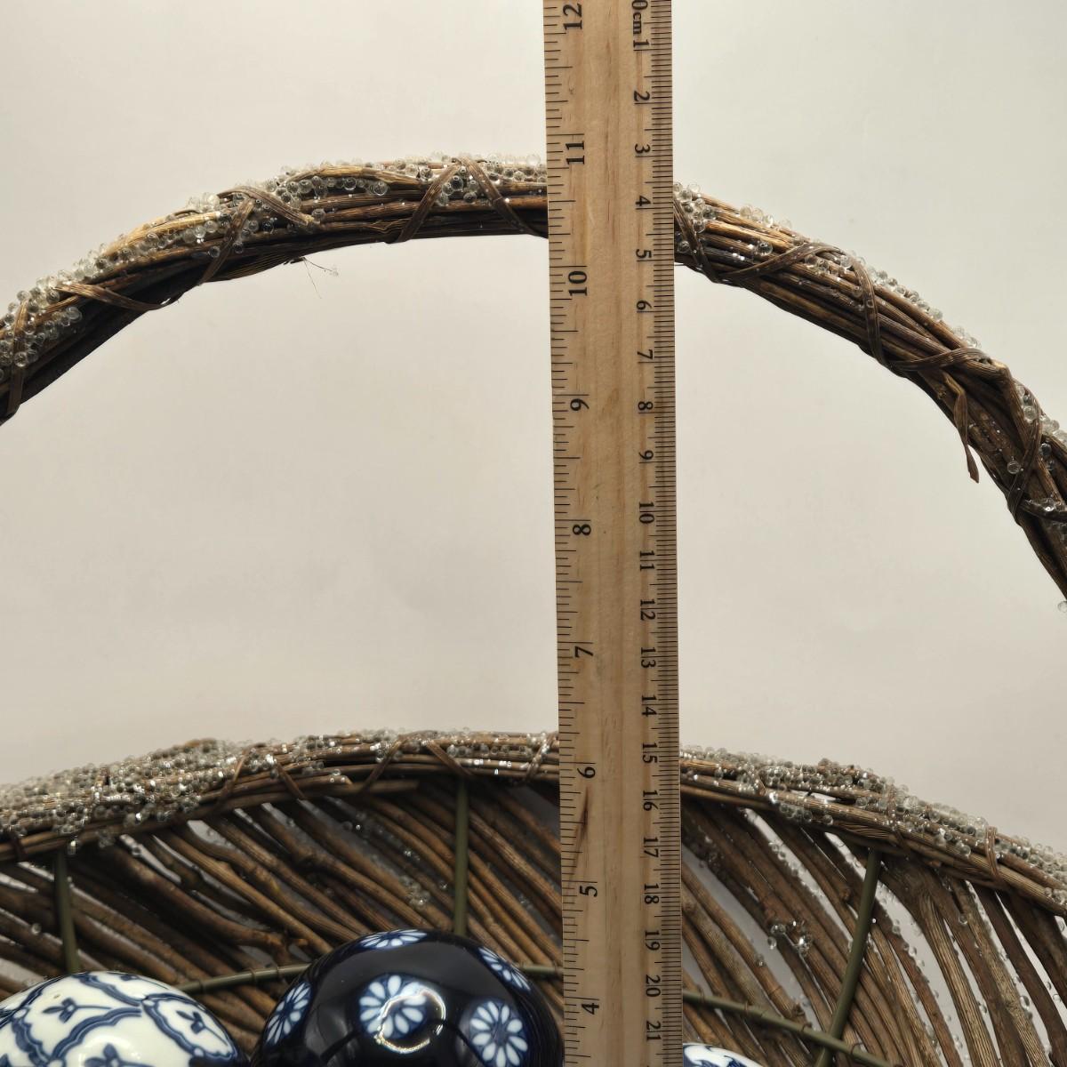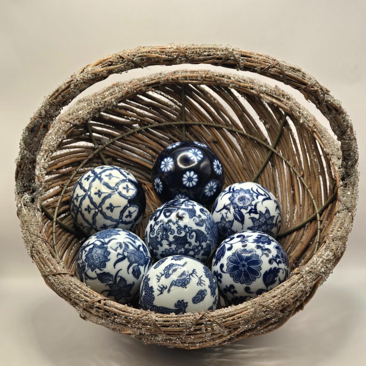 LOT 10L: Wicker Basket with Seven Blue and White Ceramic Decor Balls