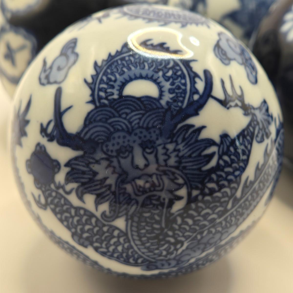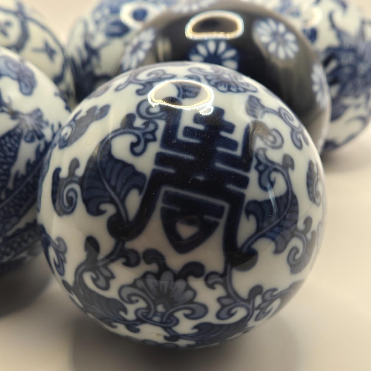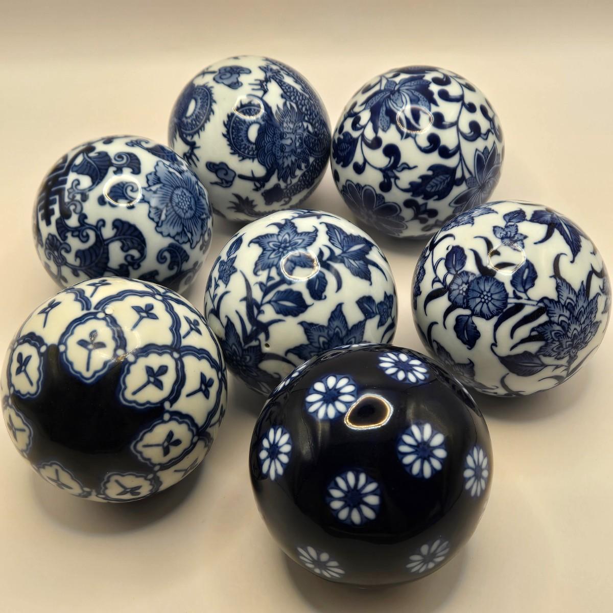 LOT 10L: Wicker Basket with Seven Blue and White Ceramic Decor Balls