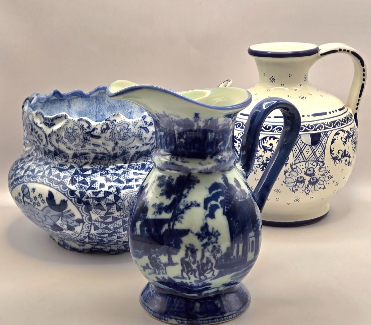LOT 14L: Hand Made Pitcher with Makers Wording on Bottom, Victoria Ware Pitcher, & Unknown Maker Two Handled Bowl