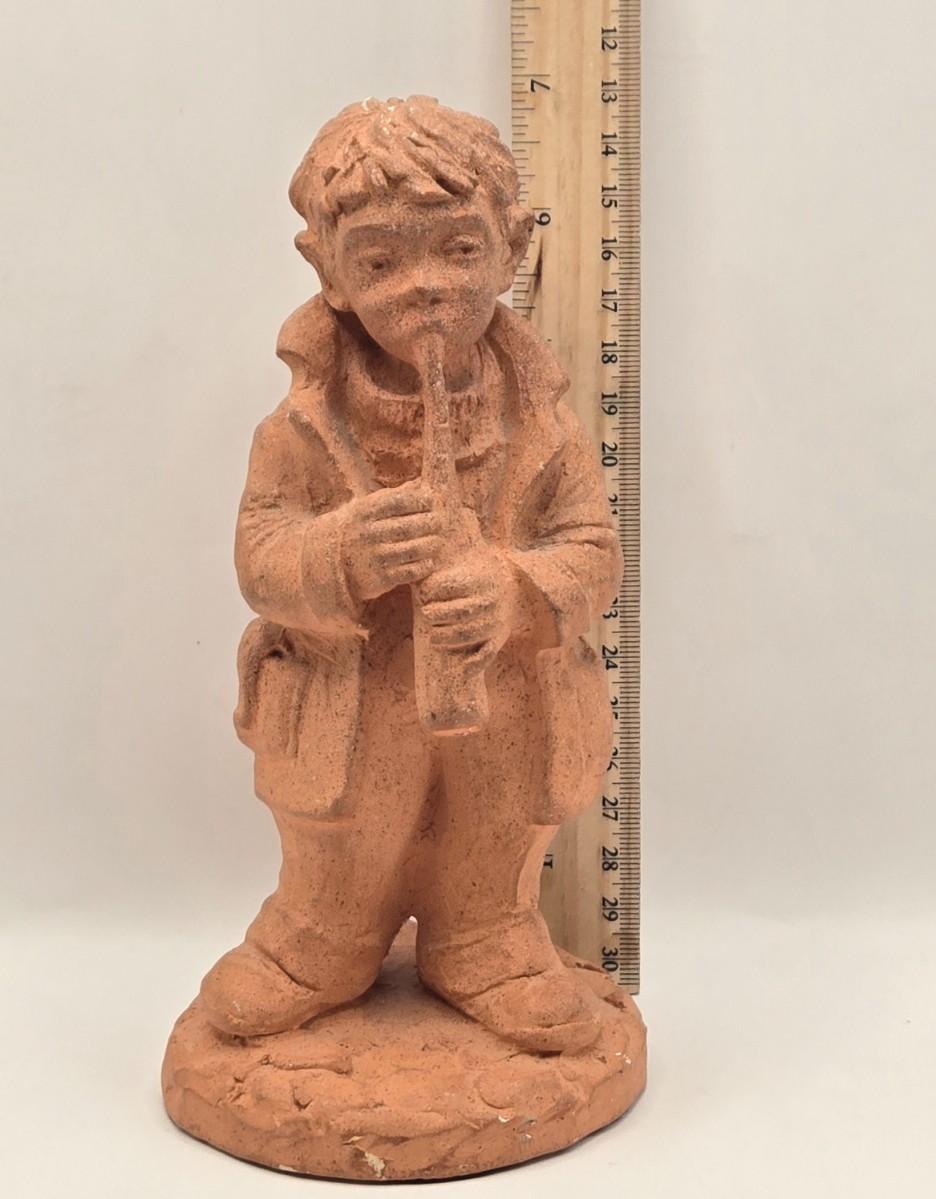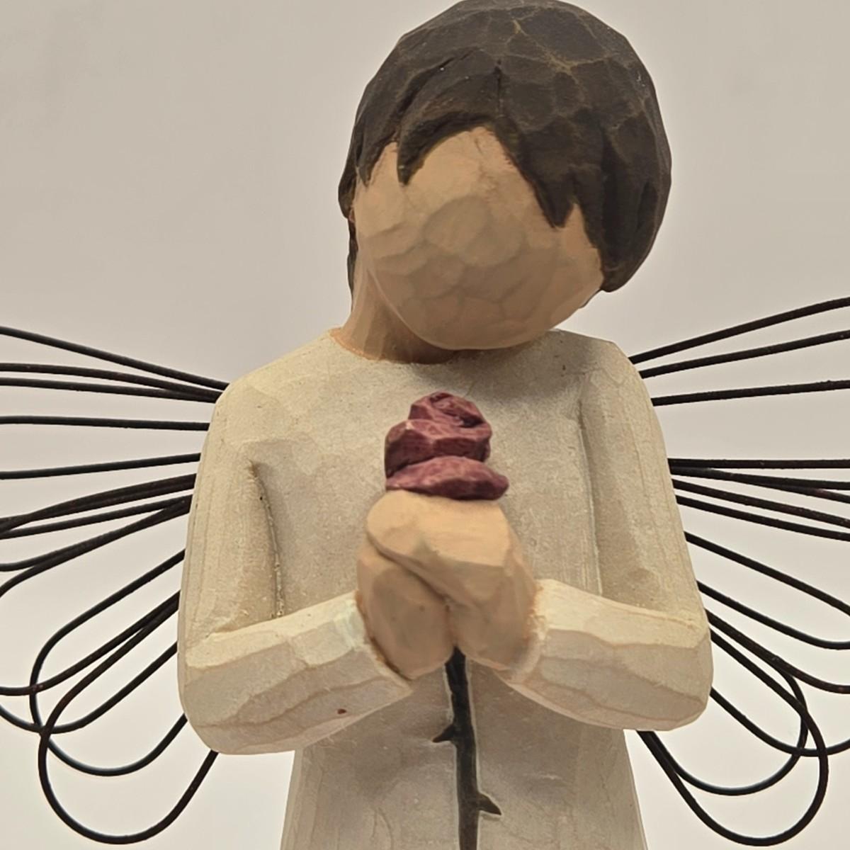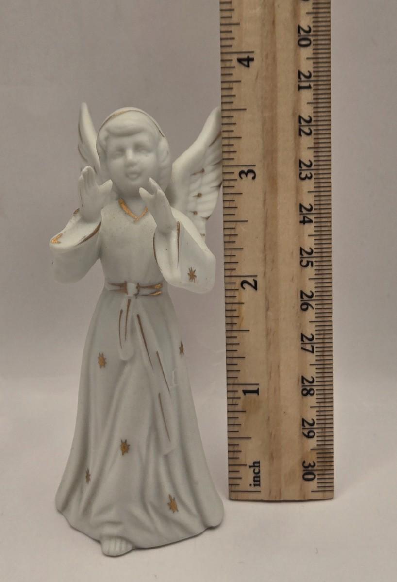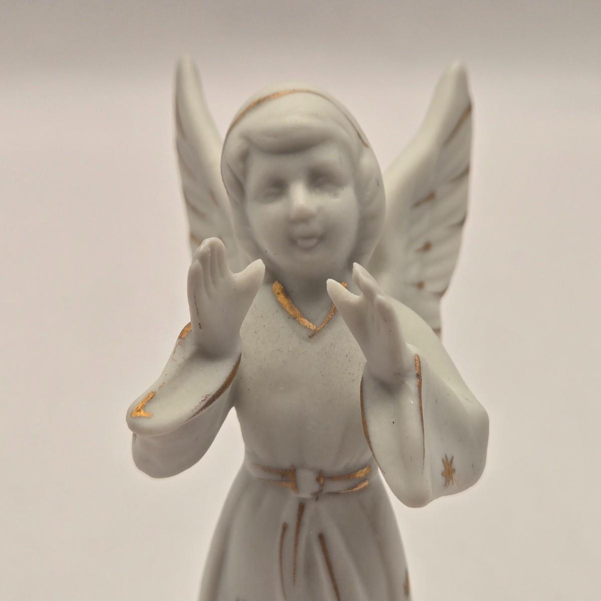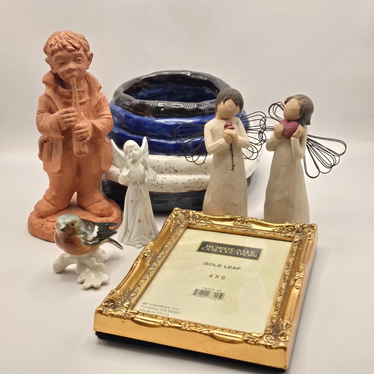LOT 17L: Shades of Blue & White Bowl; Appears to be Hand Made, Boy Playing Flute Figurine, Small Schmid Brothers Angel, Two Willow Tree Angel Figures, Gold Leaf Picture Frame, & Goebel Bird Figure