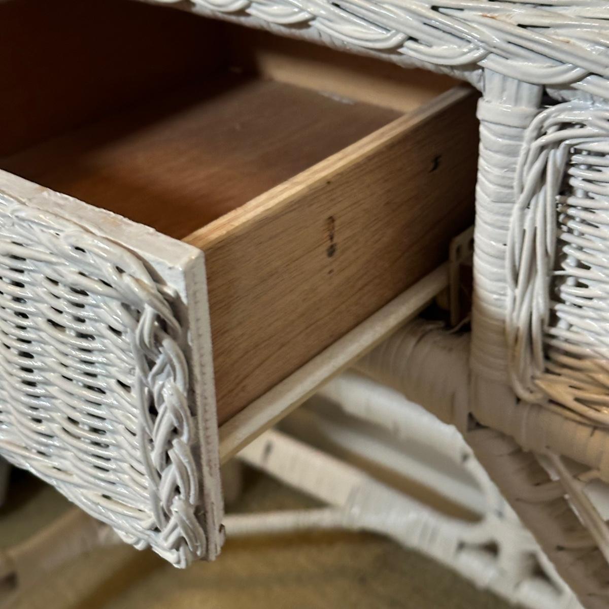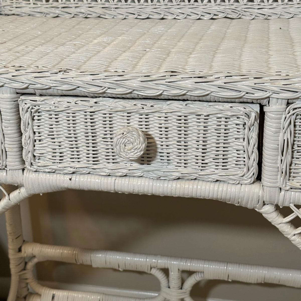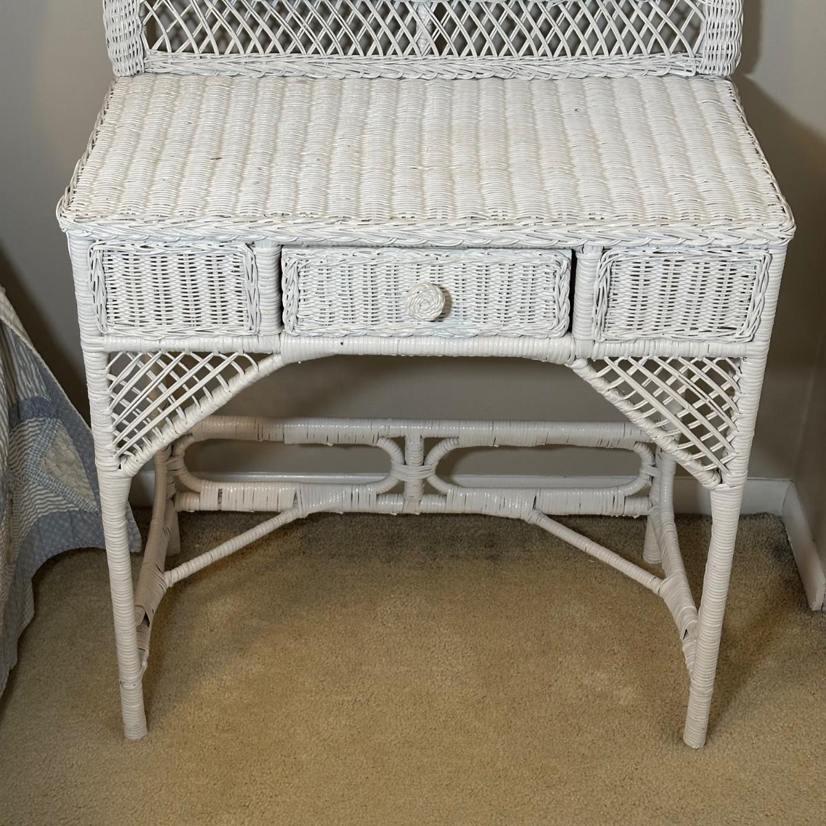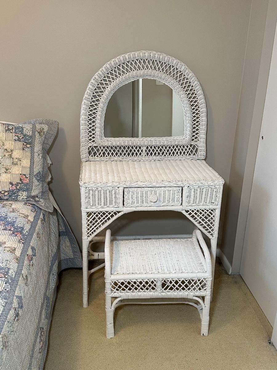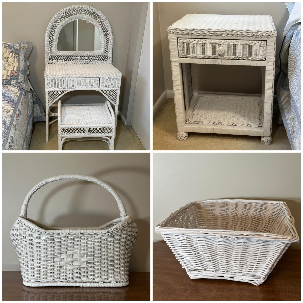 LOT 46B: White Wicker Vanity, Bench, Side Table & Basket Collection