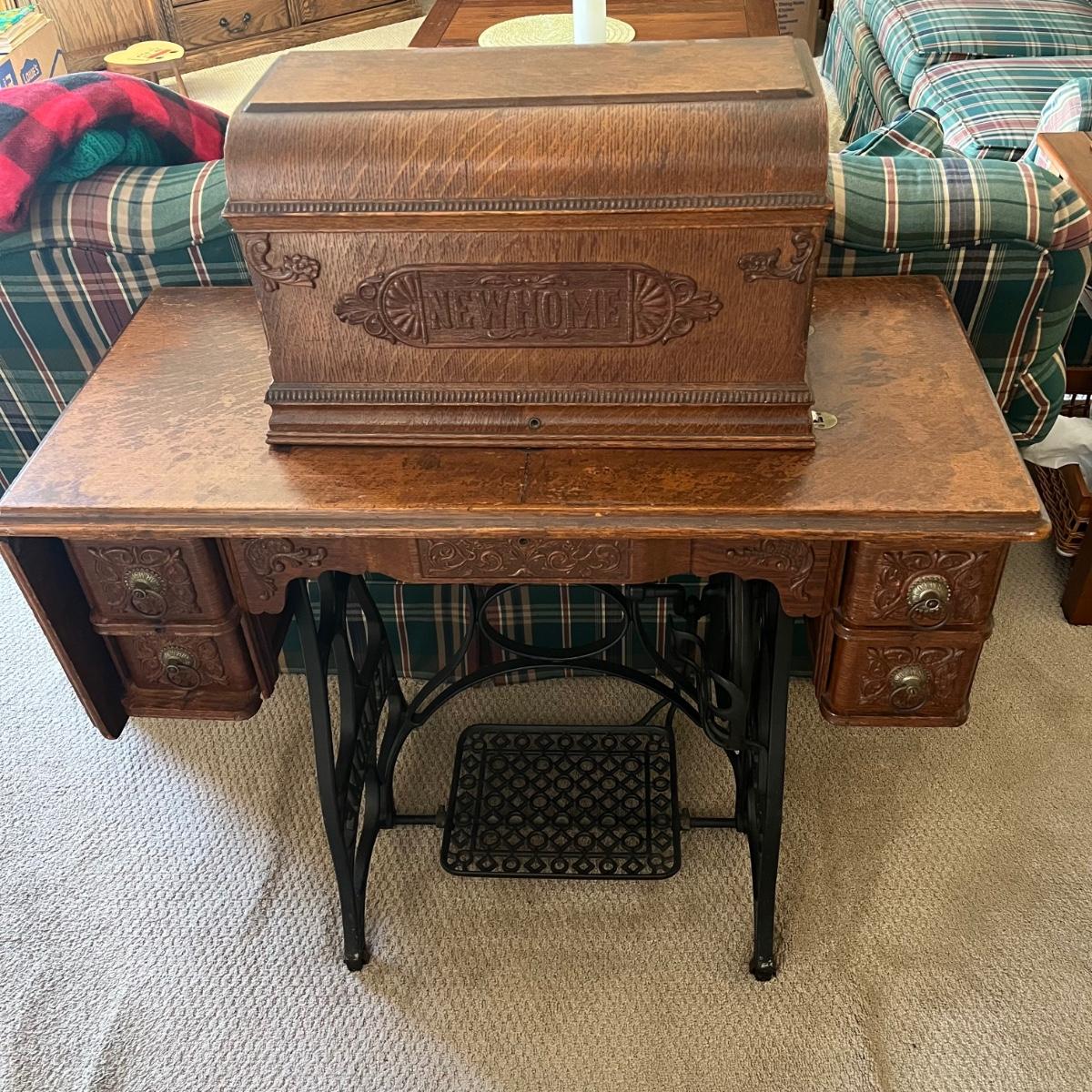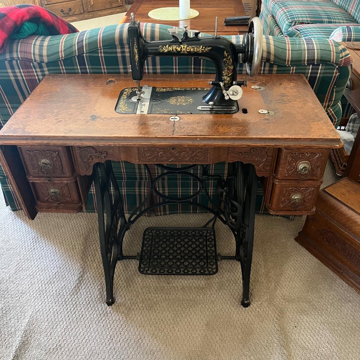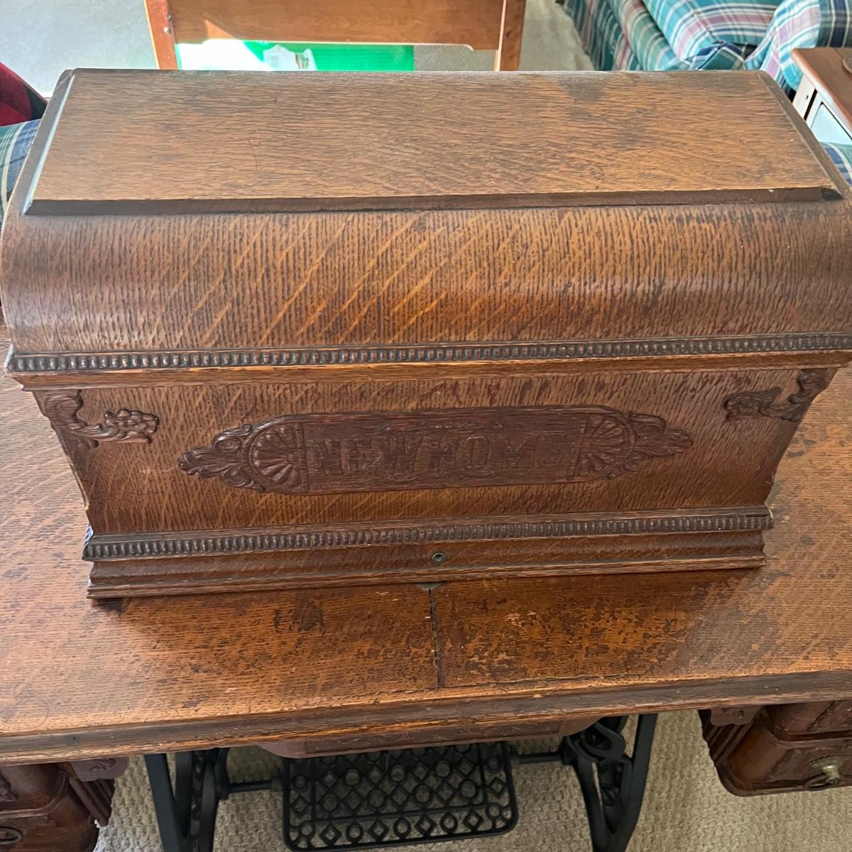 LOT 72F: Antique New Home Sewing Machine w/ Table and Cover