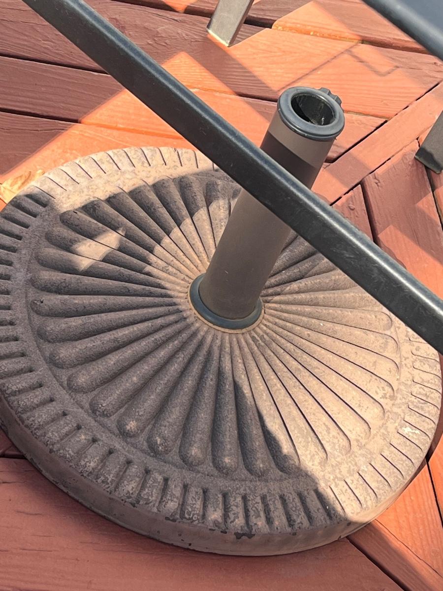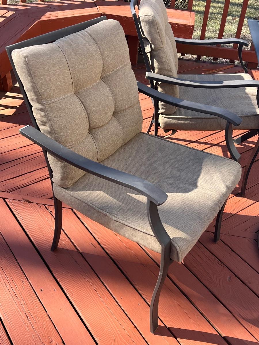 LOT 73P: Patio Table w/ 6 Chairs (2 Swivel), Cushions and Umbrella Stand
