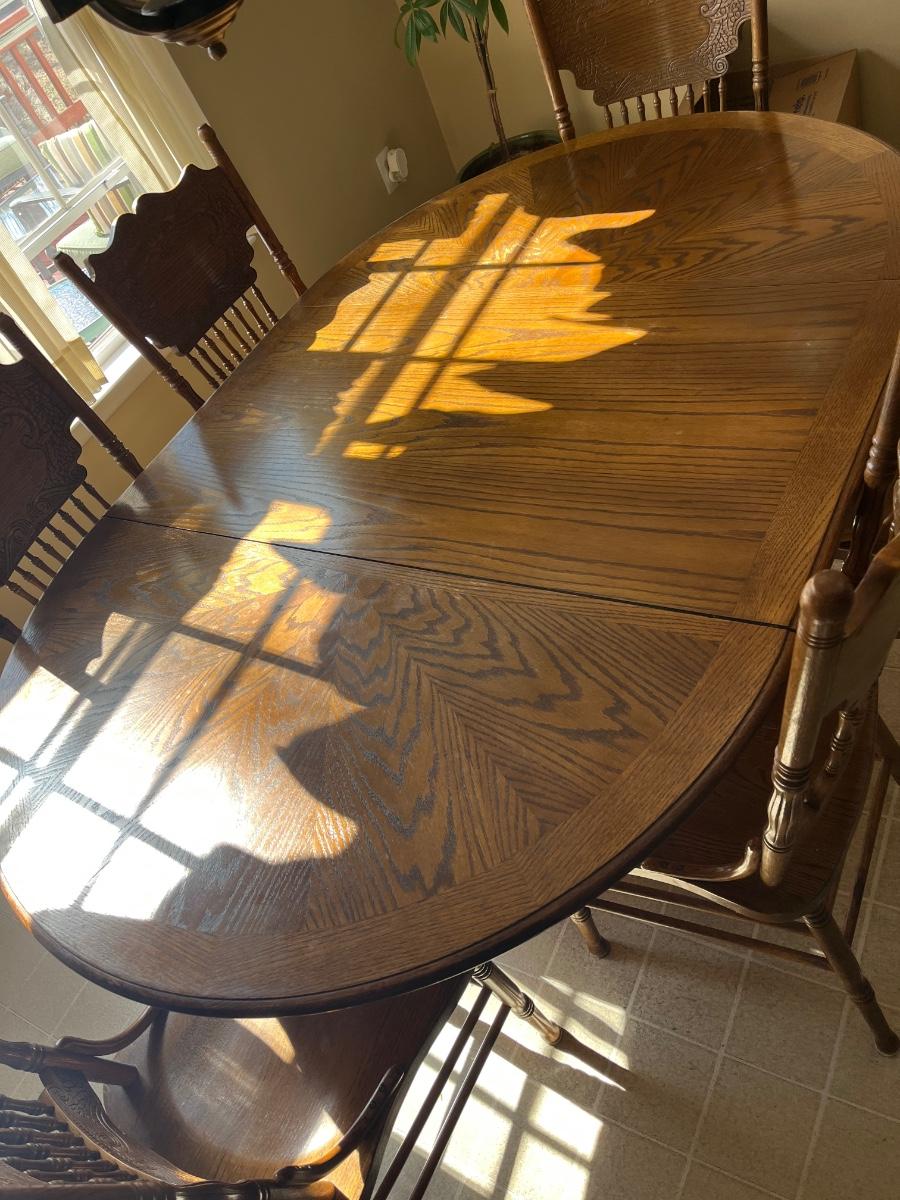 As configured with 2ft removable leaf, table is 6 ft x 4 ft. Can also be 4 ft round.