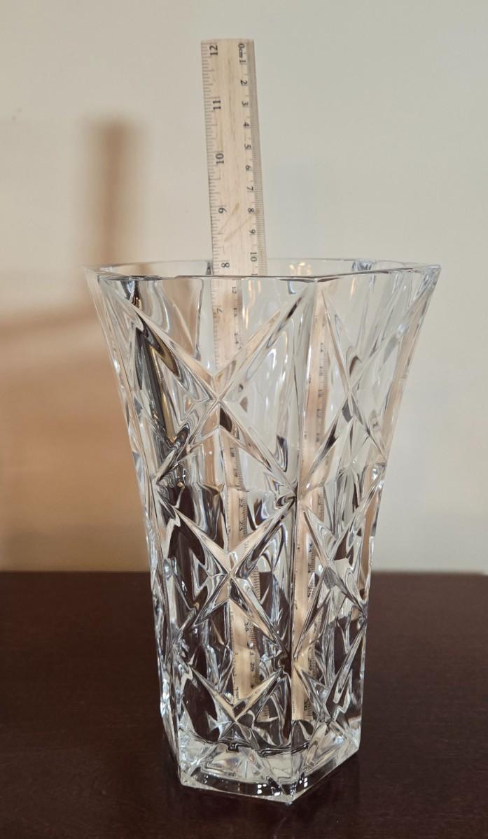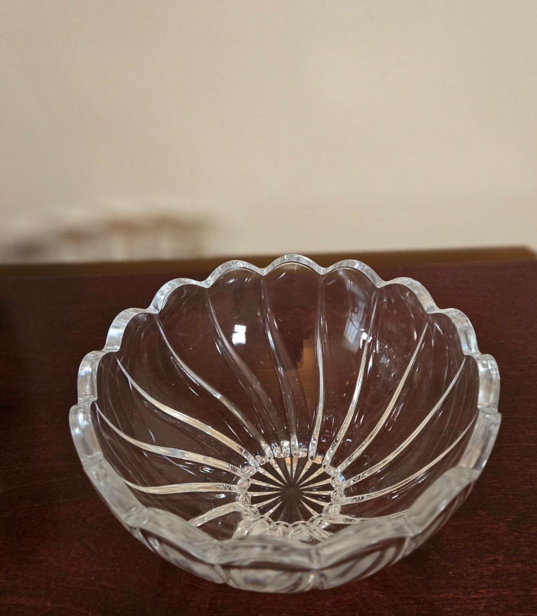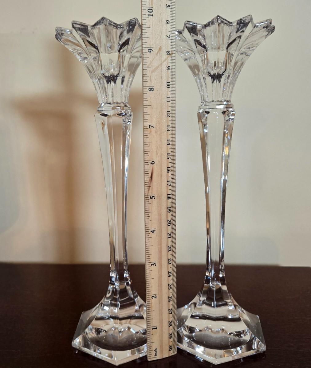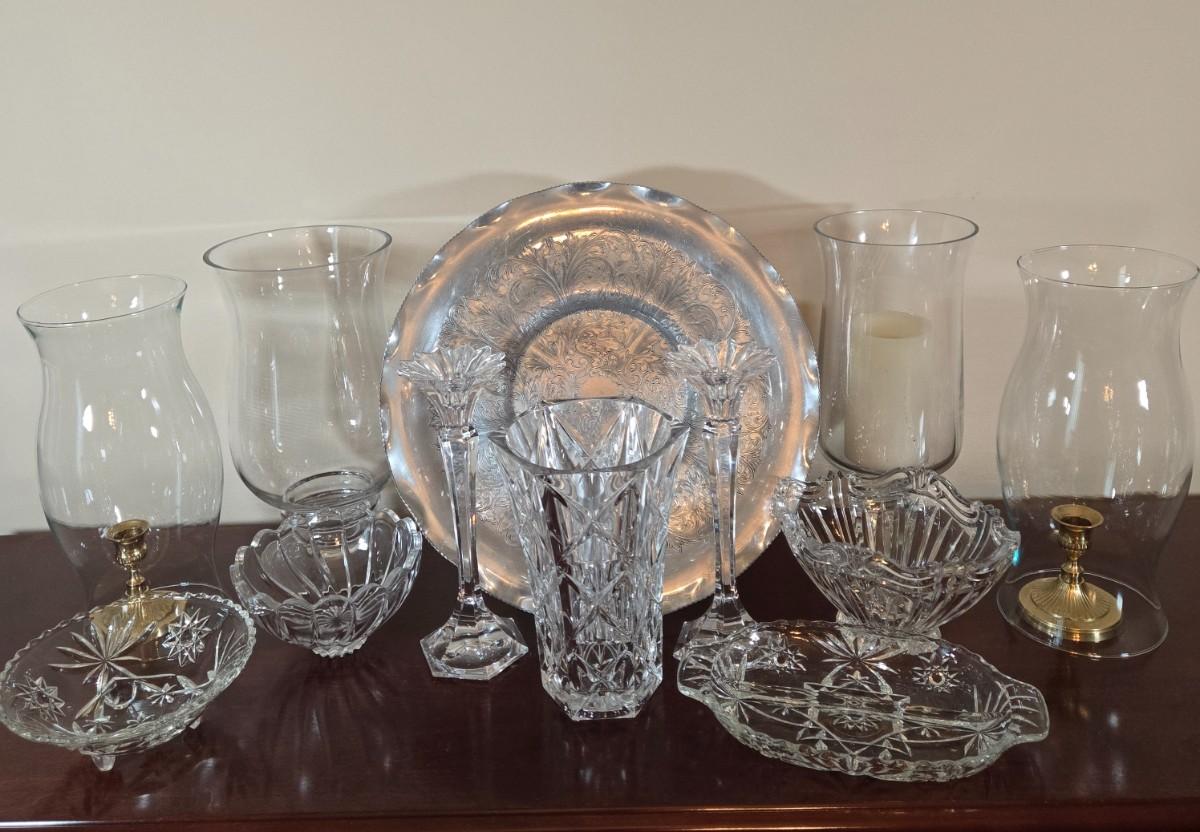 LOT 80L: Hand Wrought Aluminum Platter, Crystal Candy Dishes, Vase , & Candle Stick Holders, & Variety of Hurricane Candle Holders