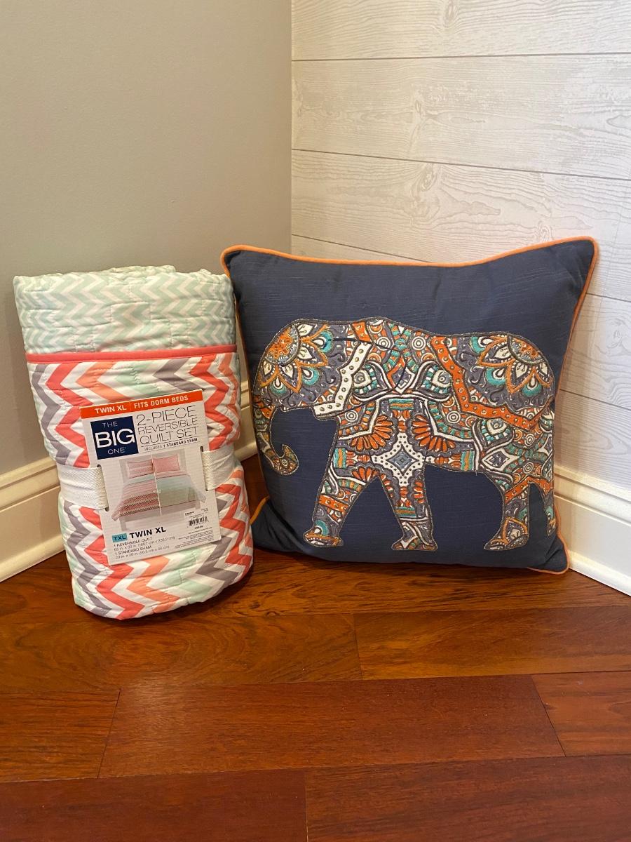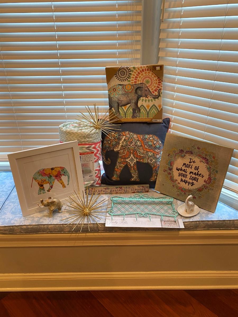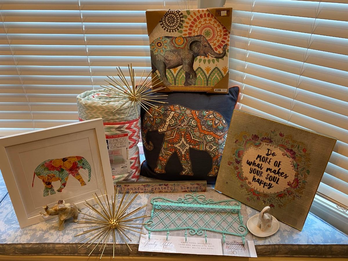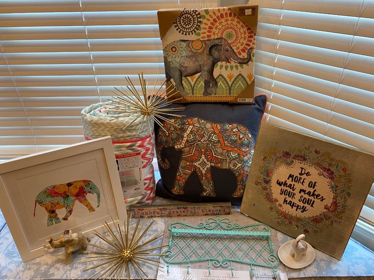 Twin bedspread new in original packaging, elephant wall art, jewelry hanger, gold wall decor, elephant ring holder and elephant framed print.