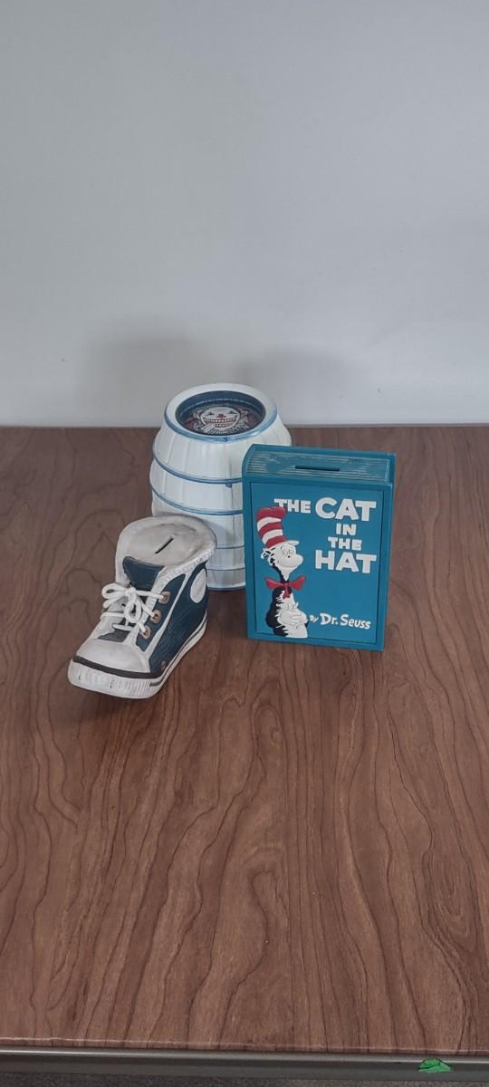 LOT 24B: Novelty Coin Banks: Vintage Tennis Shoe, Clown Barrel & Cat in the Hat