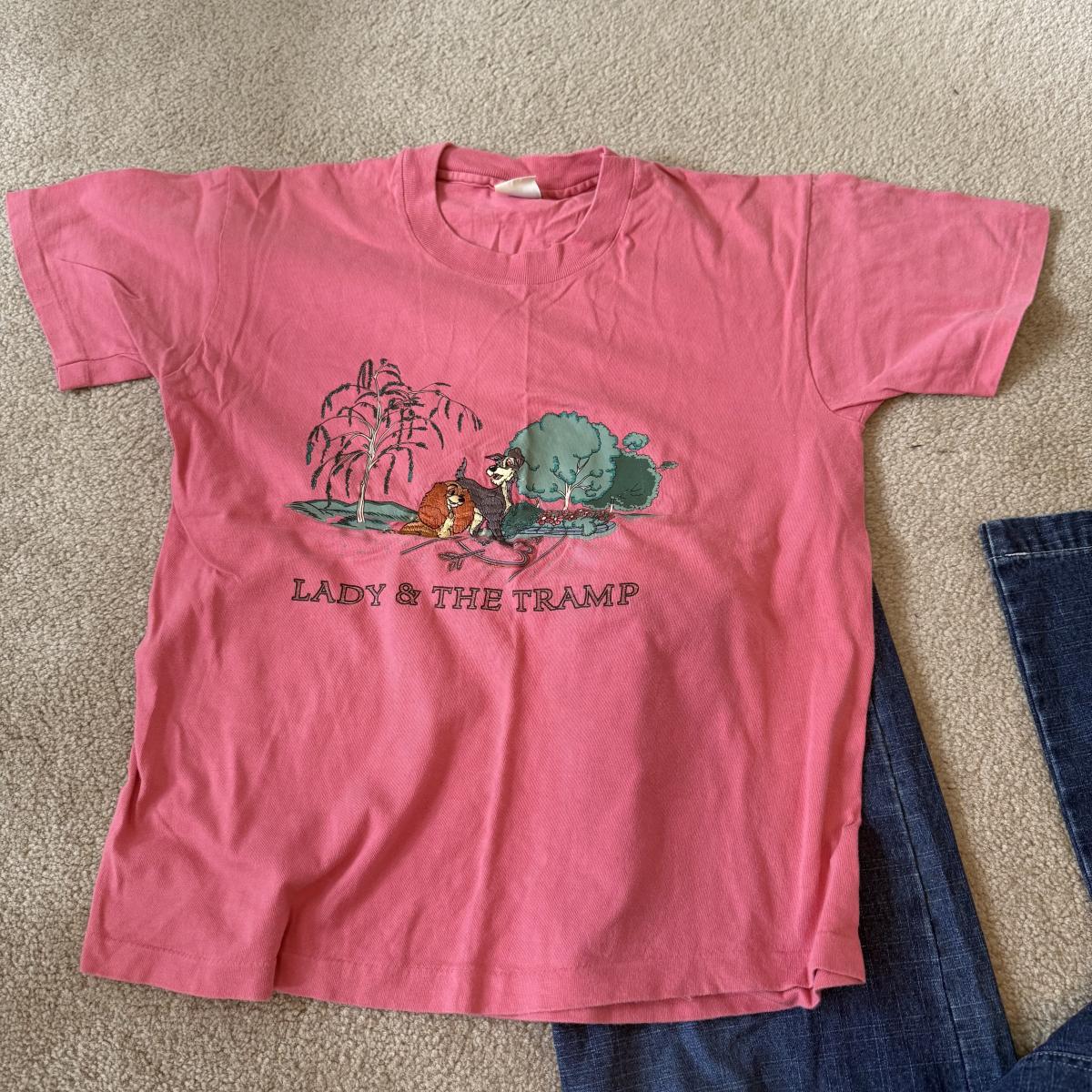 LOT 172A: NWT Disney Embroidered Mickey & Minnie Denim Overalls (Medium), WDW Sleepwear Embroidered Minnie Hula T-Shirt (Small) & Lady and the Tramp Pink T-Shirt