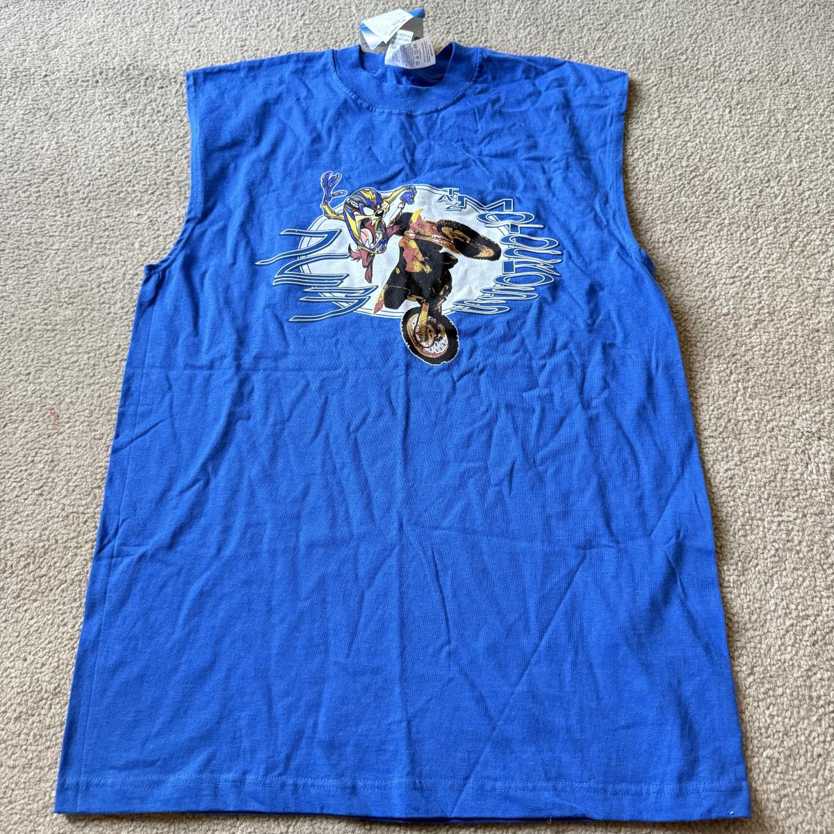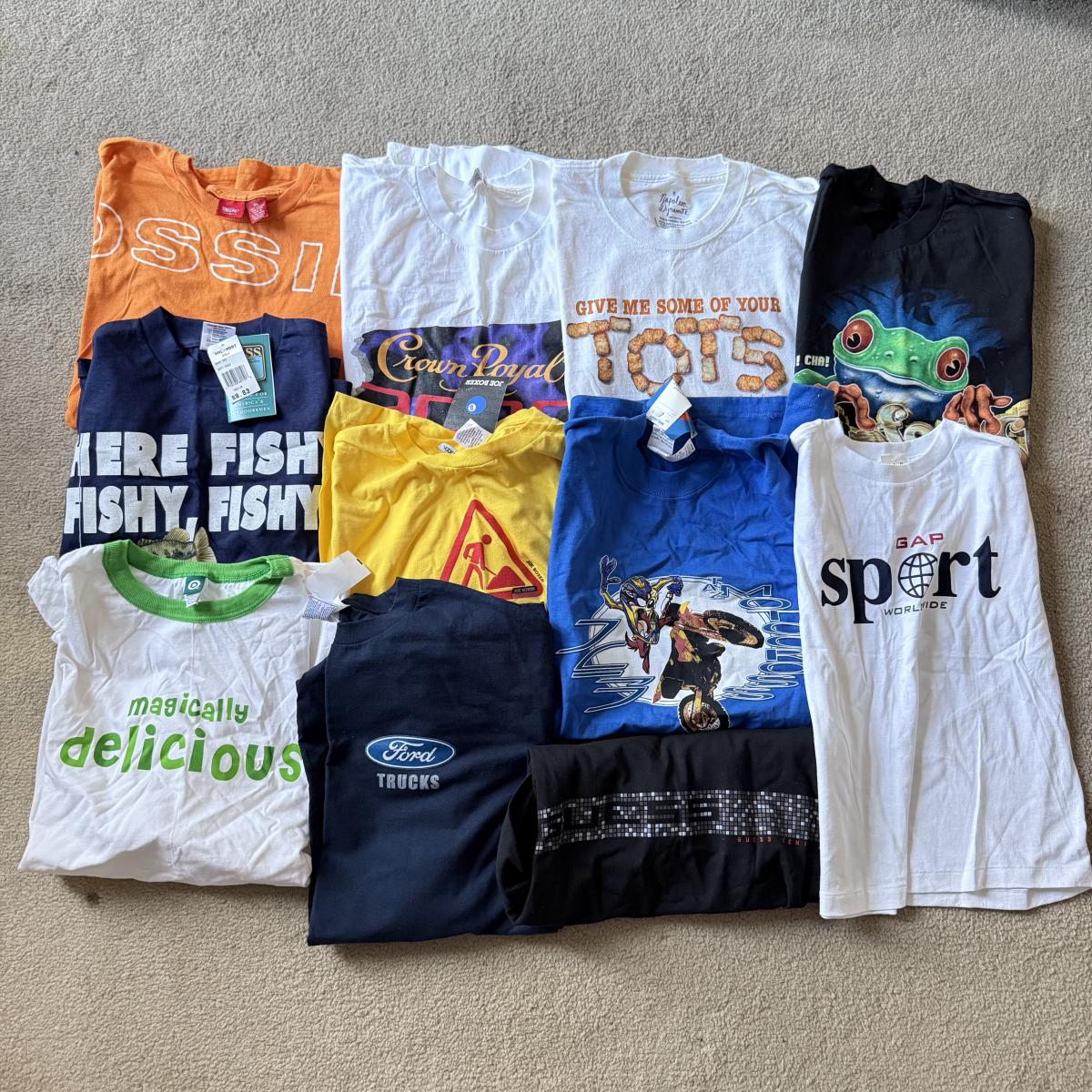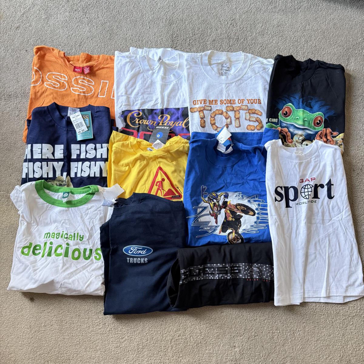 LOT 214A: T-Shirts, Some NWT: Guess, Napoleon Dynamite, Crown Royal 2000, Looney Tunes Tasmanian Devil Motocross Tank (M), Bass Fishing, Rainforest Cafe Orlando, Ford Trucks & More