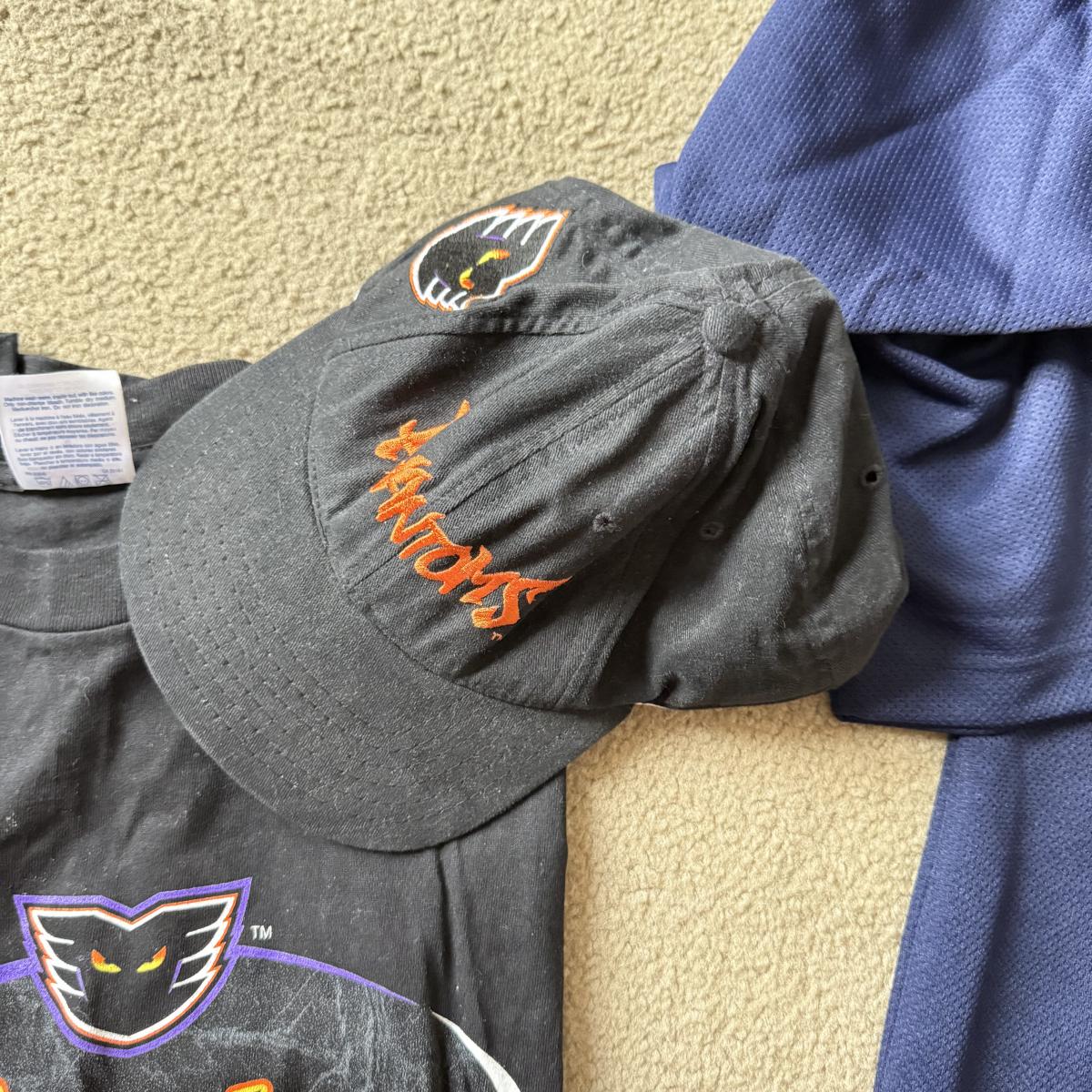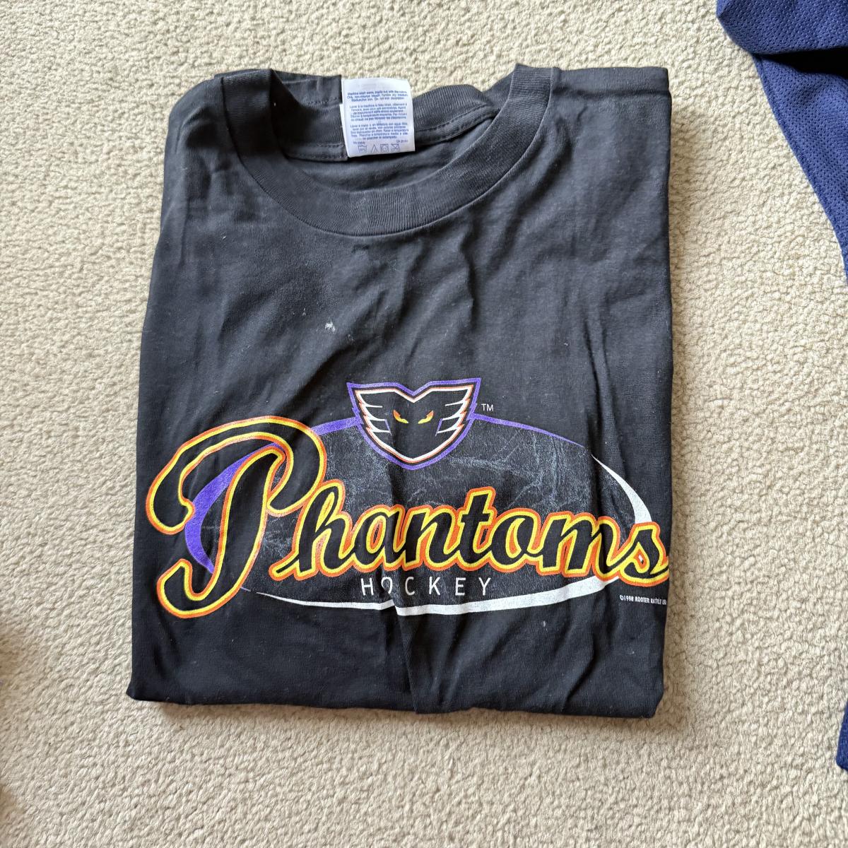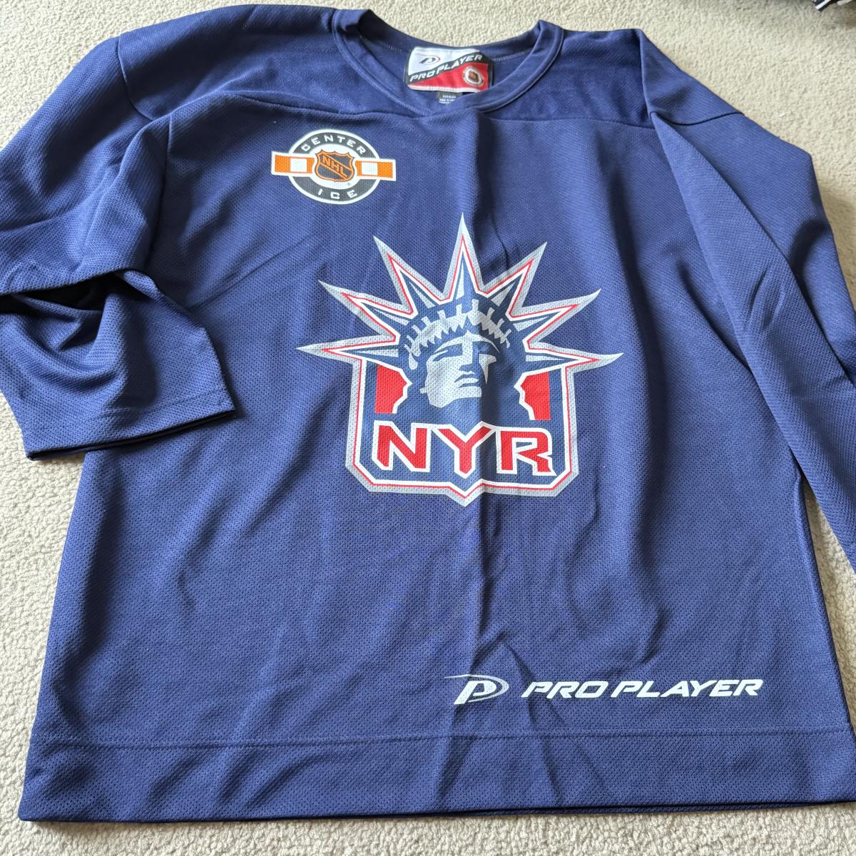 LOT 215A: Hockey Clothing: NHL NJ Devils Long Sleeve, Center Ice New York Rangers Pro Player Shirt (M), Logo Athletic NY Rangers Color Block V Neck (M), Philadelphia Phantoms Hat & T-Shirt (L)
