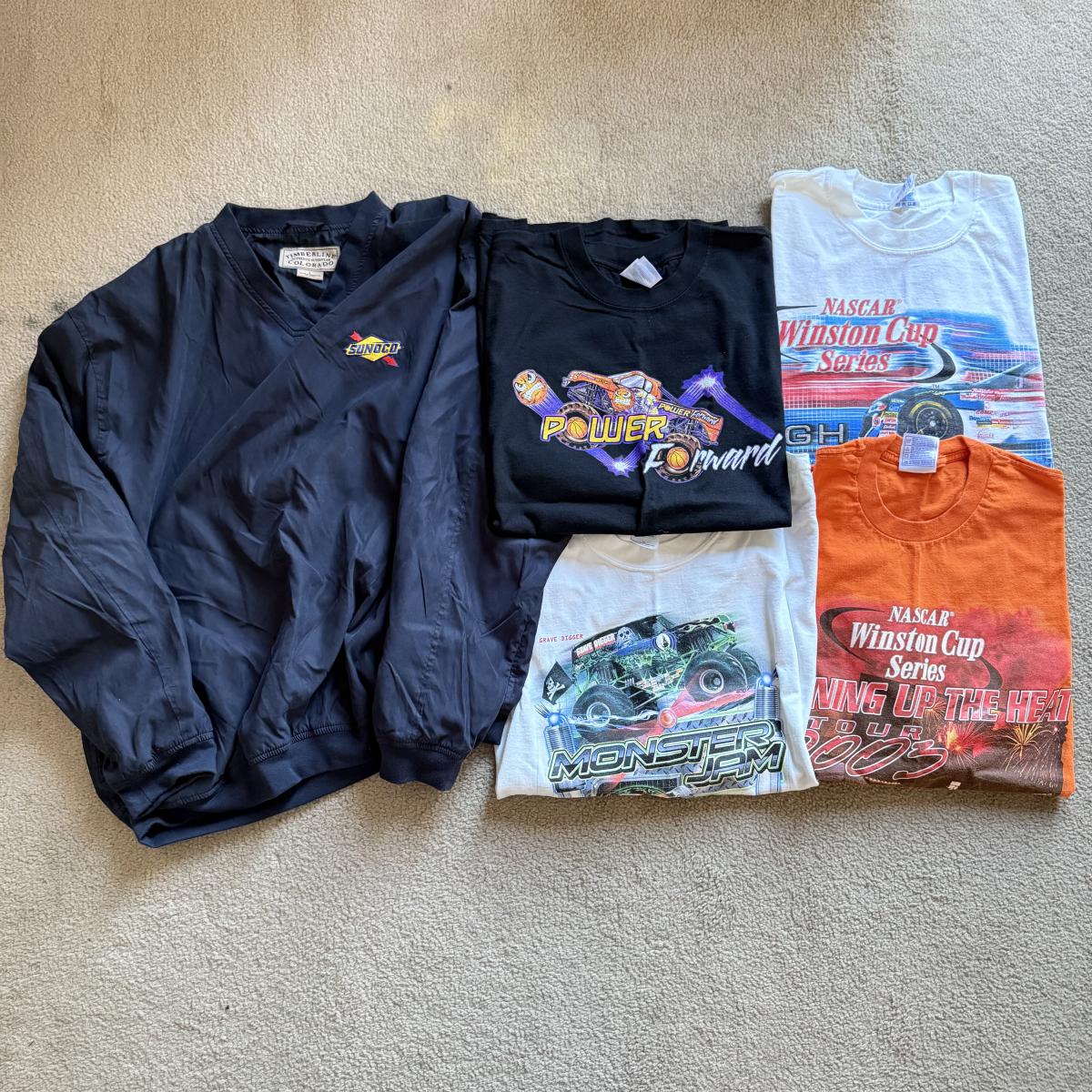 LOT 219B: Automotive / Racing Clothing: Embroidered Sunoco Long Sleeve (L), 2003 NASCAR Tour T-Shirts (XL), Monster Jam T-Shirt (XL) & More