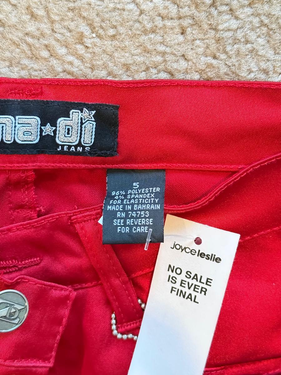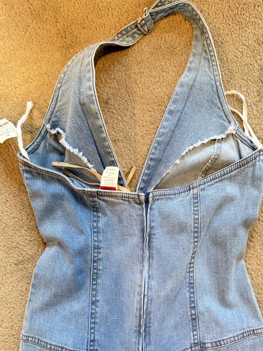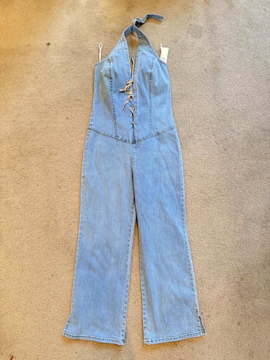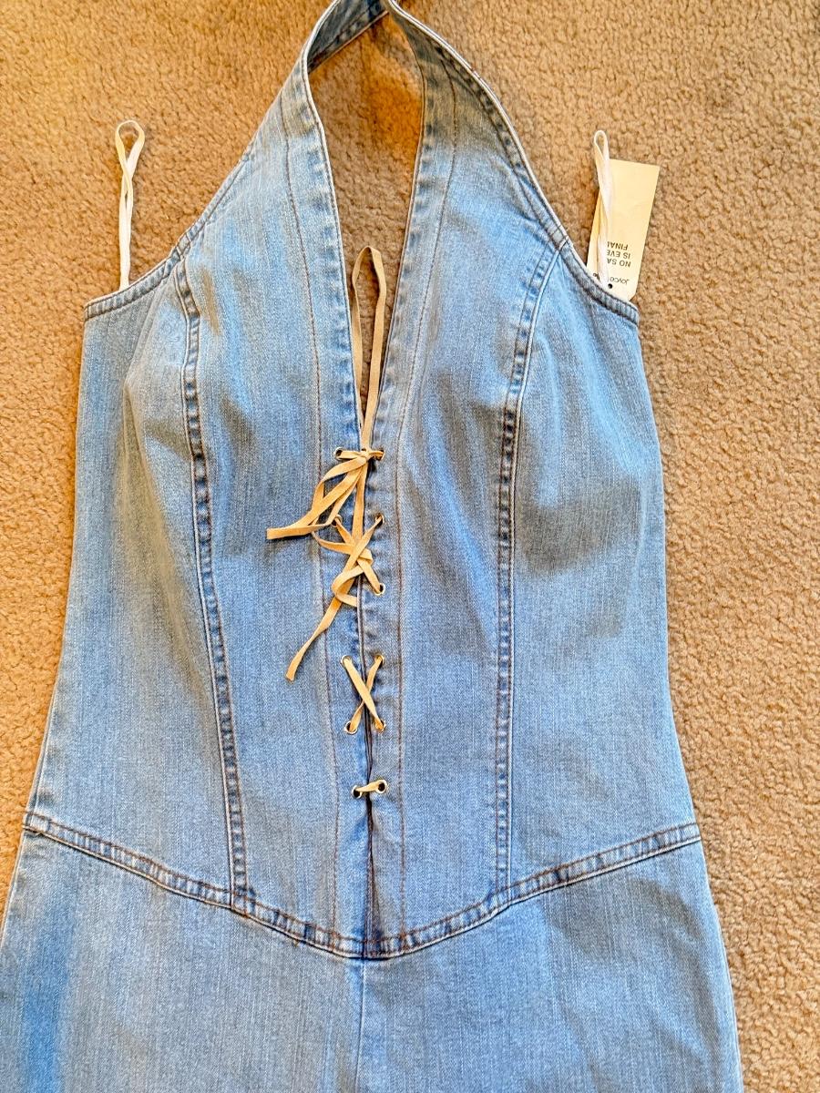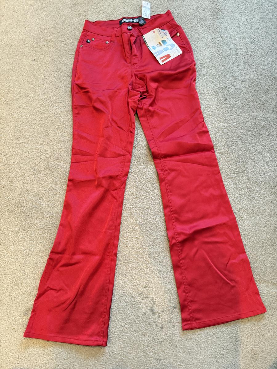 LOT 247B: NWT: Juniors Size L Denim Halter Jumpsuit, Authentic Collection Stretch Lei Jeans, Rave Flare Pants, Brown XOXO Pants, Red Zana-di Jeans