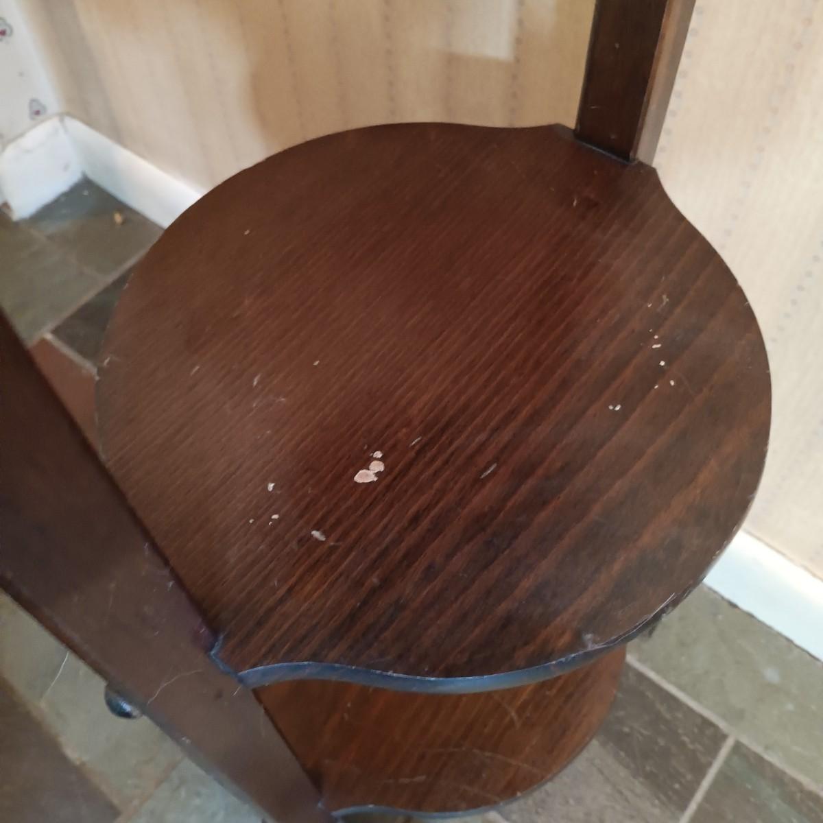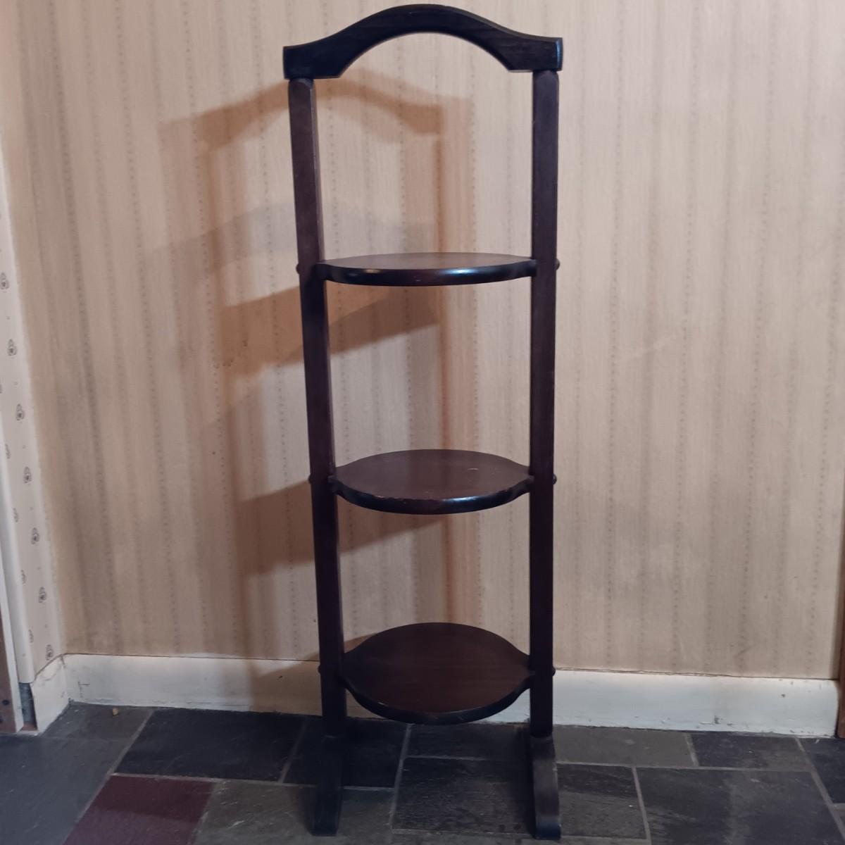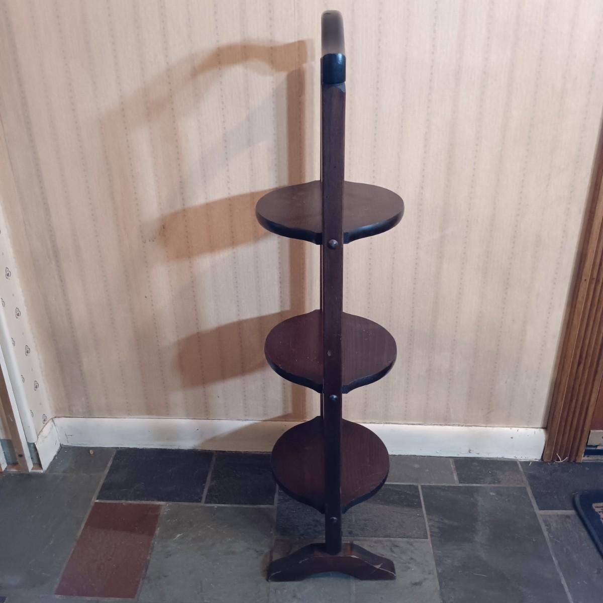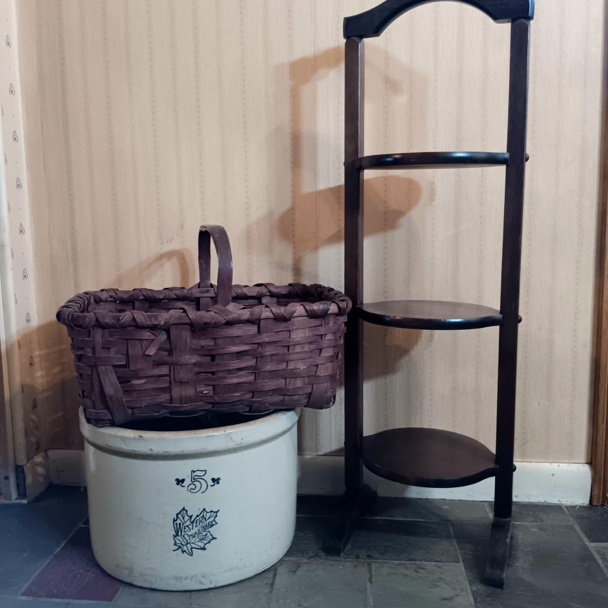 LOT 253: Western Stoneware 5-Gallon Crock, 3-Tier Table & Splint Weave Basket
