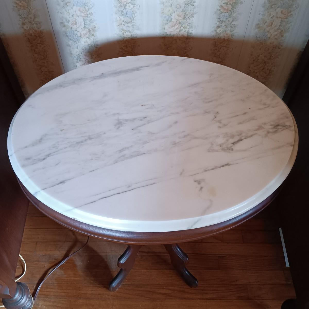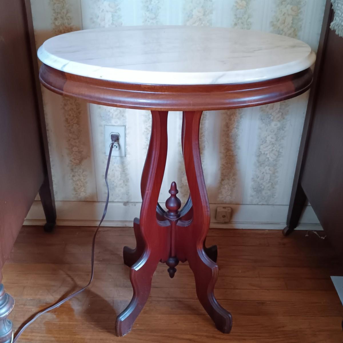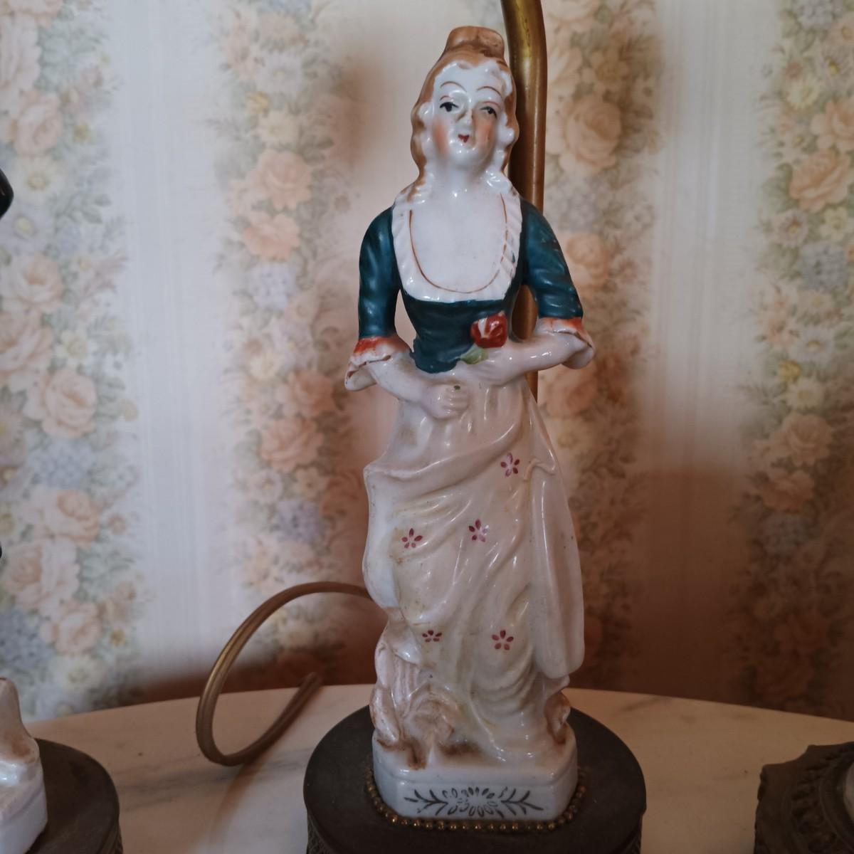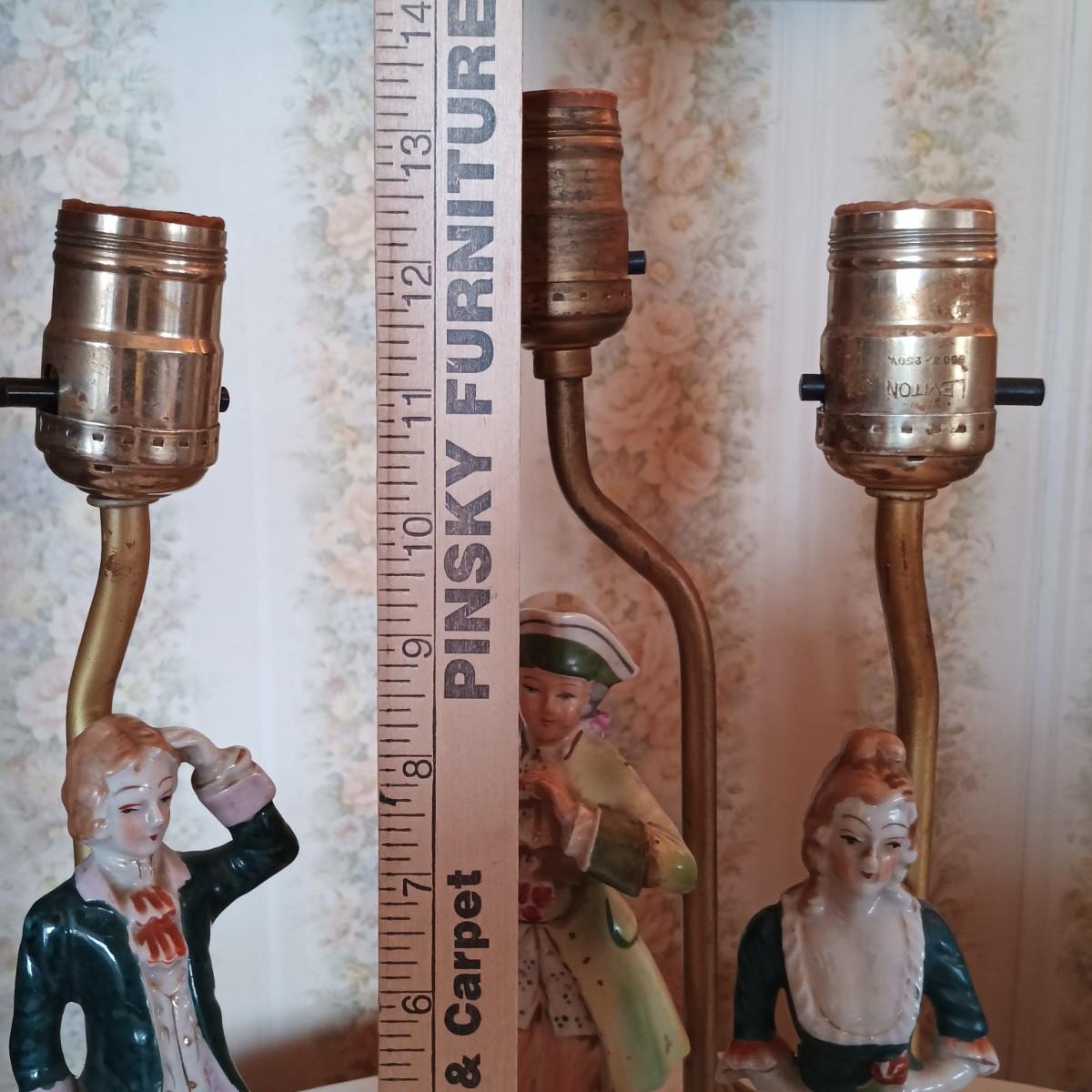 LOT 264: Victorian Marble-Top Pedestal Table w/ Set of (3) Porcelain Figurine Lamps