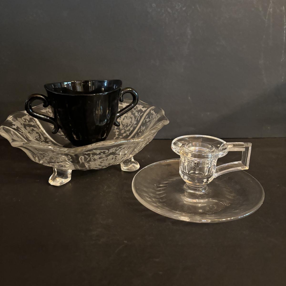 LOT 272: Elegant Crystal Collection: Waterford, Lenox, Atlas Blue Swirl Glass Serving Bowl, Water Goblets w/Black Glass Base, Black Glass Sugar Bowl & More