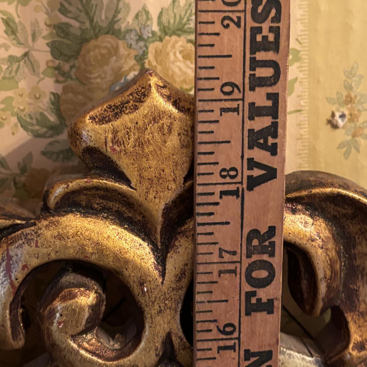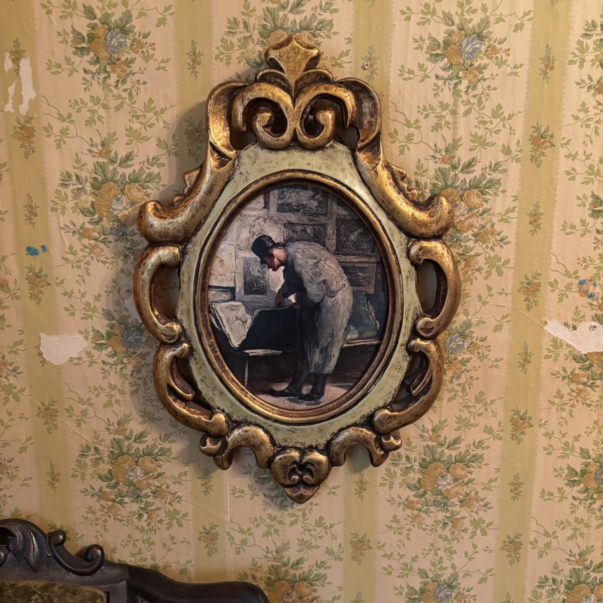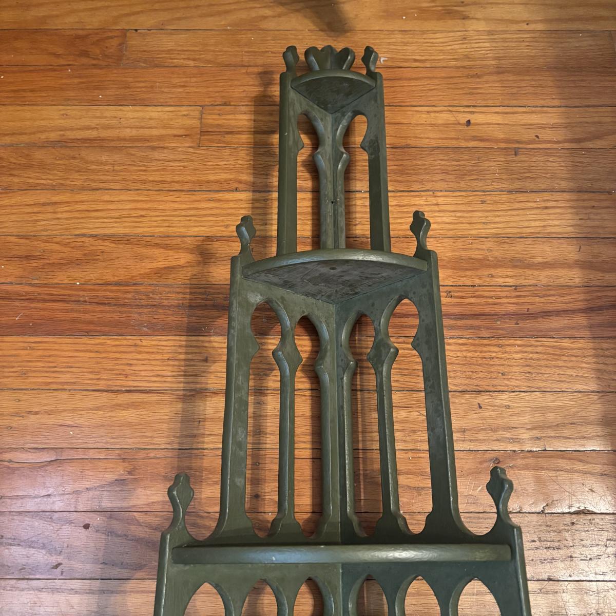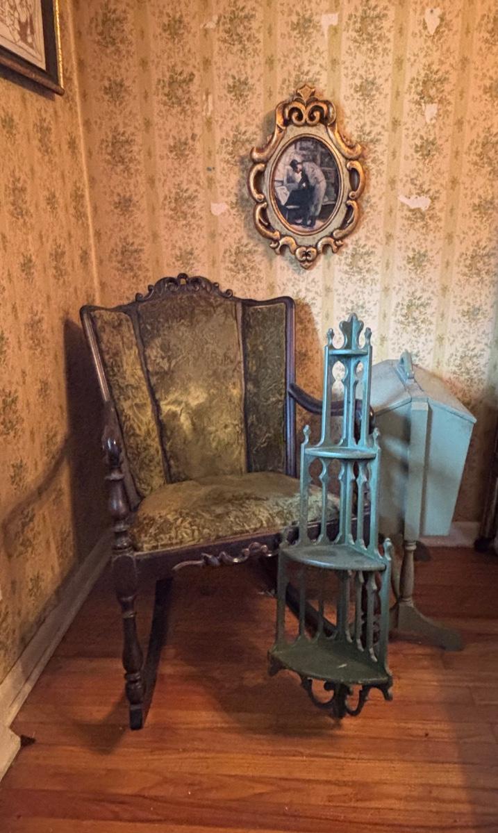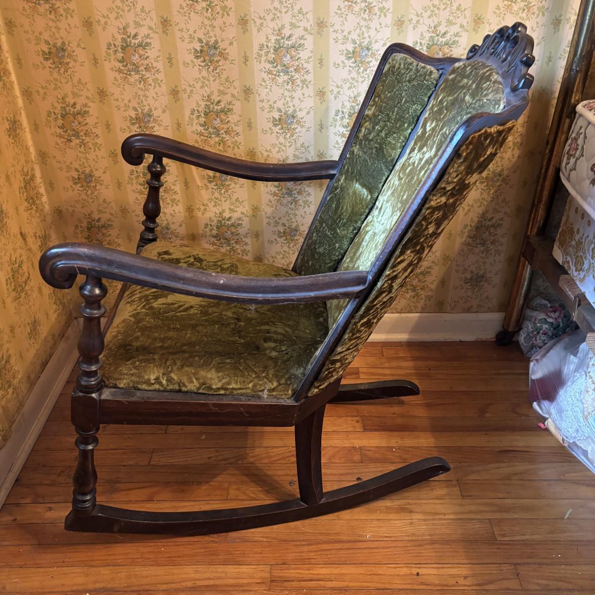 LOT 277: Vintage Green Velvet Upholstered J.B. Van Scriver Co., Rocking Chair, Painted Sewing Box & Victorian Corner Shelf & Gold Framed Wall Art