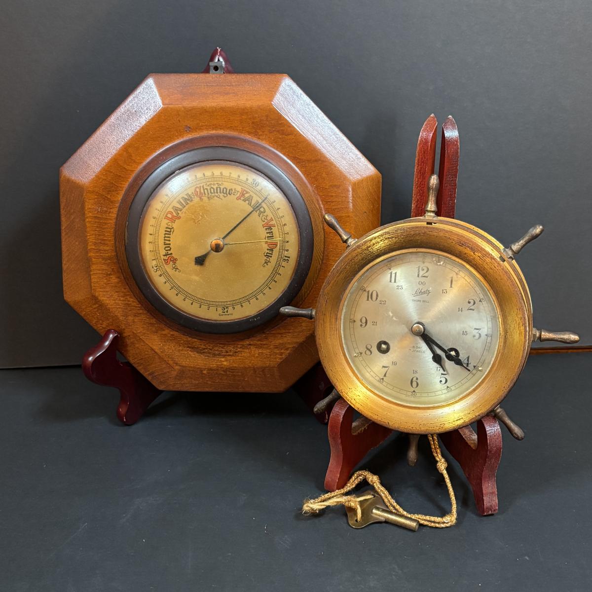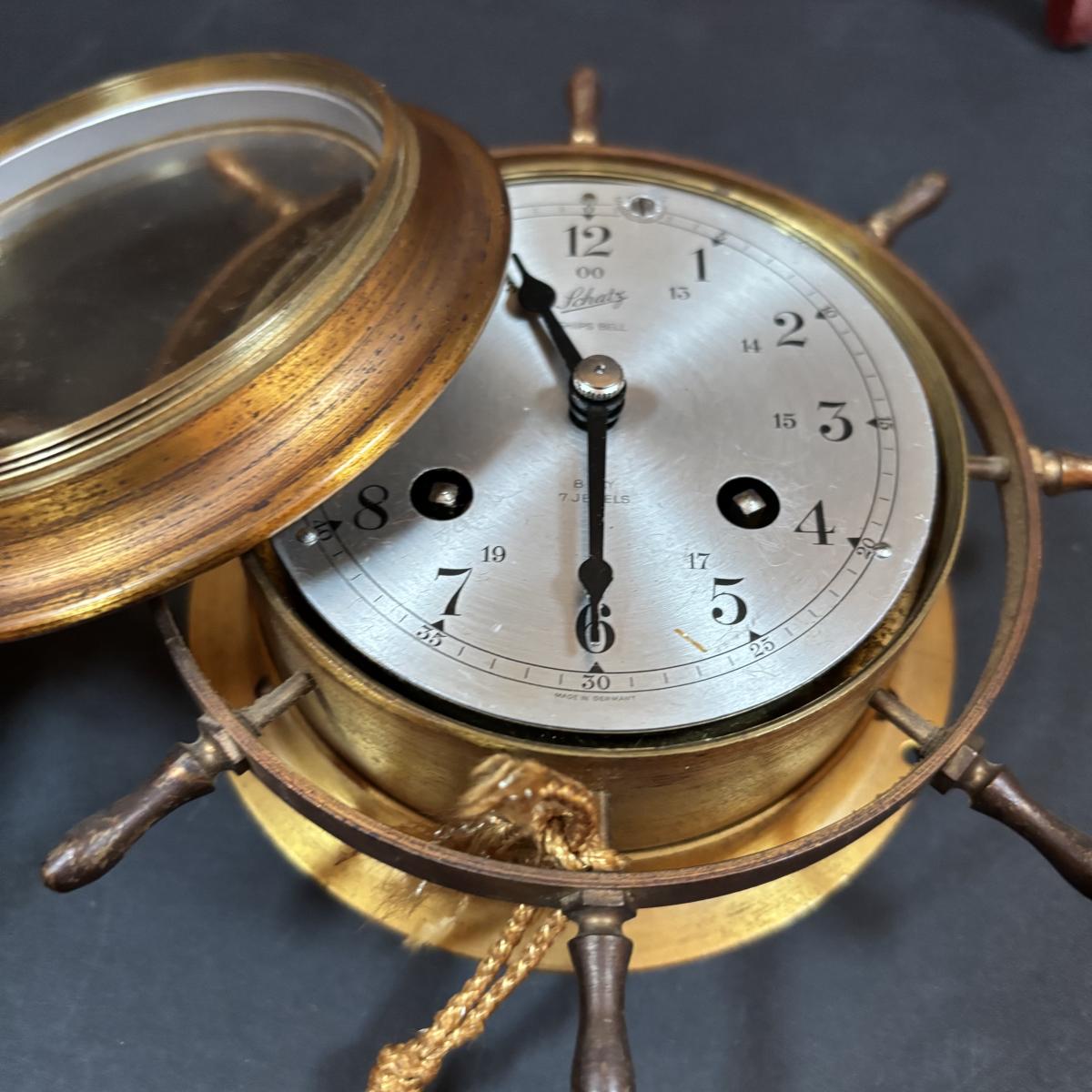 LOT 285: Vintage Made in Germany Schatz 8 Day-14Jewel Ships Bell Clock w/Key & Barometer