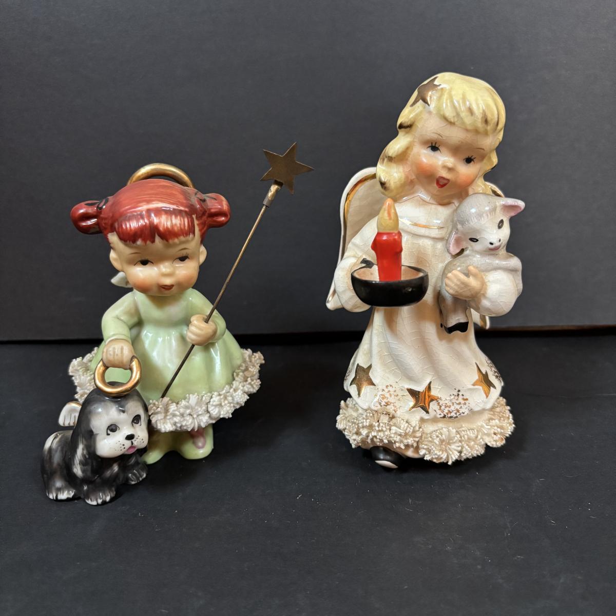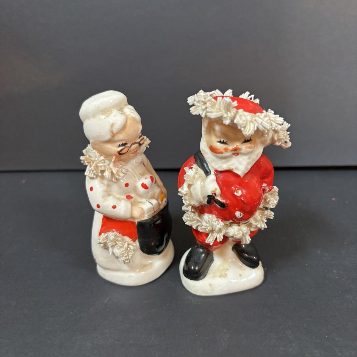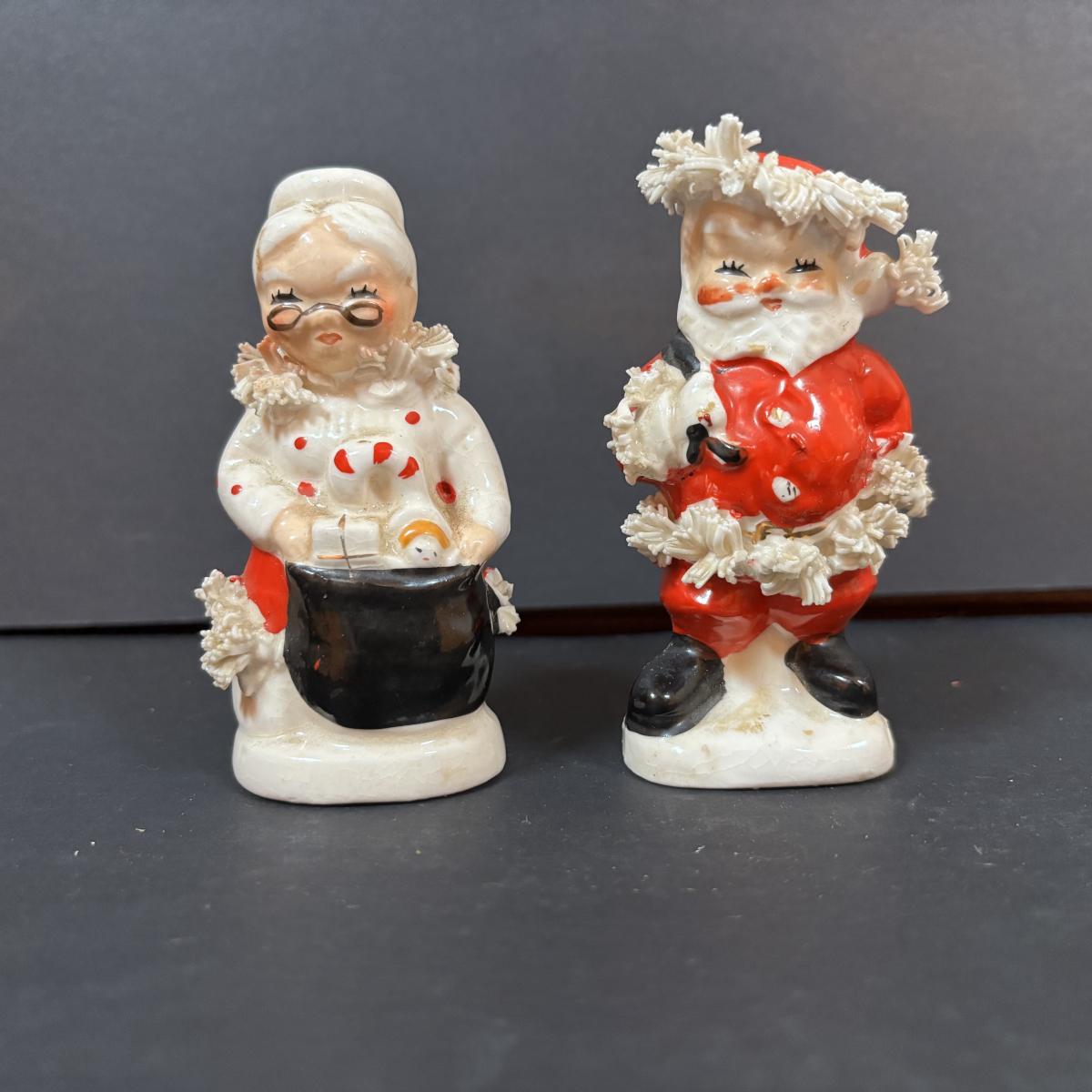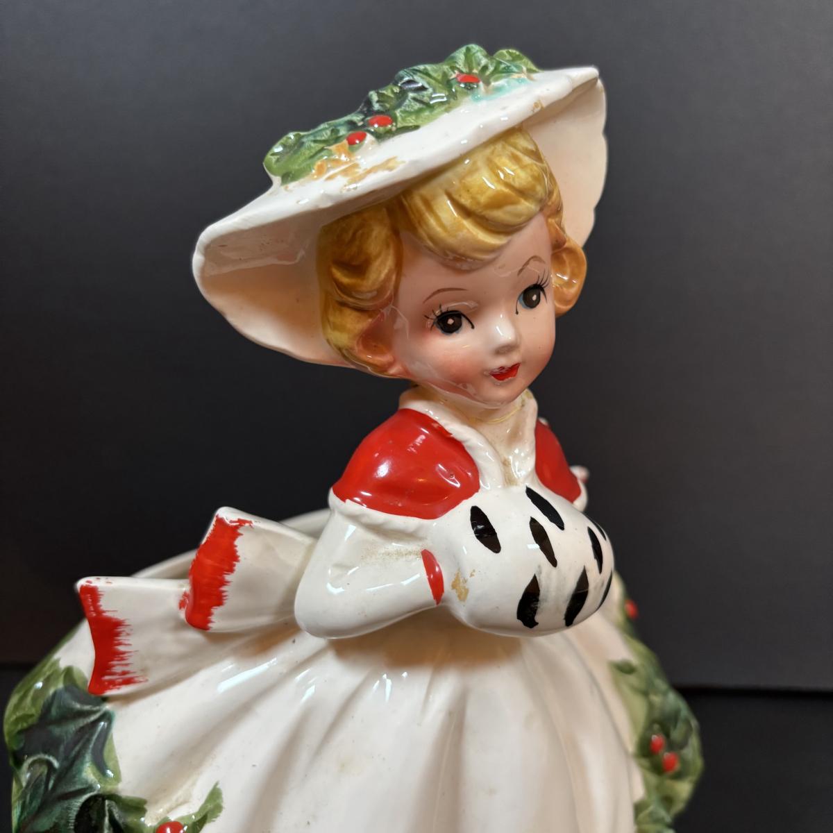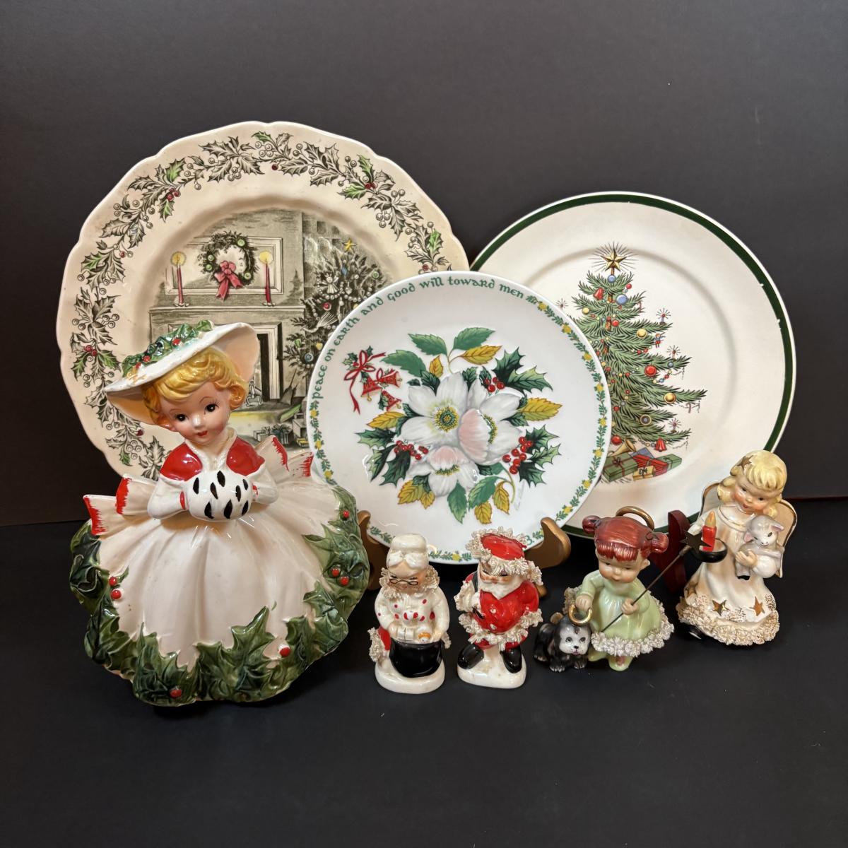 LOT 286: Vintage Relpo Christmas Holly Girl Figurine Planter, Angel Figurines, Spaghetti Santa & Mrs. Claus Salt/Pepper Shakers, Holiday Plates: Johnson Bros. Crown Staffordshire & Cuthbertson House