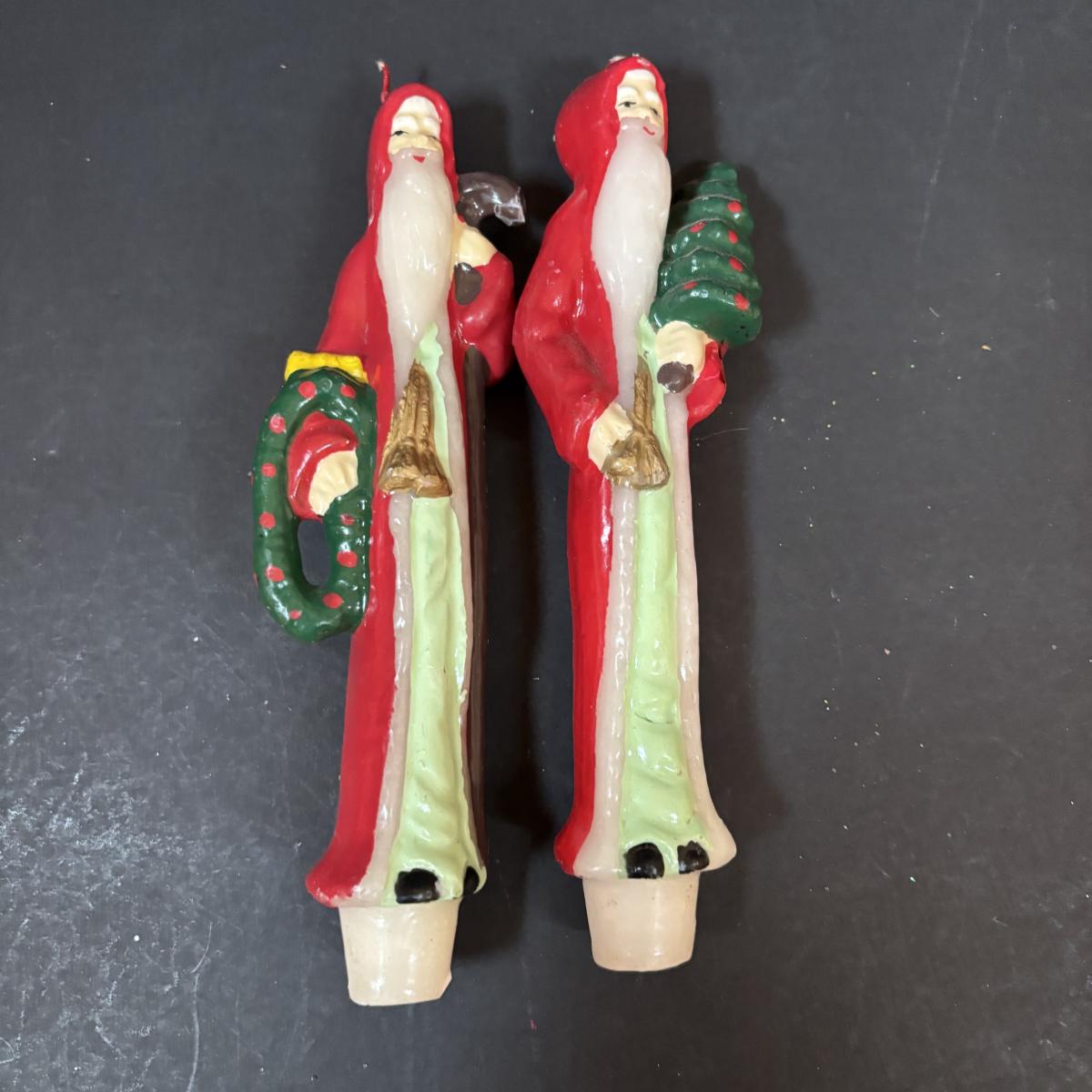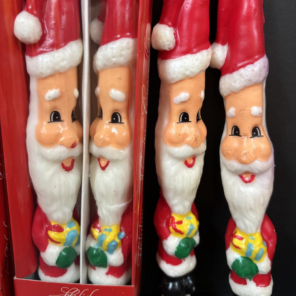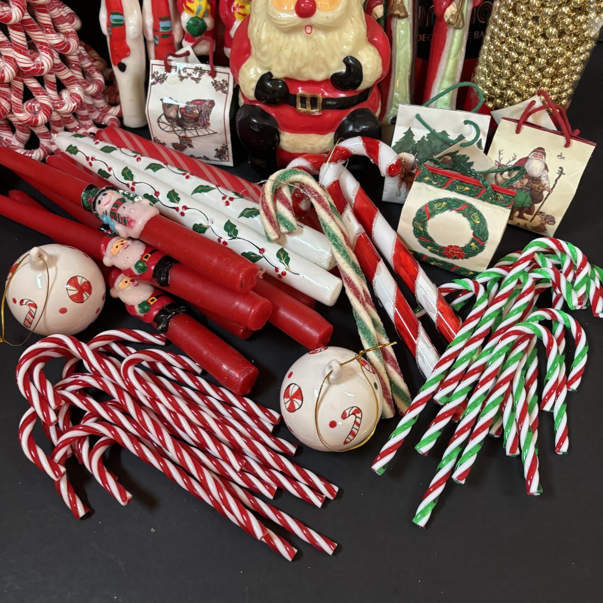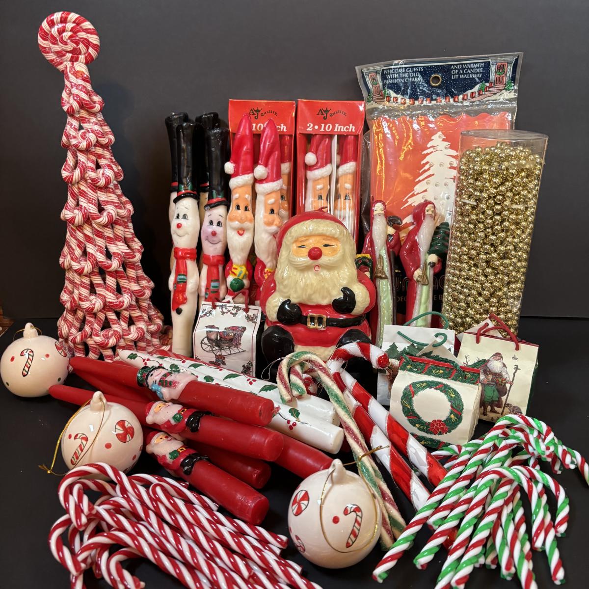 LOT 290: Holiday Candle Collection & More: Santa & Snowman Tapered Candles,Gift Bag Music Boxes, Gold Bead Garland, Peppermint Christmas, Candy Cane Ornaments