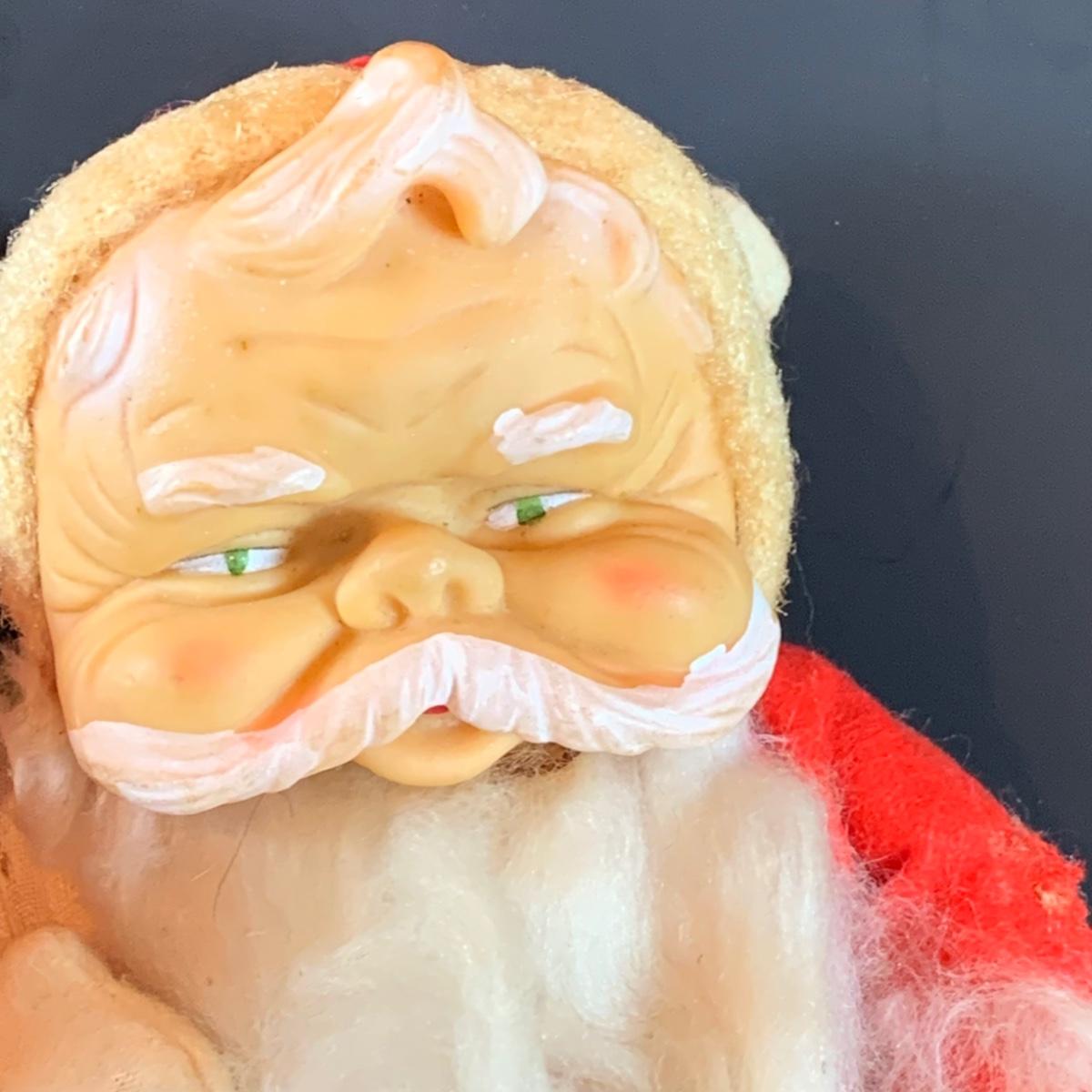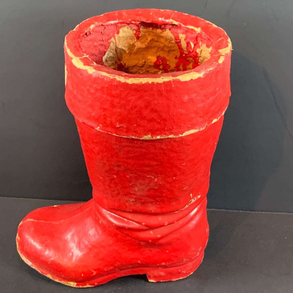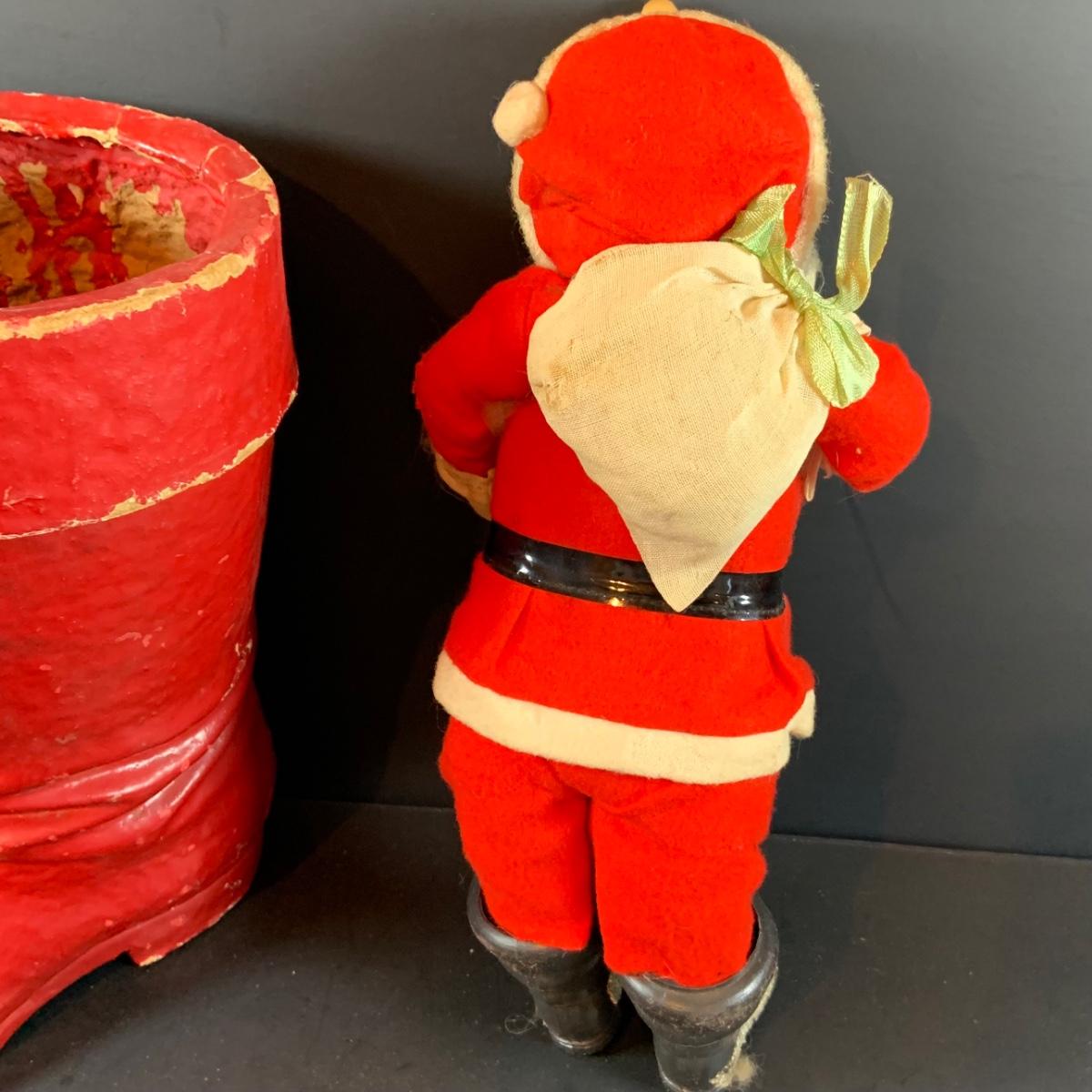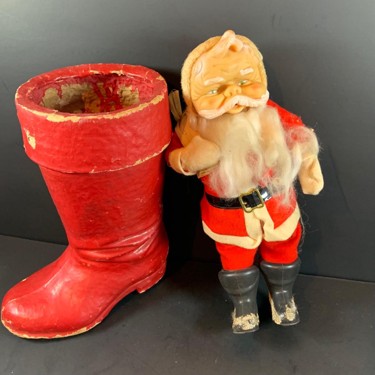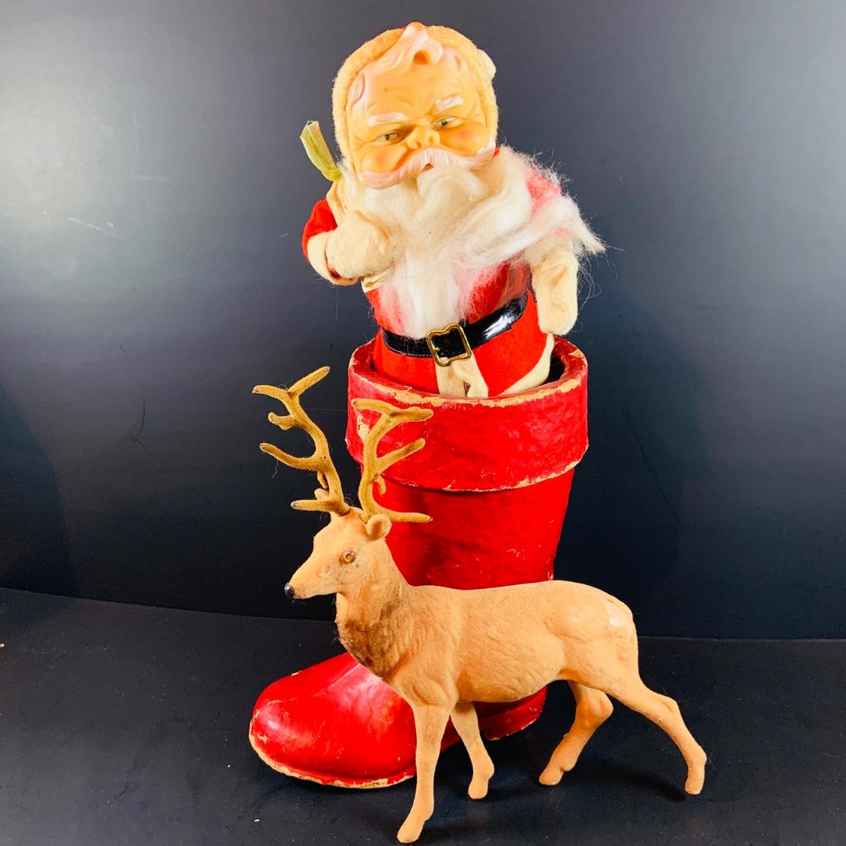 LOT 322: Vintage Santa Claus, Vintage Red Santa Boot Container and a Vintage Flocked Reindeer